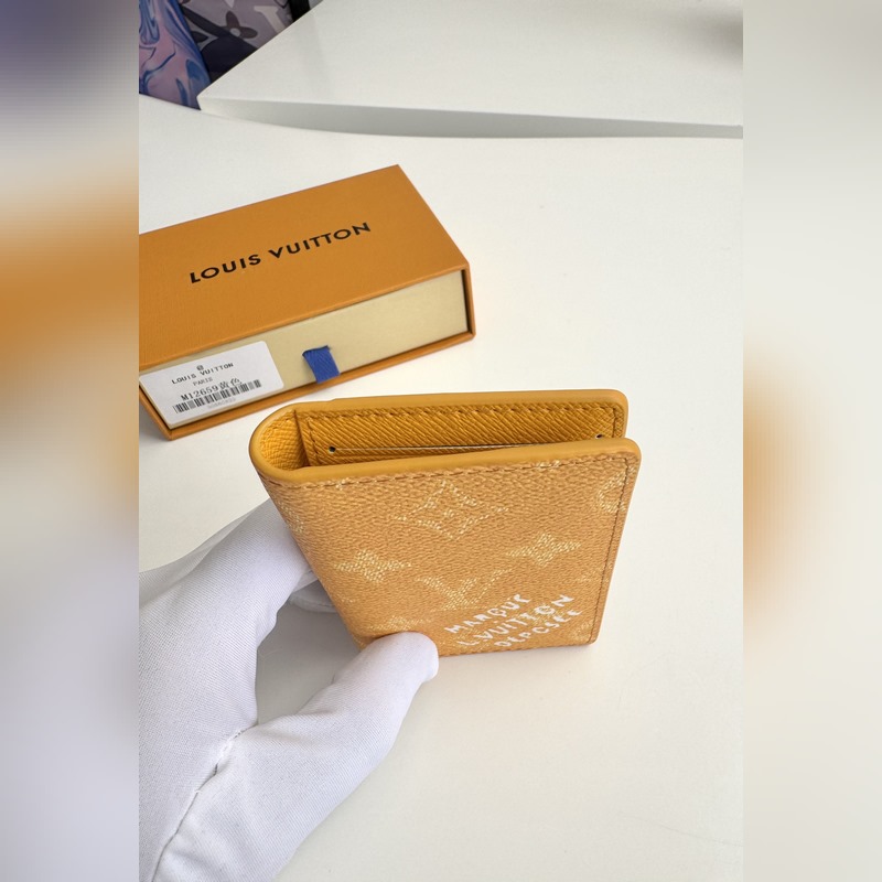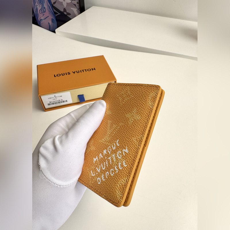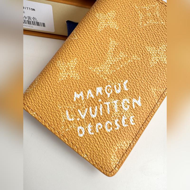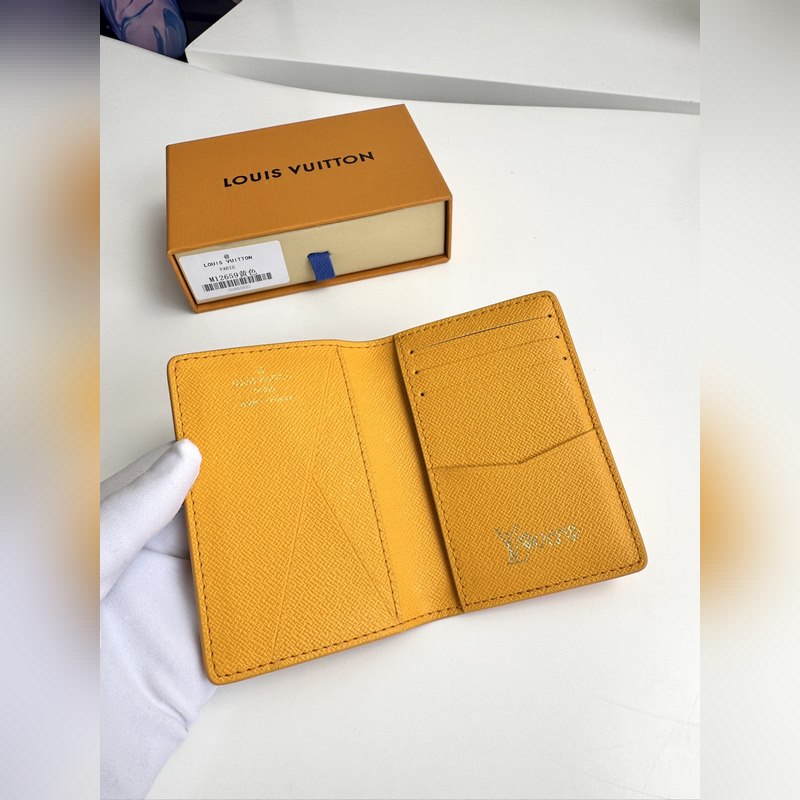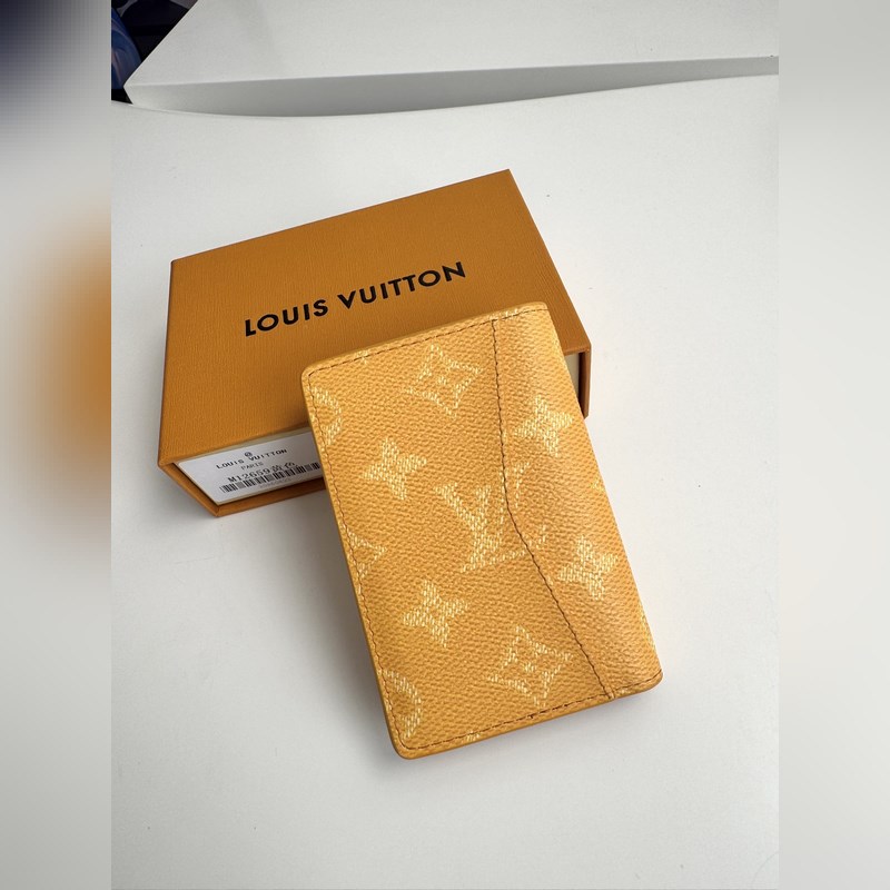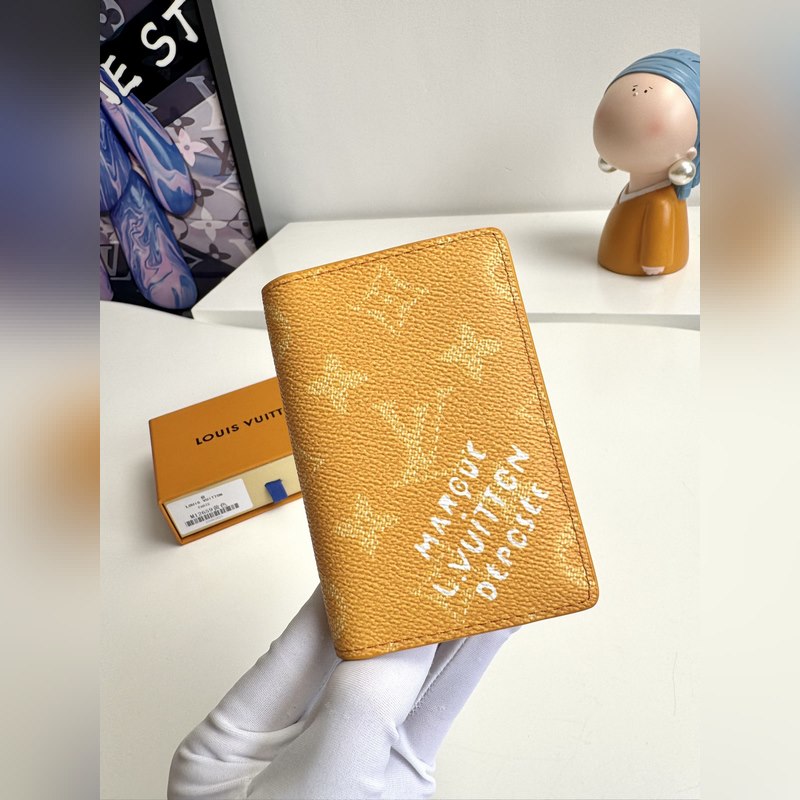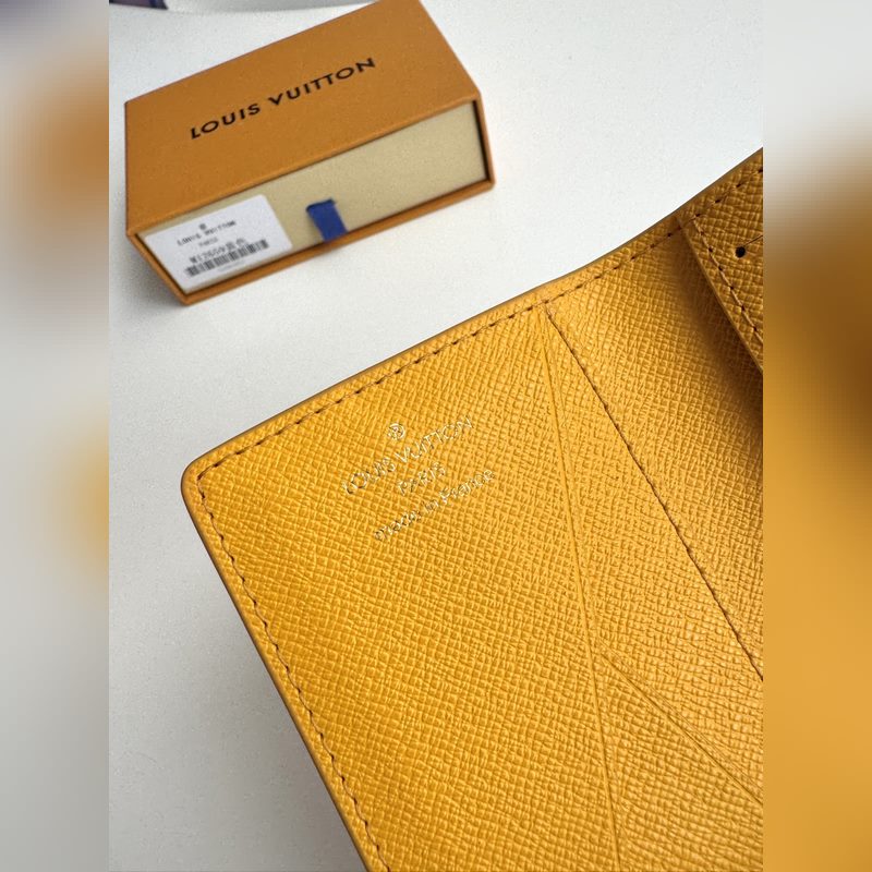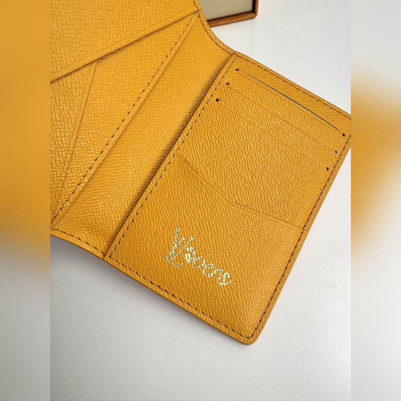Overseas original M12659 yellow exclusive real shot This pocket wallet uses Monogram Heritage coated canvas, which incorporates classic elements such as the vertical and horizontal texture of the Damier check and the Marque L.Vuitton Déposée logo, showing Pharrell Williams’ modern interpretation of the Monogram pattern. Size: 11×7.5×1cm