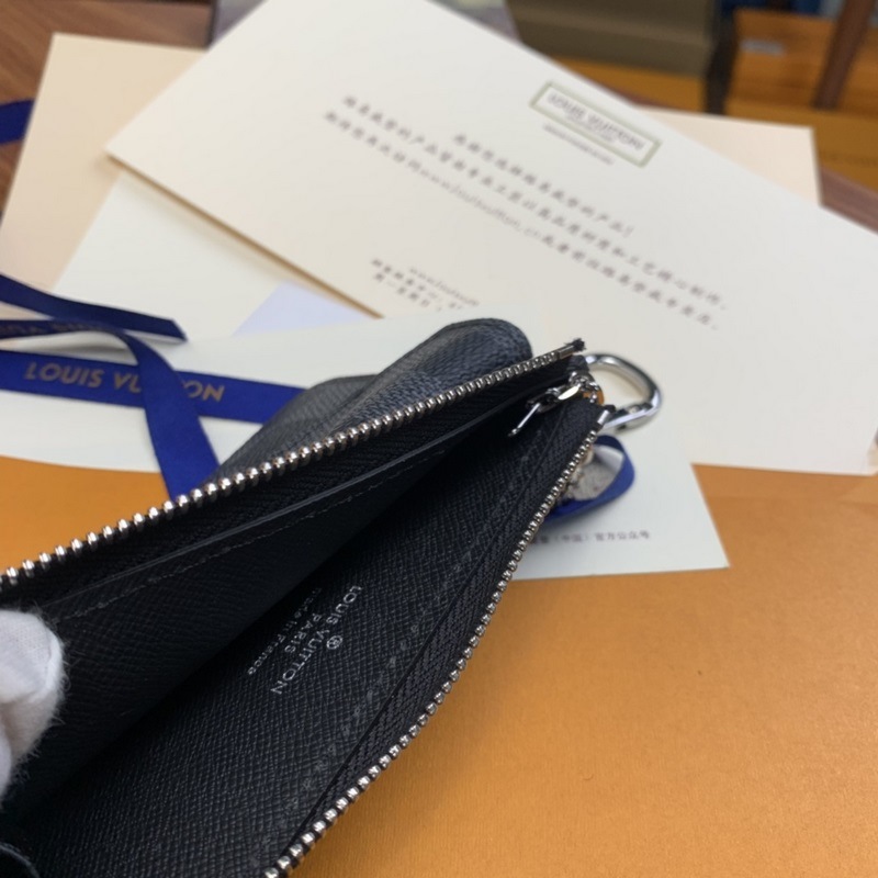 The Recto Verso card holder is made of classic Monogram canvas with neat leather trims. It opens the coin compartment with an L-shaped wide zipper, an envelope-style front pocket, a central pocket for folded banknotes, and a rear card slot. It can also be fixed to a handbag or belt with a hook.