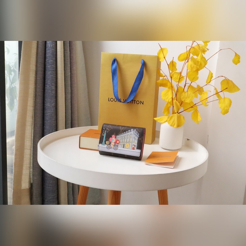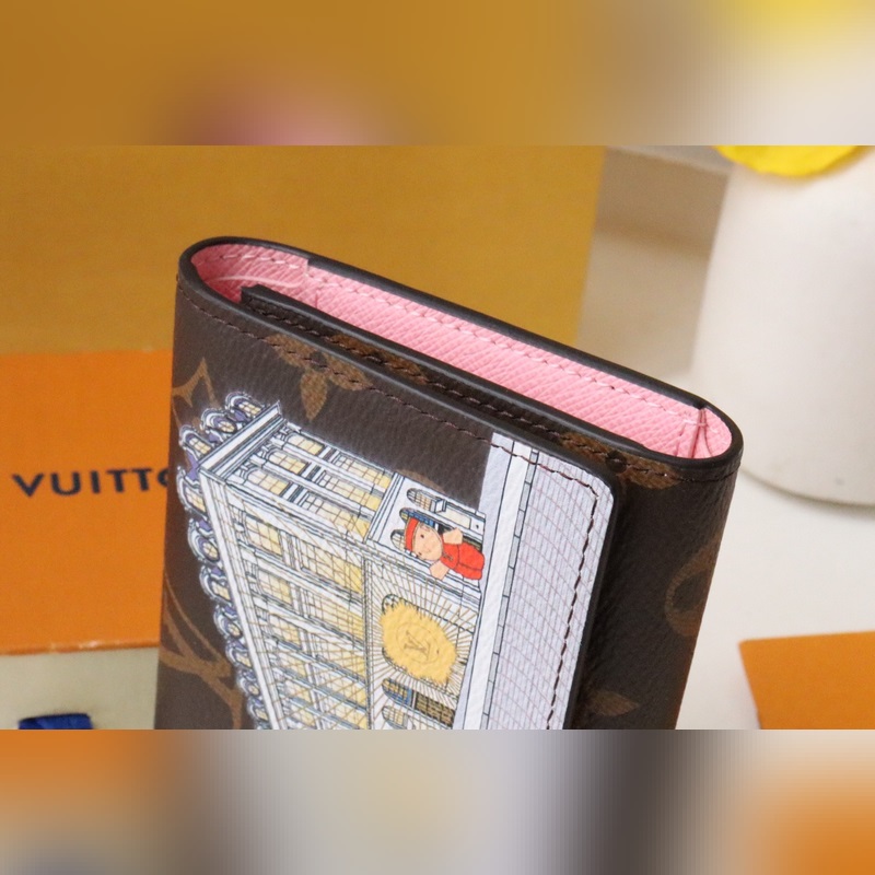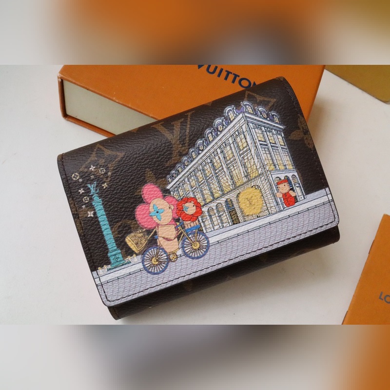 From the 2022 collection, the mascot Vivienne is depicted riding a bicycle past the columns of Place Vendôme and then the Louis Vuitton boutique in Paris, making it a humorous choice for brand collectors. The foldable design is made of canvas and has a leather lining. 12 x 9.5 x 1.5 cm