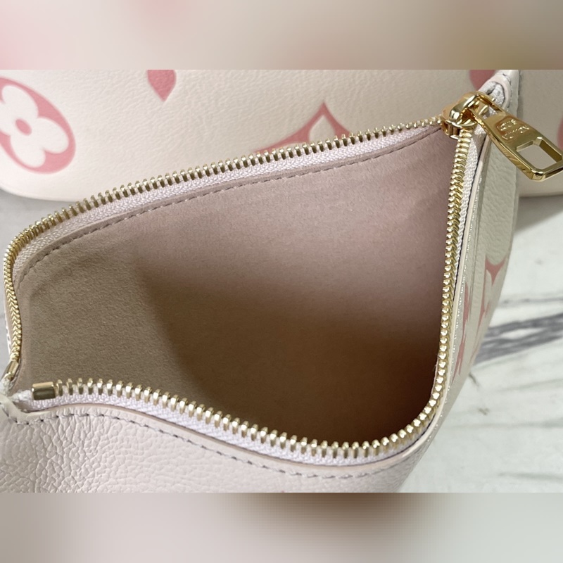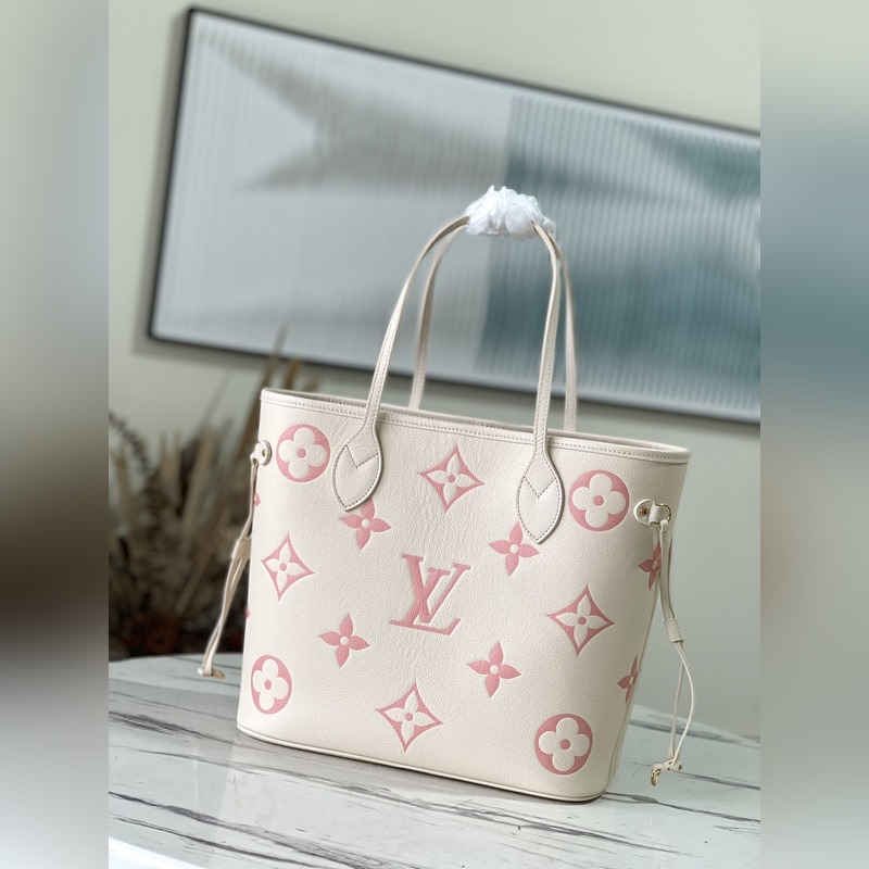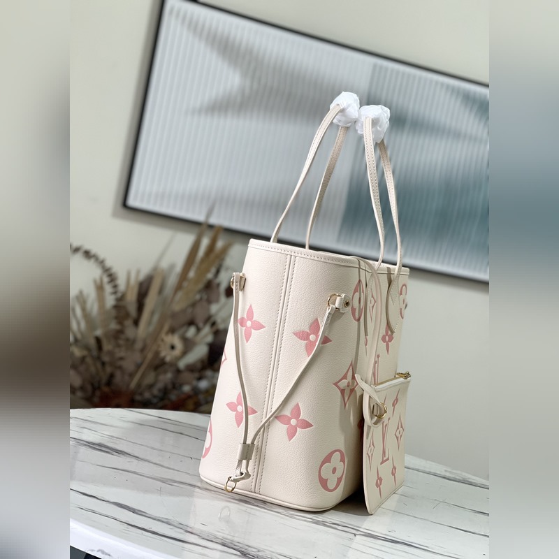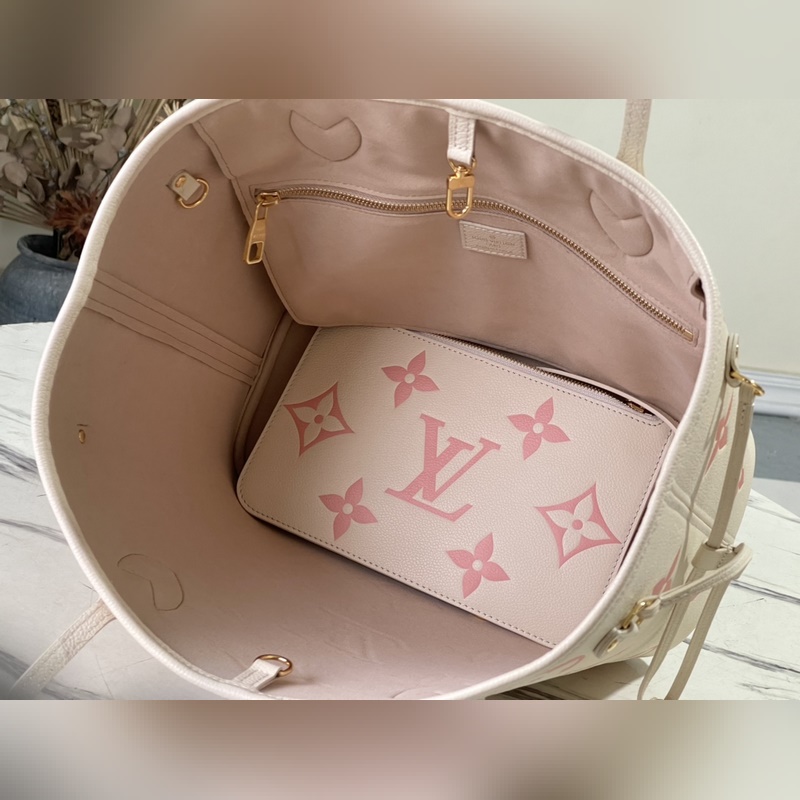 Top original M45686 Cream White and Pink Silkscreen Neverfull Medium Shopping Bag The redesigned inner bag features a fresh fabric lining and vintage details inspired by the Louis Vuitton archives. The most noteworthy feature is the detachable zipper clutch, which can be used as a delicate clutch or as an additional pocket. Size: 32x29x17cm