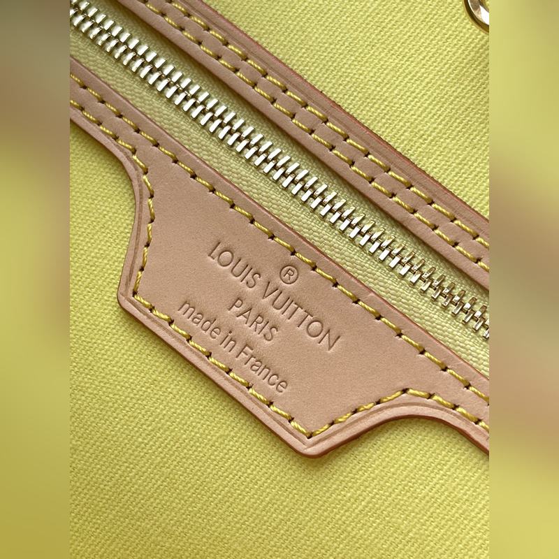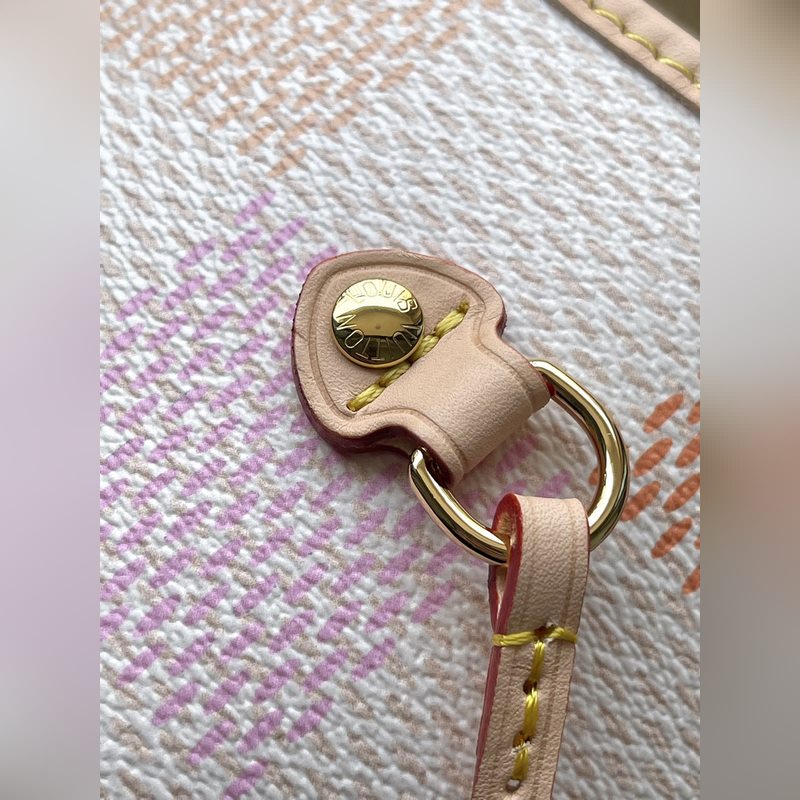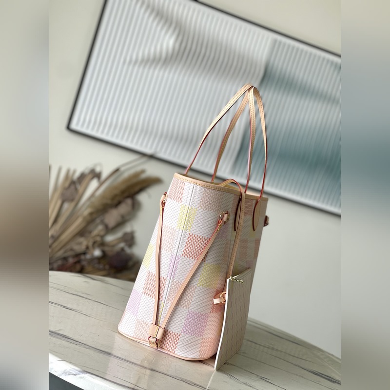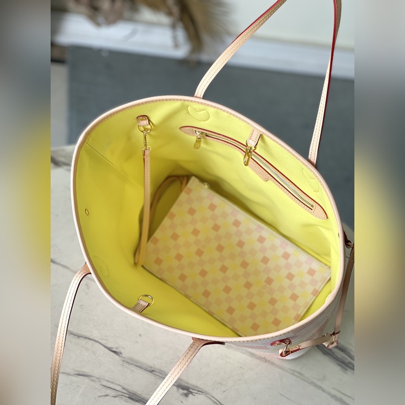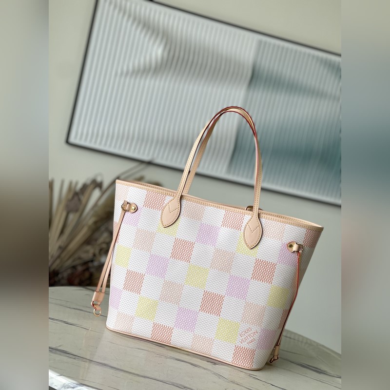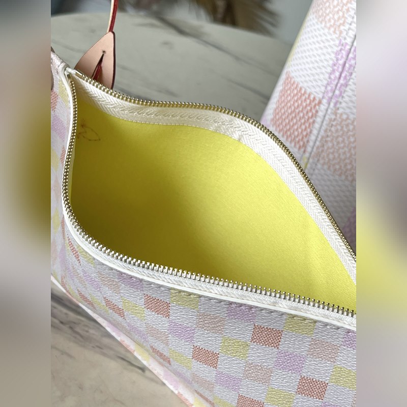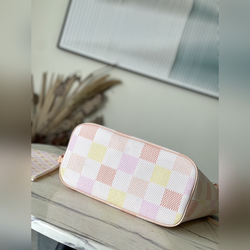 LV N40668 This Neverfull medium bag is made of Damier Giant canvas dyed in pastel tones, with a removable zippered coin pocket in the same material. The side straps can be loosened to transform the compact structure into a casual tote bag. Dimensions: 31 × 28 × 14 cm