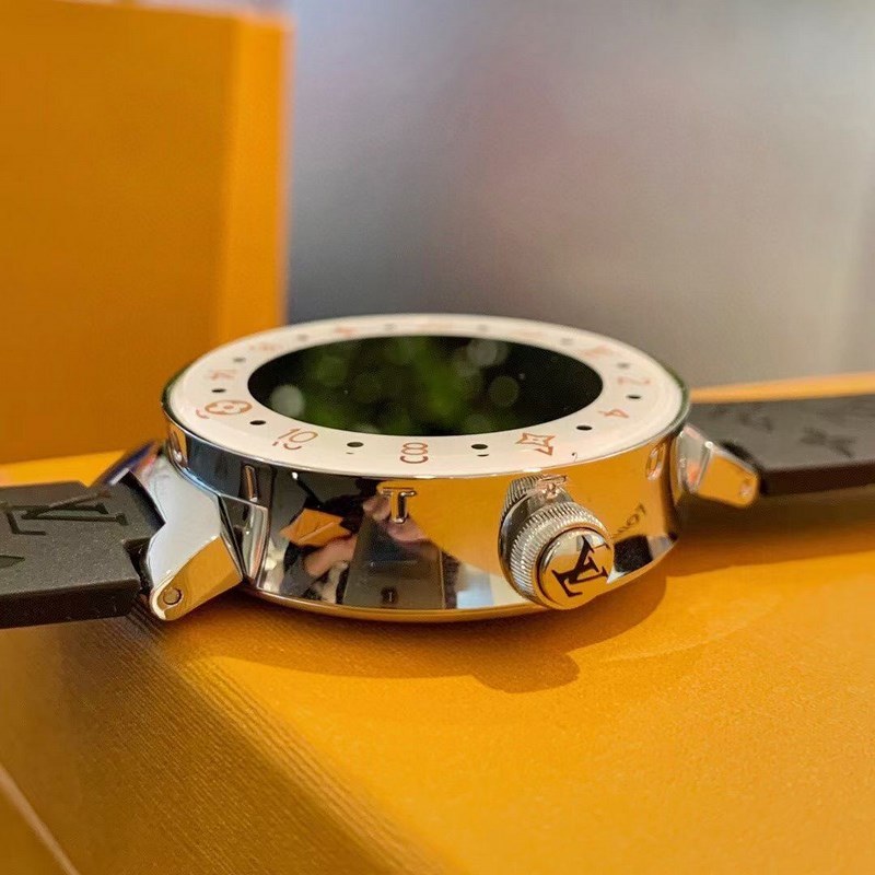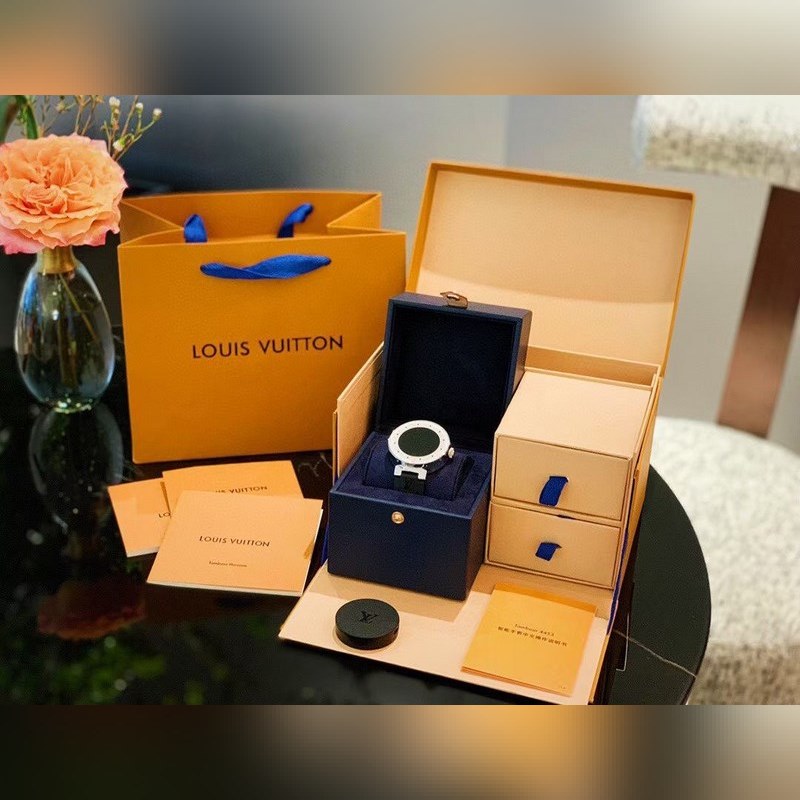 Full set of counter packaging Including instruction manual and charger The new Tambour Horizon smart watch combines Louis Vuitton’s travel spirit, exquisite craftsmanship and innovative ideas to bring a unique interconnected experience. It not only meets the various needs of travel and daily life, but also highlights personal style and temperament. Design Stainless steel polished case Case diameter: 42 mm Case thickness: 12.6 mm Case back: Black sapphire glass with engraved LV logo in steel Technical features Rotatable functional crown 1.2-inch round AMOLED full touchscreen with a resolution of 390 x 390 (327 ppi)