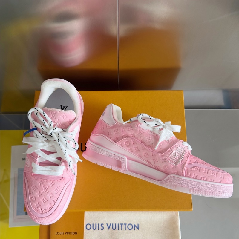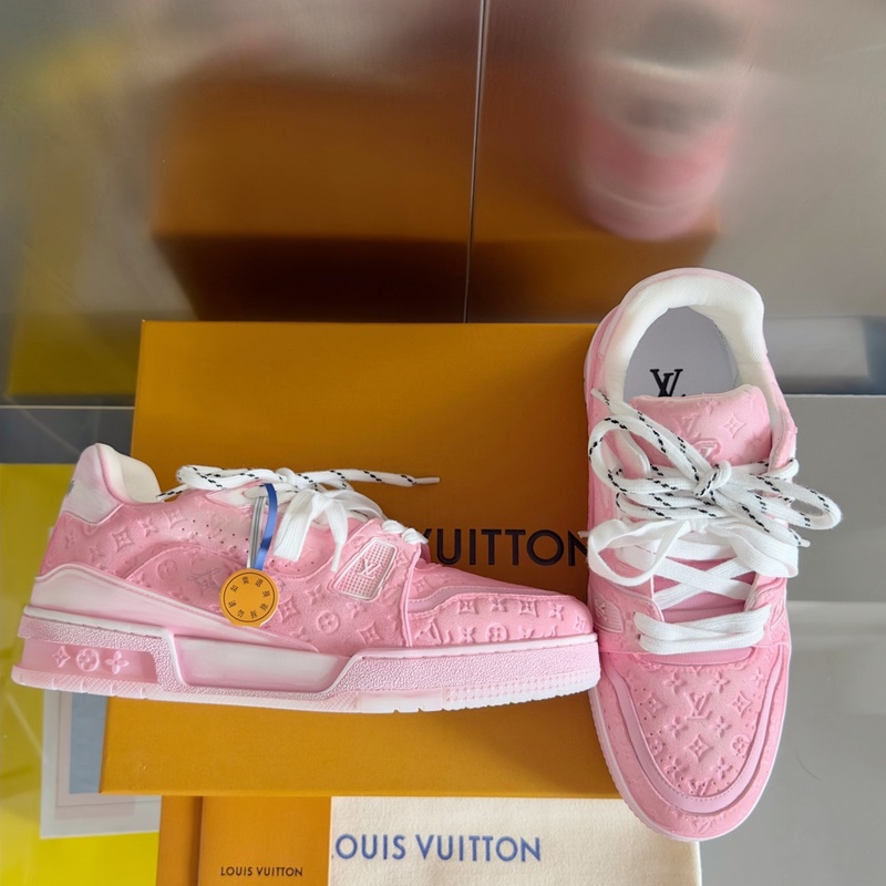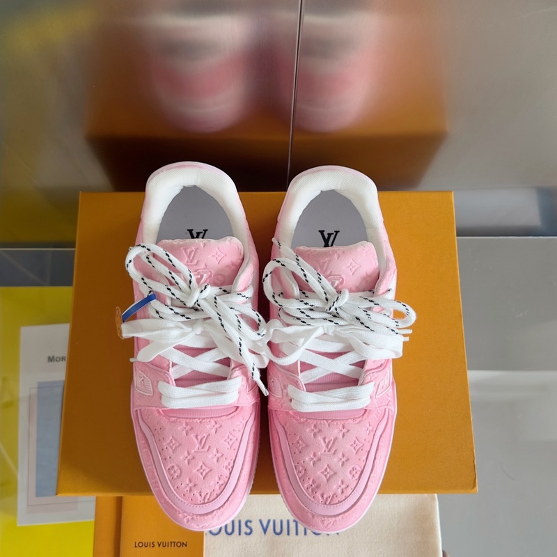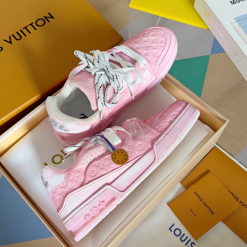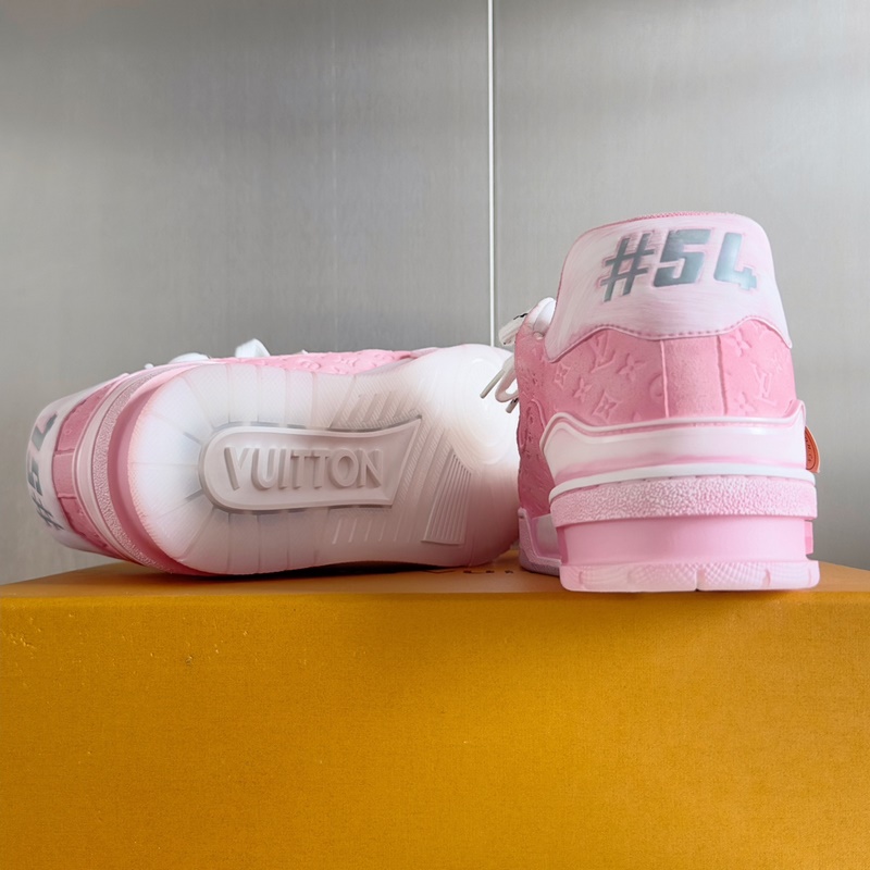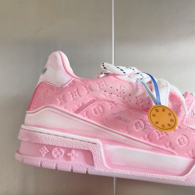 Original purchase development and production This LV Trainer sports shoe uses cowhide leather to create a complex upper, which requires hours of craftsmanship and sewing to complete. Spray-painted rendering of a unique retro effect, the classic configuration is from the hands of Virgil Abloh, showing the inspiration of retro basketball shoes