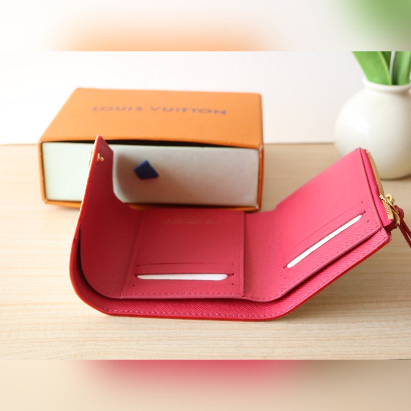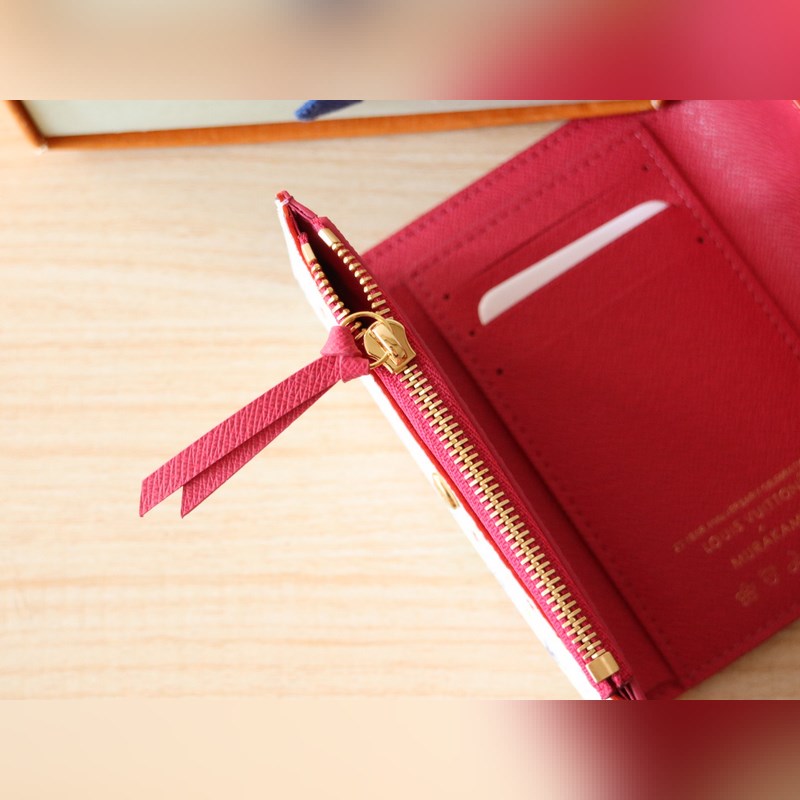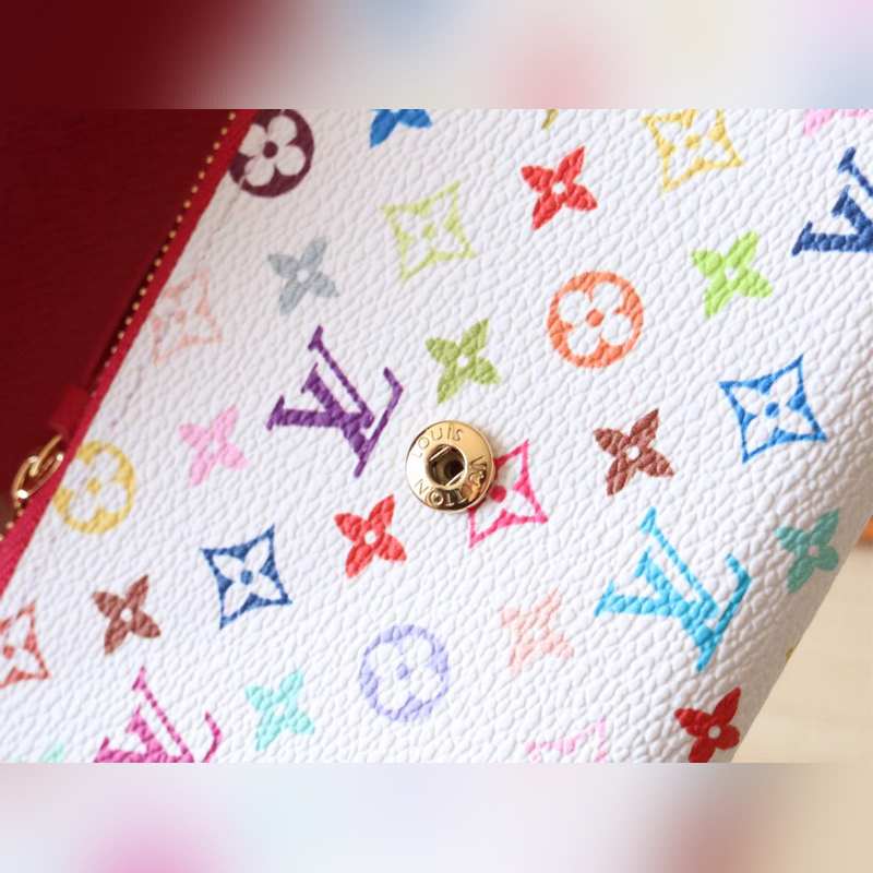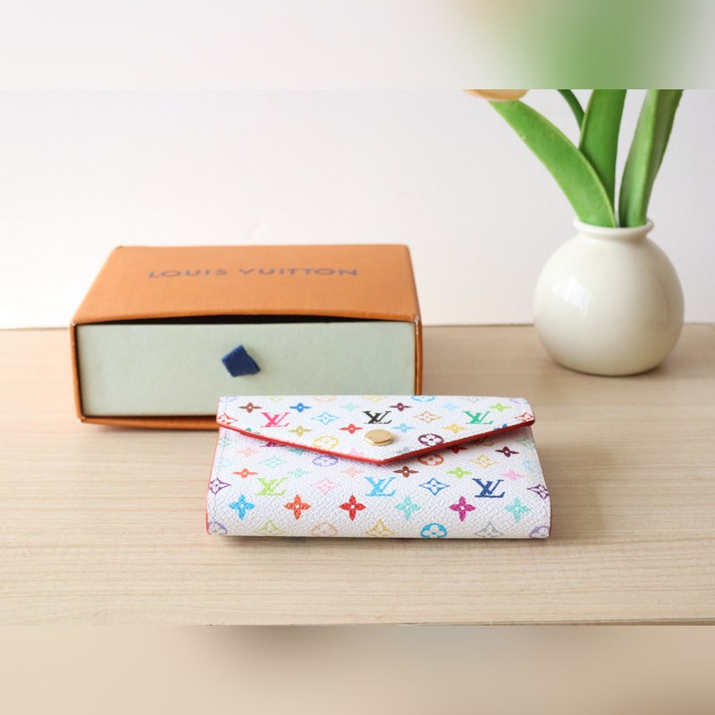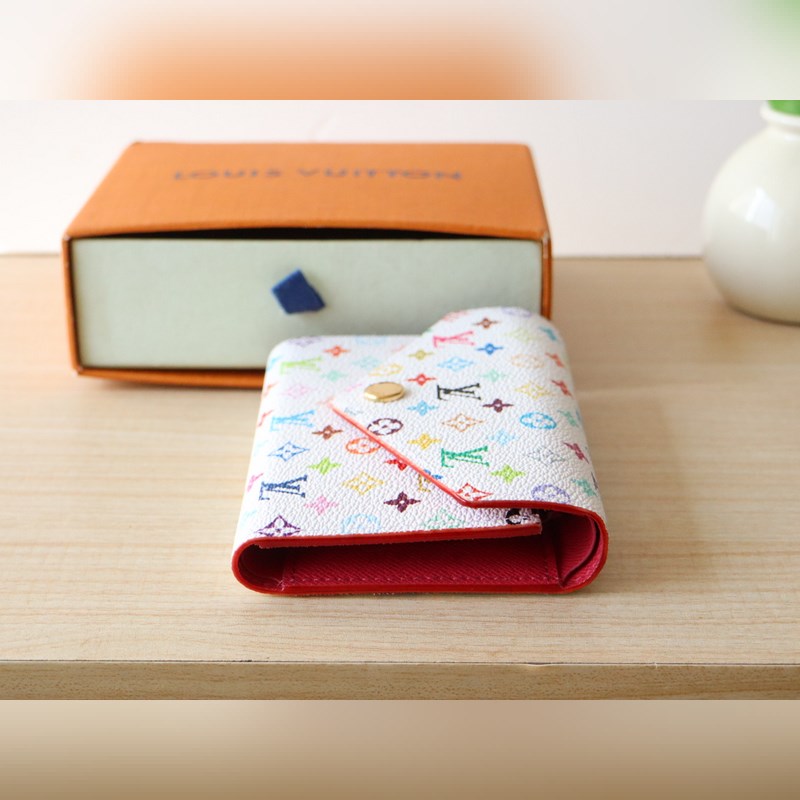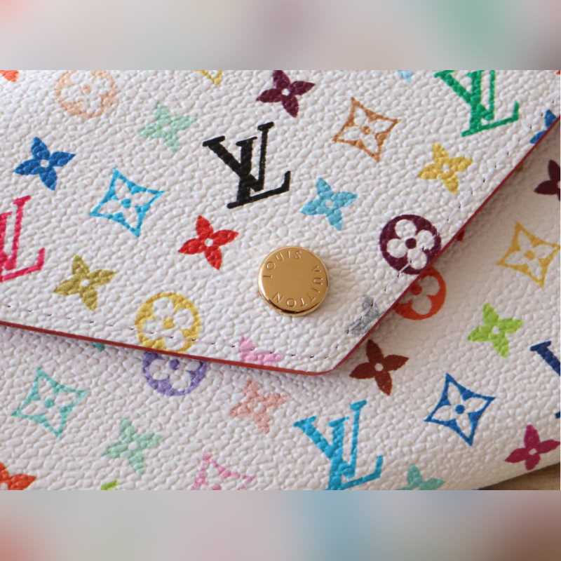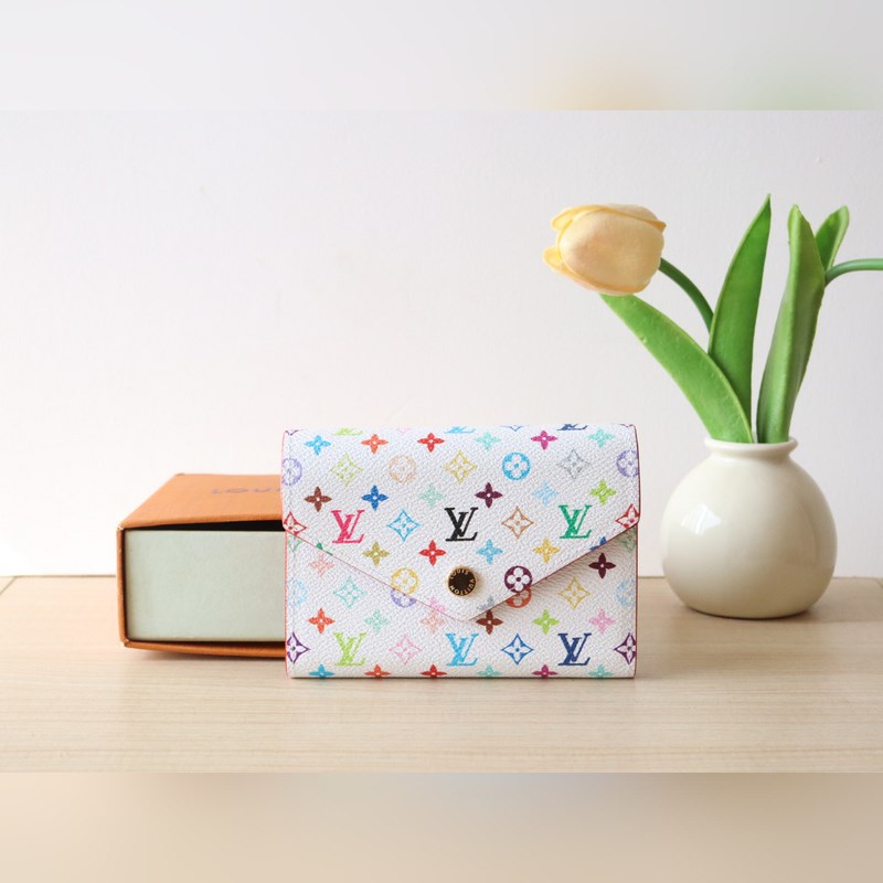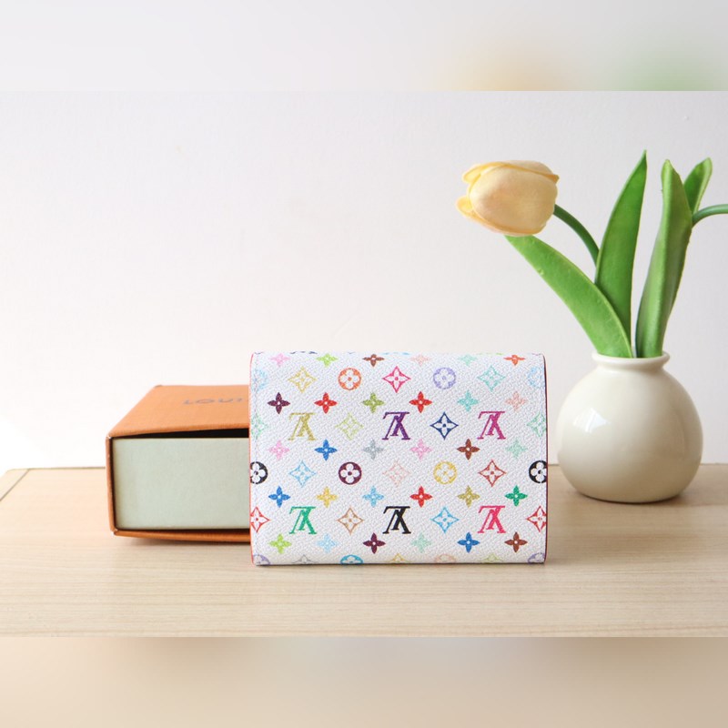 14163 Tri-color tri-fold wallet This replica of the Louis Vuitton x Murakami Victorine wallet is small and exquisite. The colorful Monogram pattern reinterprets the classic Louis Vuitton logo in the rainbow tones famous by Japanese artist Takashi Murakami. The wallet is made of coated canvas with fine cowhide lining and silver-colored hardware. It has a zippered coin compartment and multiple compartments inside for storing banknotes and business cards. 12 x 9.5 x 2.5 cm (length x height x width)