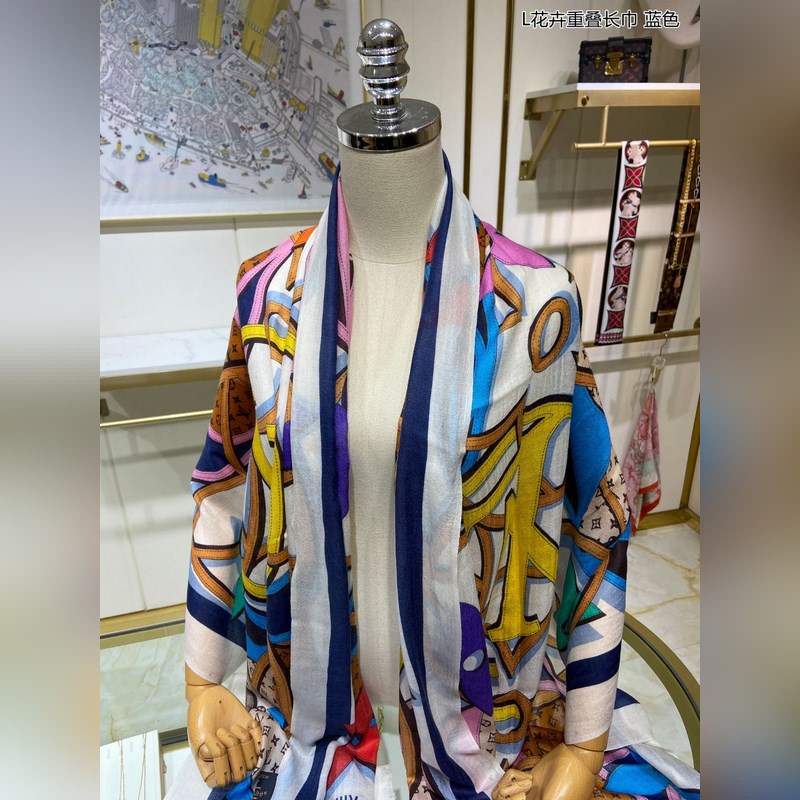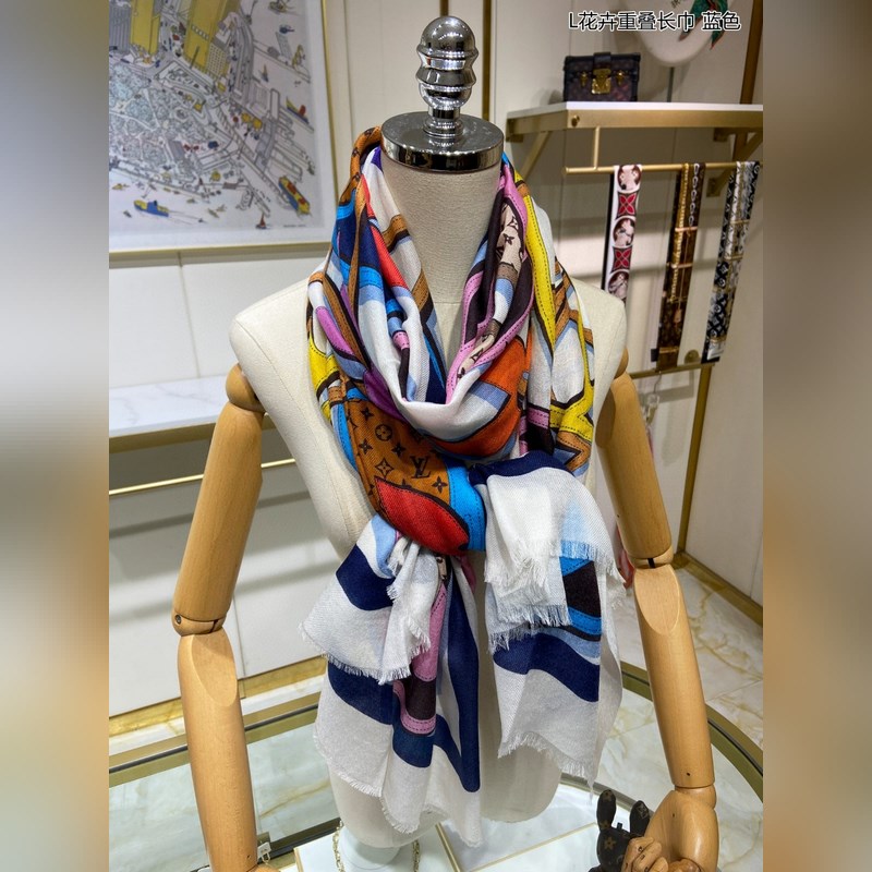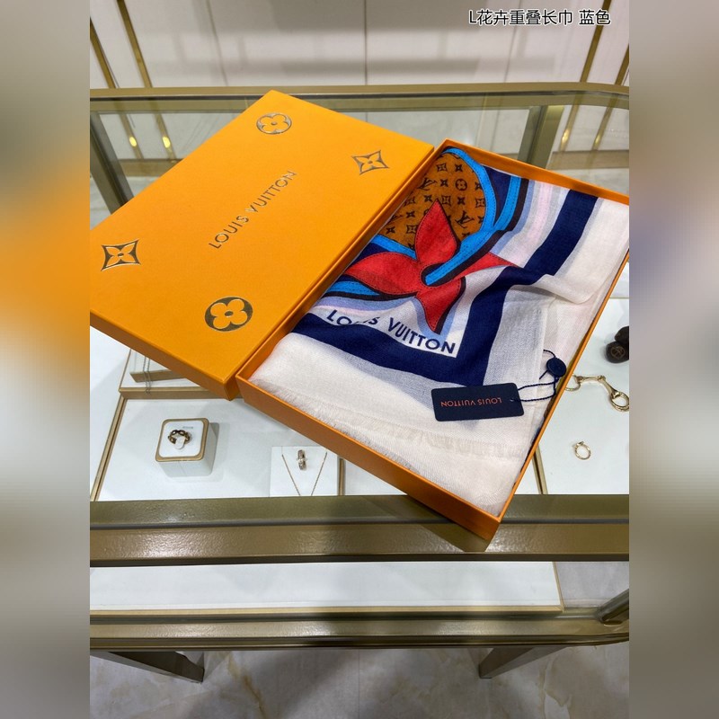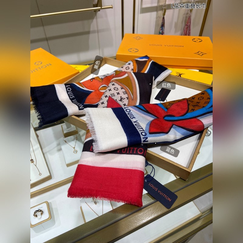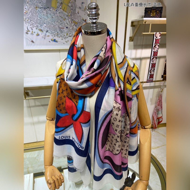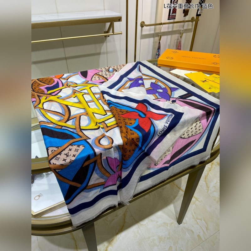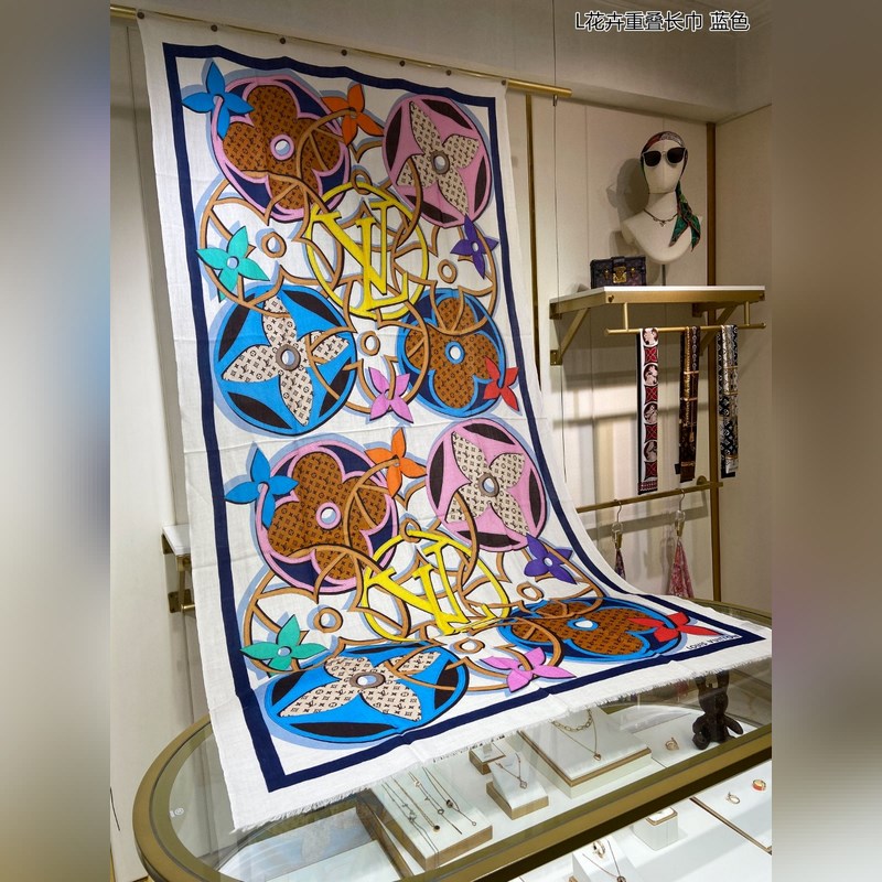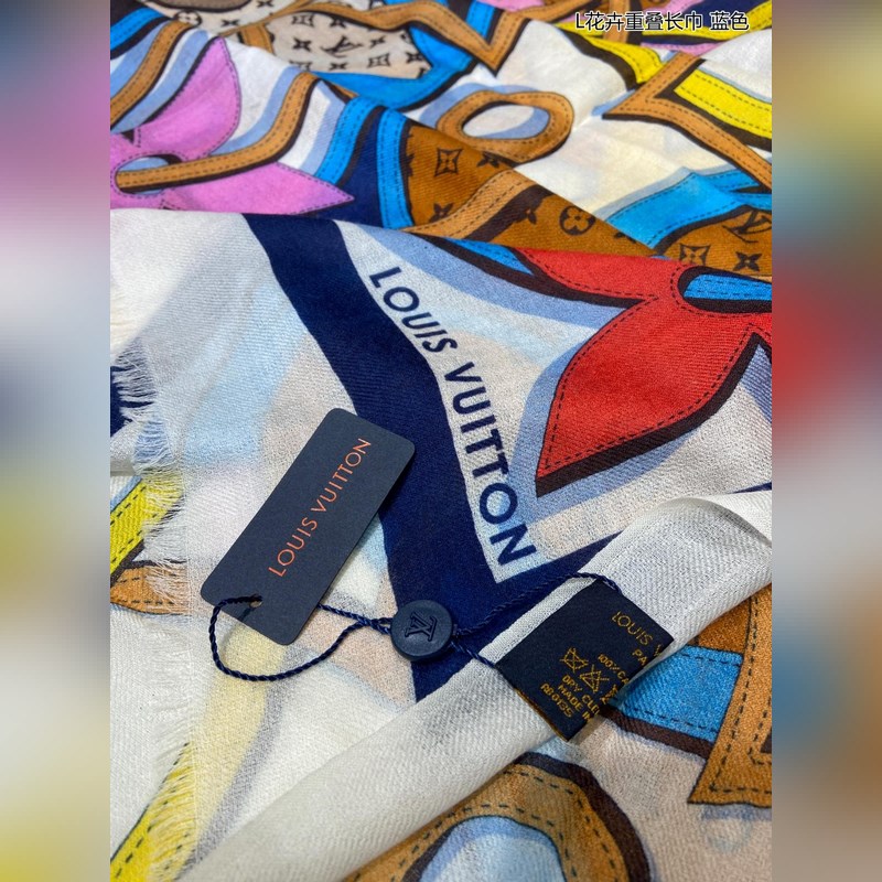 Cashmere scarf. Counter-same. Really like it. L floral overlapping scarf. Louis Vuitton classic Monogram pattern with colorful borders adds a gorgeous style. Highly recommended. This size is not too big or too small, especially easy to match. The quality is super good. You will understand the high-end quality when you get it. The high-end details are what you see. Heavyweight offer. VI customers must buy it. Size: 110*200cm 100% cashmere