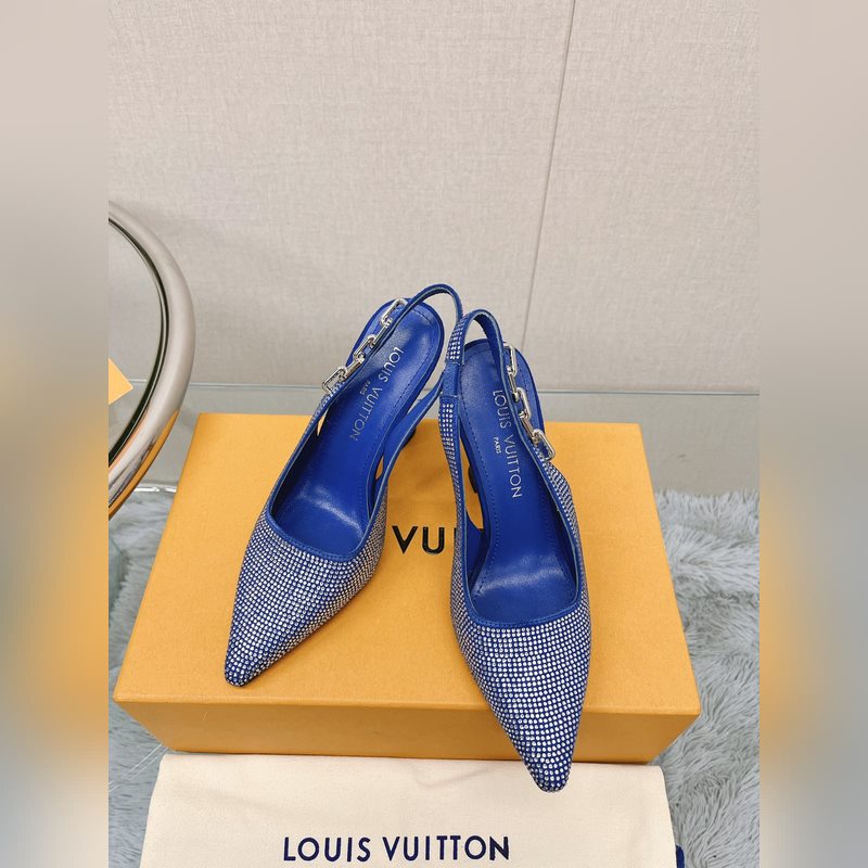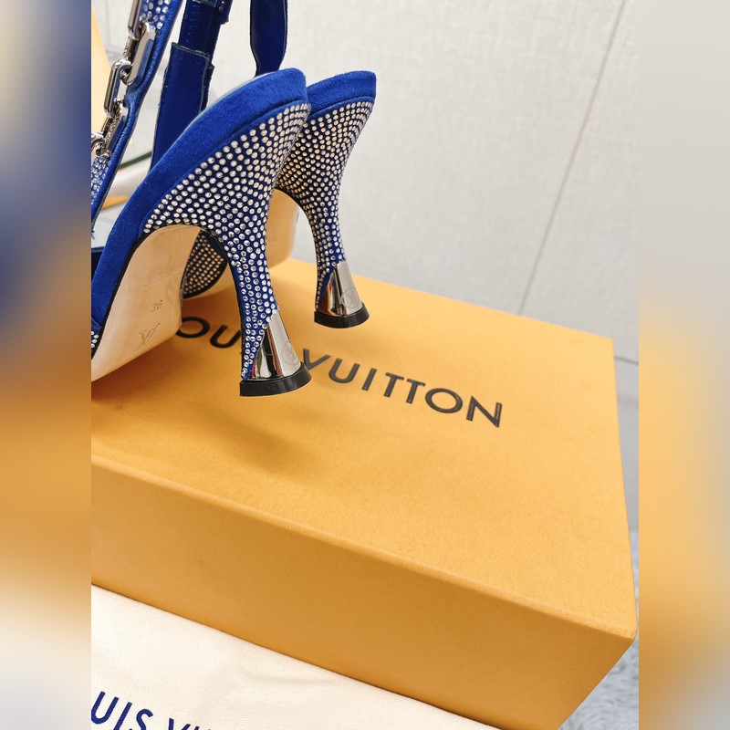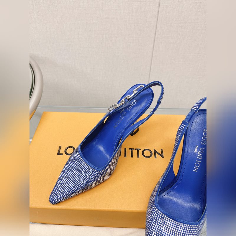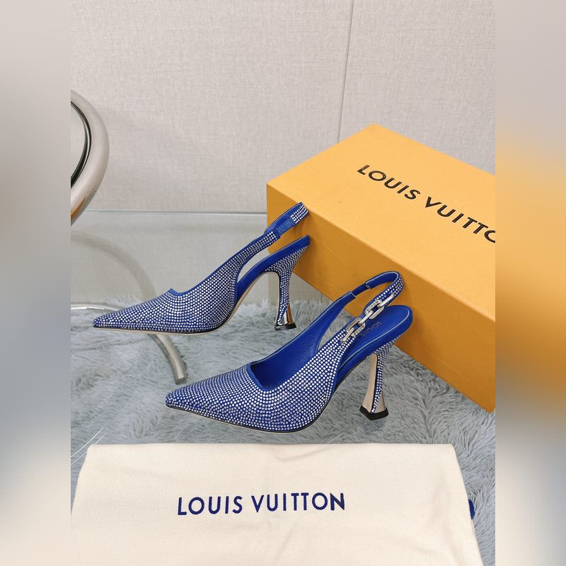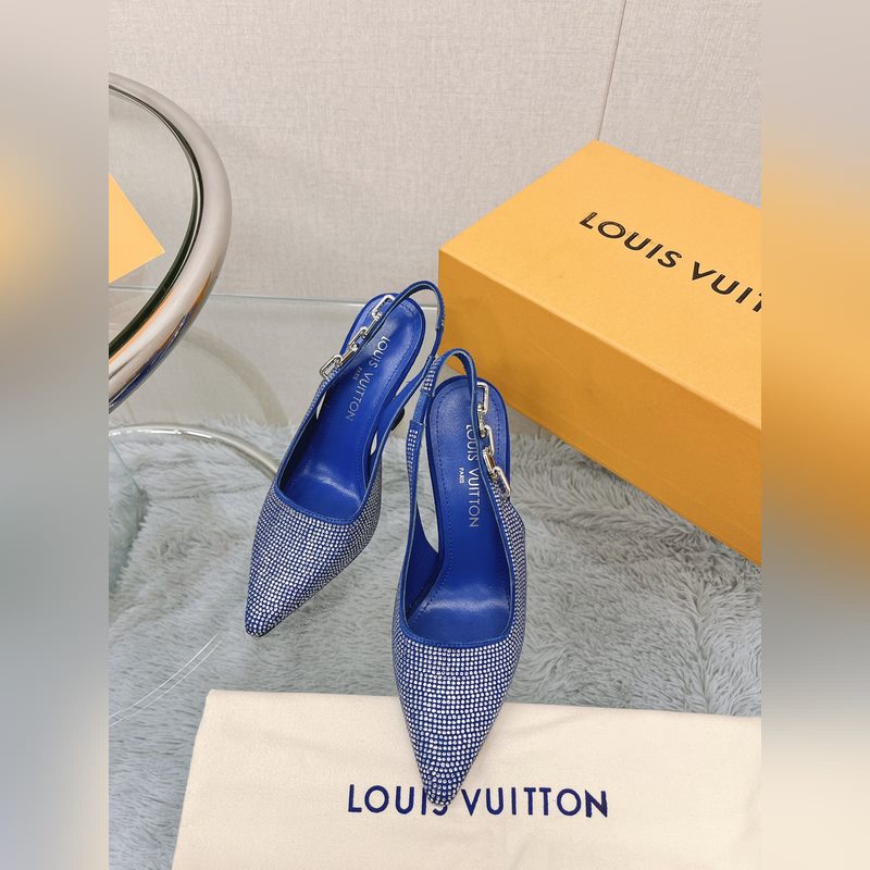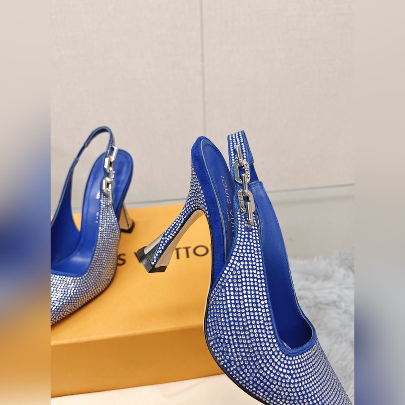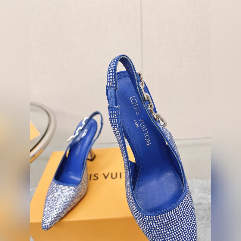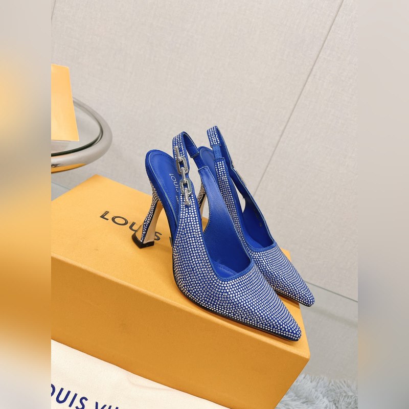 This Sparkle slingback high heel is cut out of soft cowhide leather with elegant lines. The main features are pointed toe and high flared heel. The latter is decorated with metal inlays. The elastic back strap is embellished with the brand’s engraved chain
