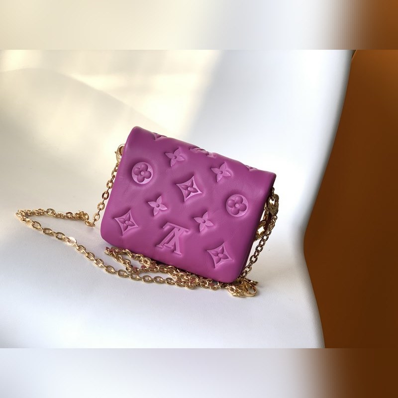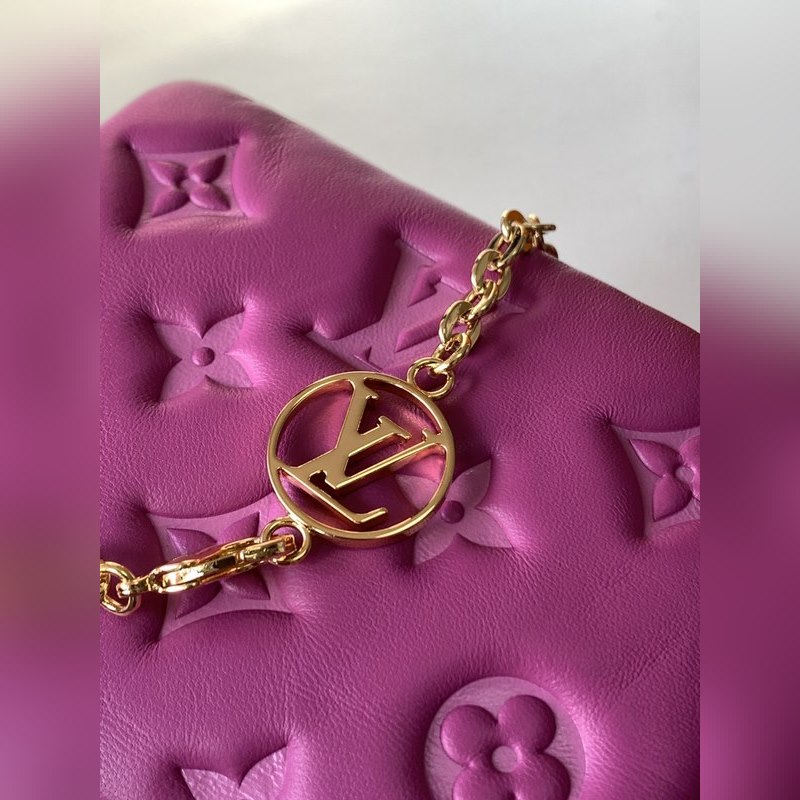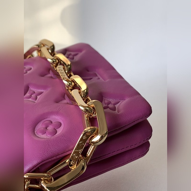 Part of the Cruise 2022 collection, the Belt bag Coussin is crafted from extra-soft lambskin leather embossed with the iconic Monogram pattern to create a fluffy cushion-like effect. This neat bag can be held in the hand thanks to its thick gold chain, or worn over the shoulder using the longer, thinner chain.