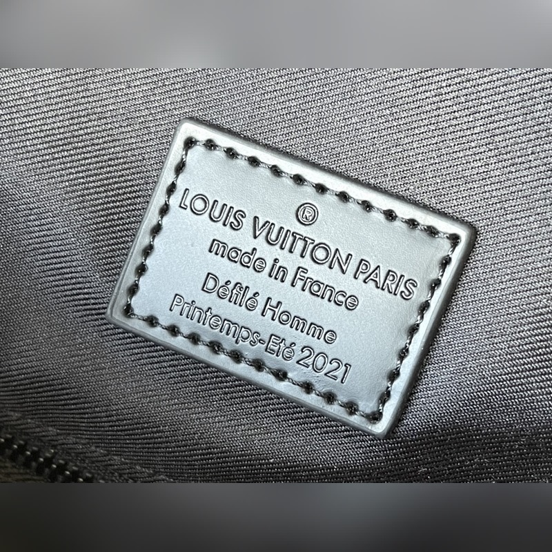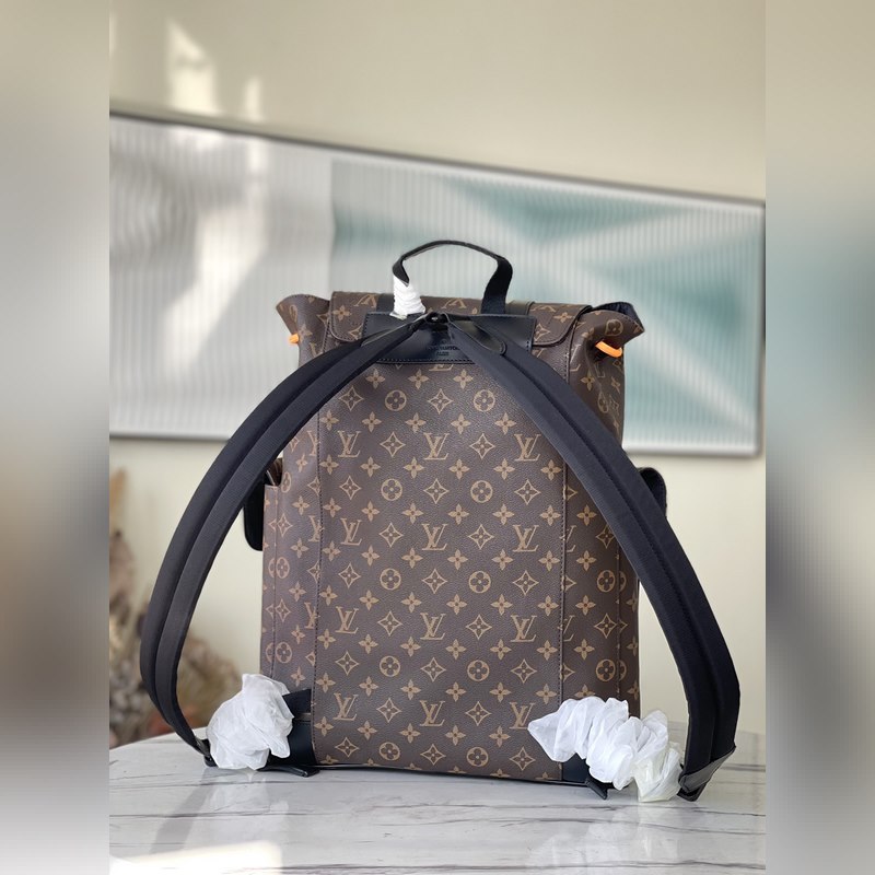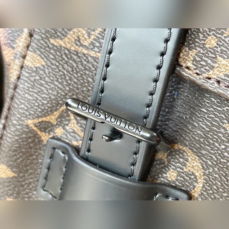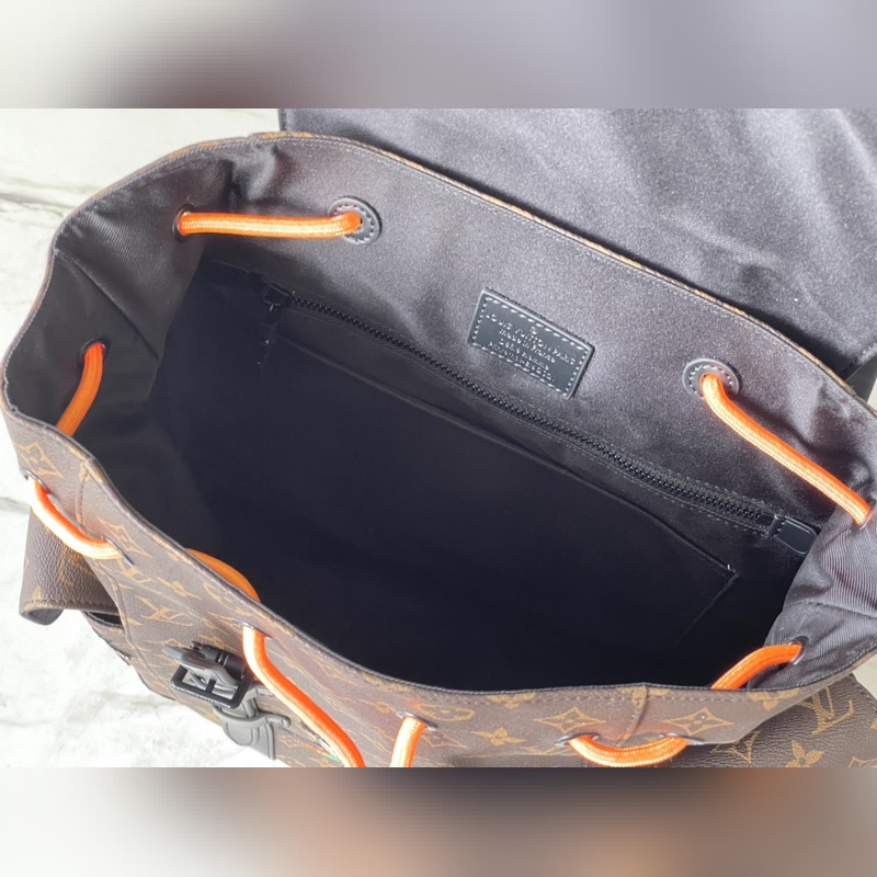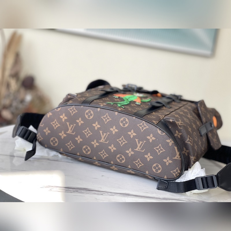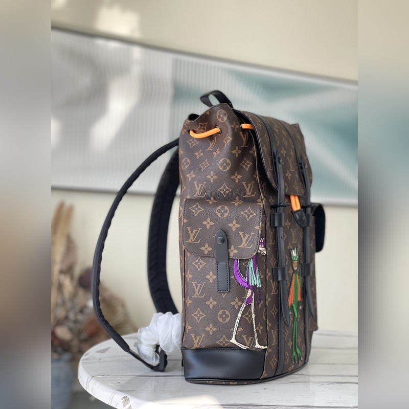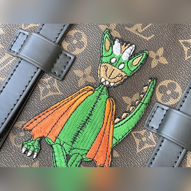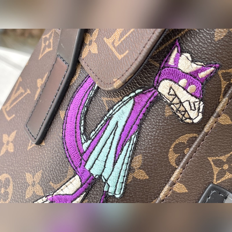 LV M45617 Spring/Summer 2024 Christo Her backpack in Monogram canvas with embroidered patches depicting the friends created by Virgil Abloh in the animated film Zoooom with Friends. Inner and outer pockets for tablets and other items. Dimensions: 41 x 48 x 13 cm