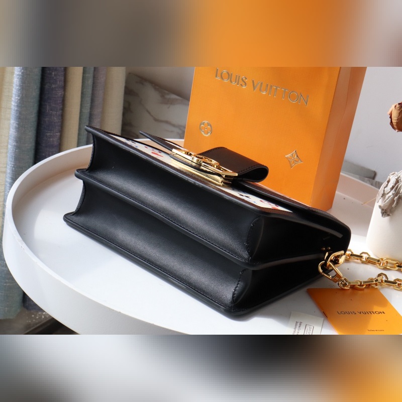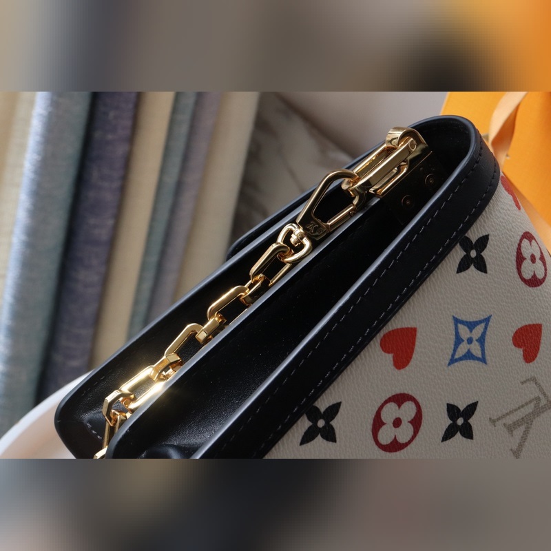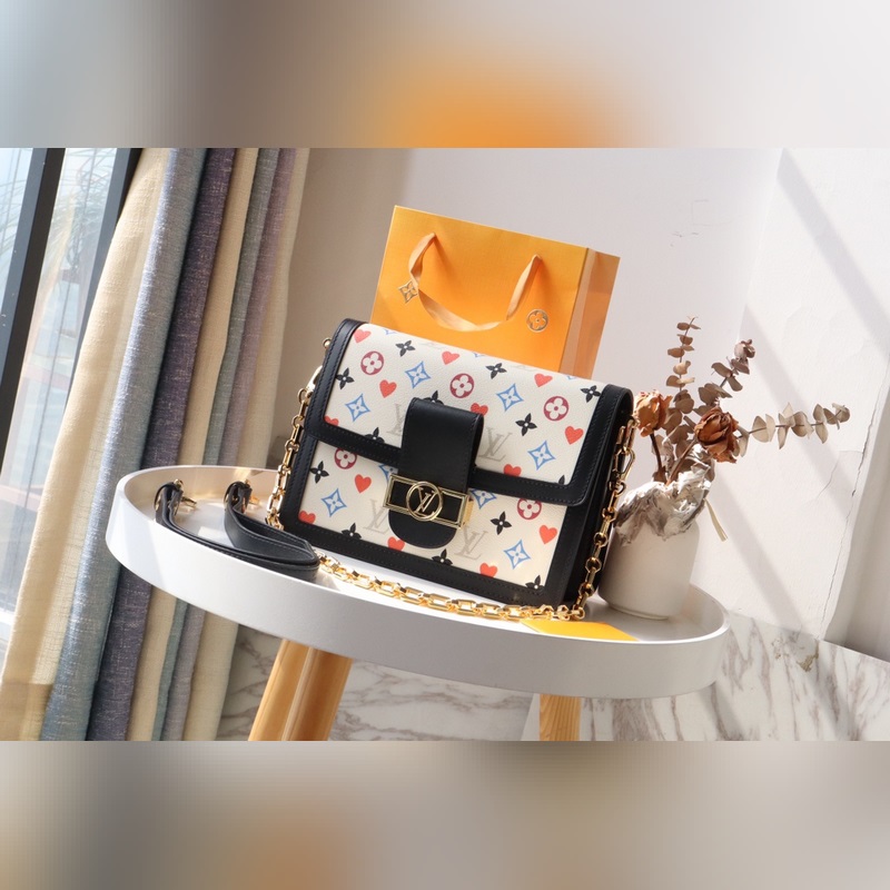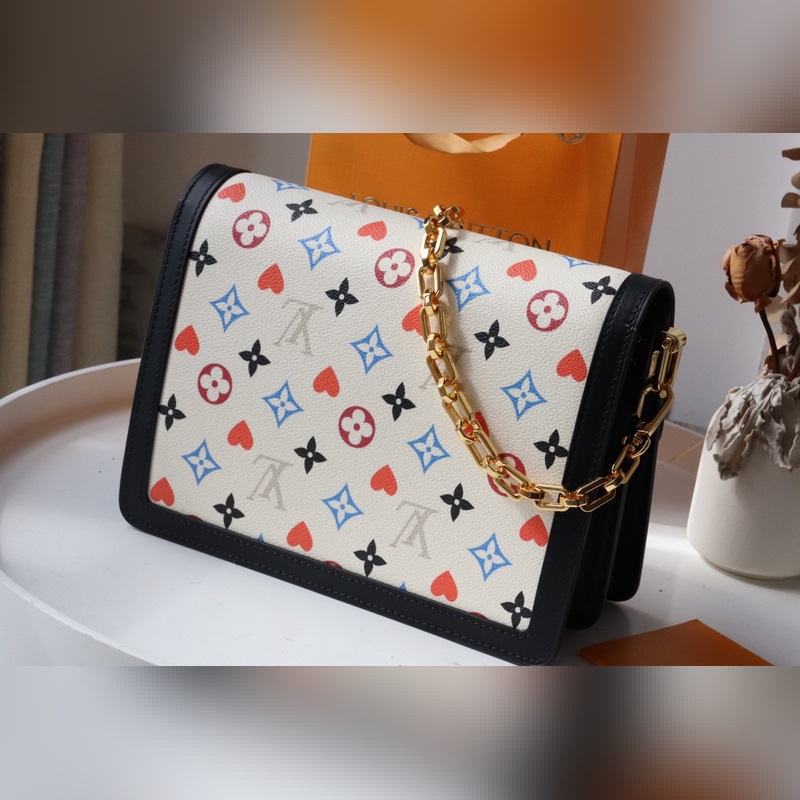 The Dauphine Medium Bag is a Game On Monogram canvas bag with leather trims, which was reborn in the 2021 Early Spring Series. The red heart print replaces part of the Monogram flower, paired with a chain shoulder strap and iconic lock. Dimensions: 25 x 17 x 10.5 cm
