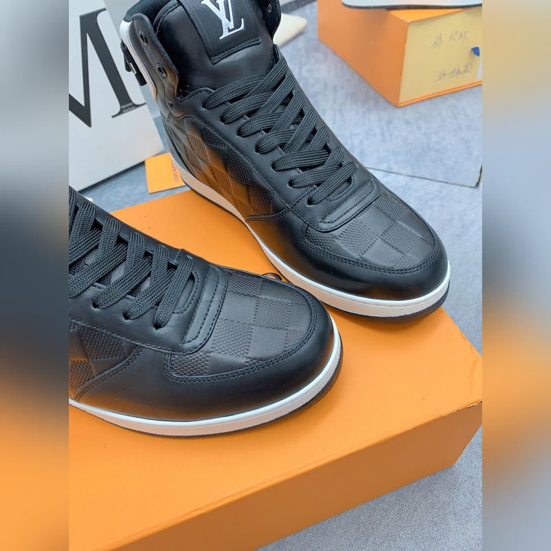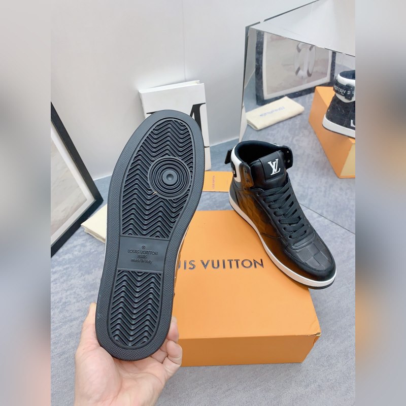 Original purchase, development and production. This Rivoli high-top sports boot is made of grained cowhide leather, with eye-catching strokes presenting the classic Damier pattern. The Louis Vuitton logo laces that can be fixed at the front and back continue the consistent design, and the rubber outsole completes the overall configuration.