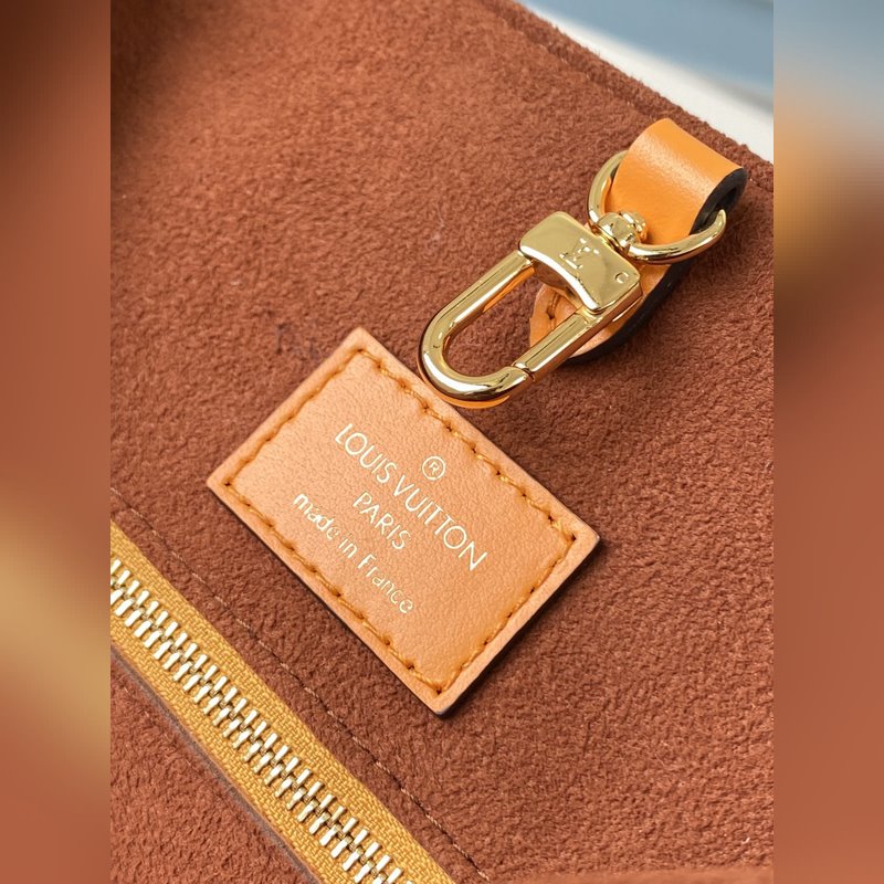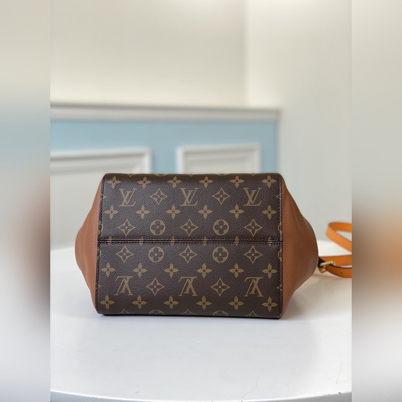 Made in Monogram canvas and dark-dyed calfskin, with Toron handles, leather handle loops and rivets. The folded leather gusset hides the capacity, and the wide leather shoulder strap is convenient for shoulder or crossbody. Dimensions: 23.0 x 28.0 x 19.0 cm