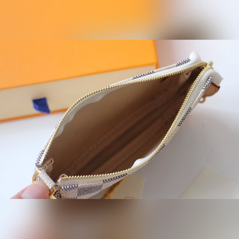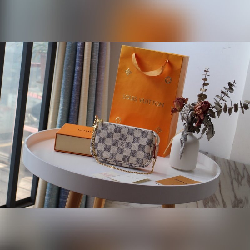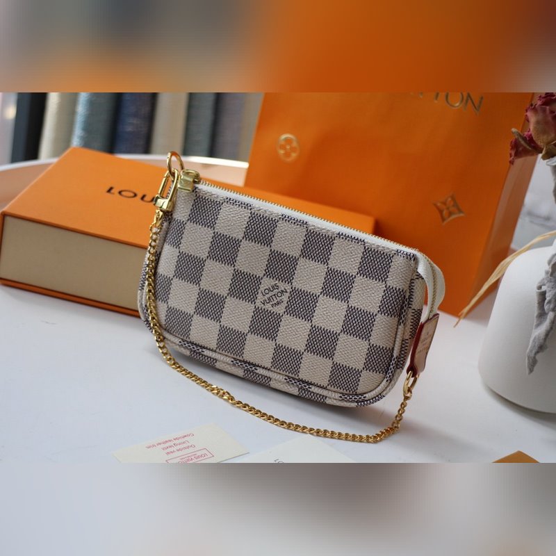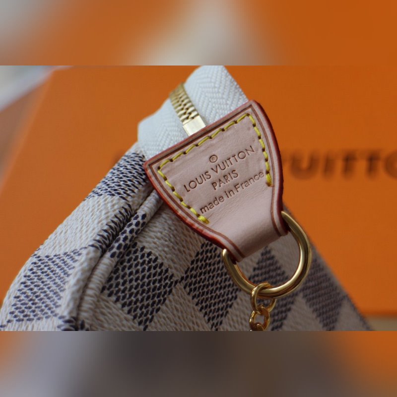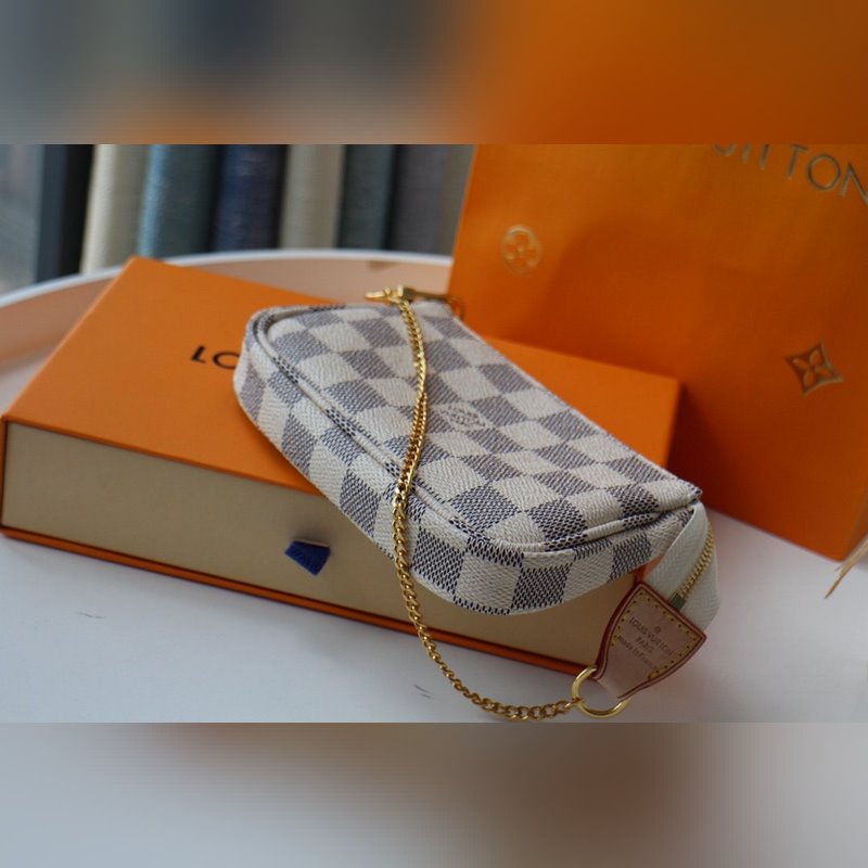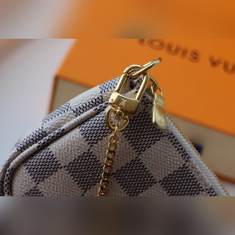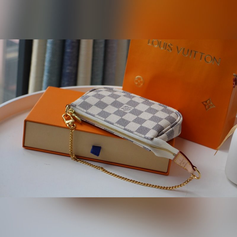 This charm bag has a zipper closure and a gold chain that can be attached to the D-ring on most Louis Vuitton handbags.
