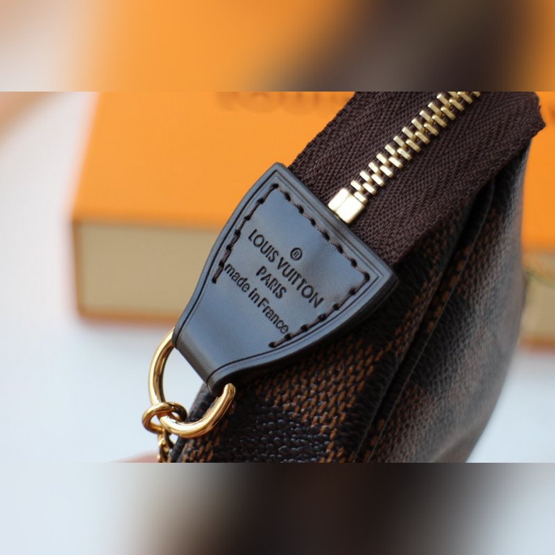 This charm bag has a zipper closure and a gold chain that can be attached to the D-ring on most Louis Vuitton handbags.