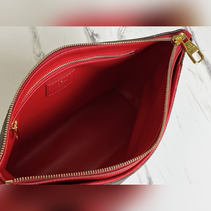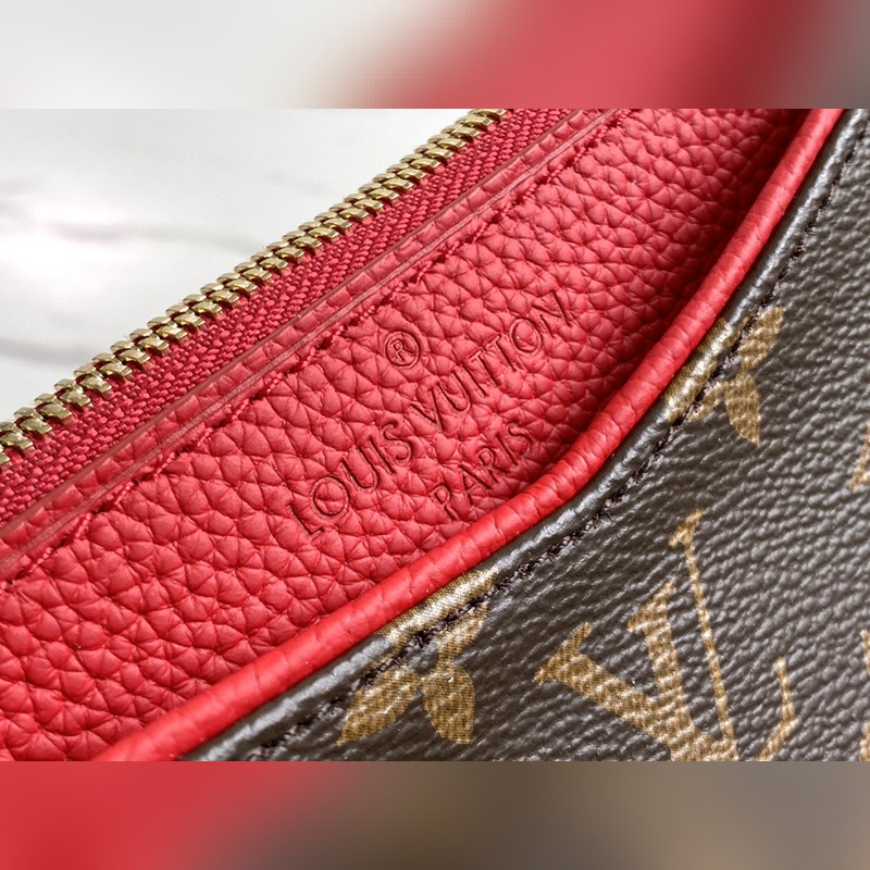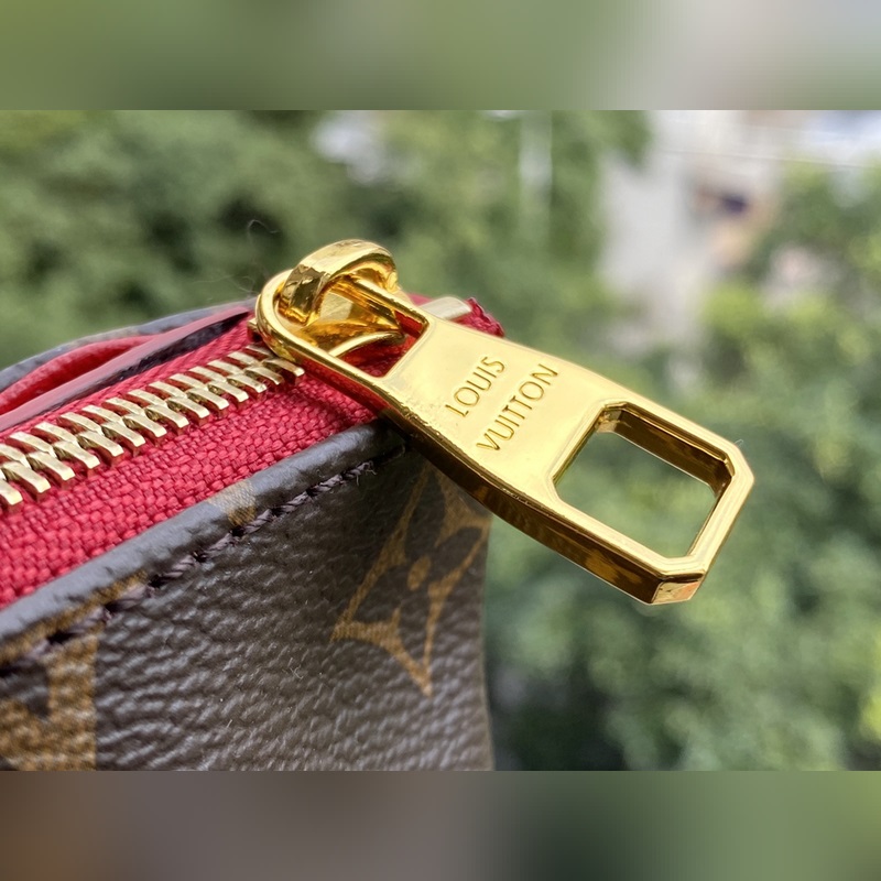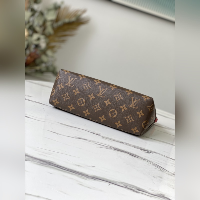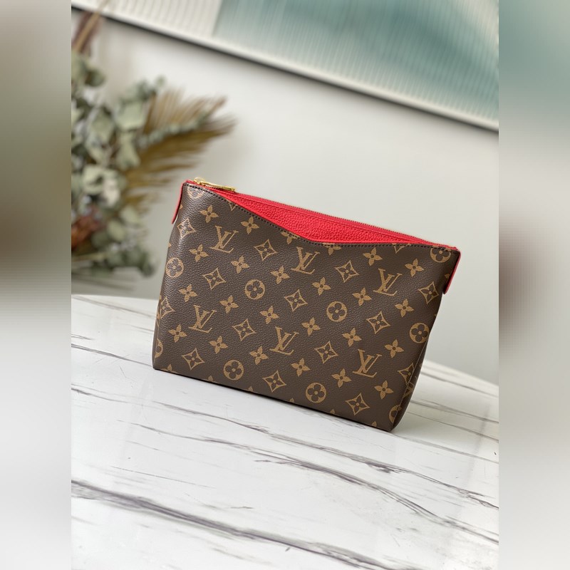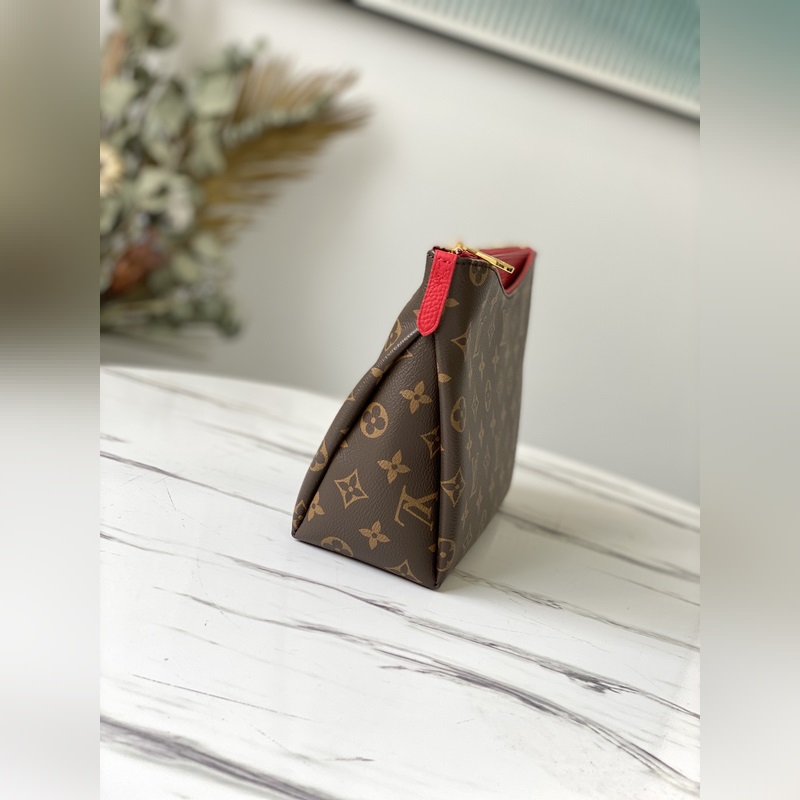 Monogram coated canvas and calfskin exterior, washable coated canvas lining, calfskin trim. Travel can be stylish. Designed with feminine flair, made from soft canvas and grained leather, this Pallas Beauty Case features a chain pocket and patch pockets for personal treasures. It is soft and can be easily stored in a suitcase even when fully loaded. Dimensions: 28.0x 18.0x 10.0 cm