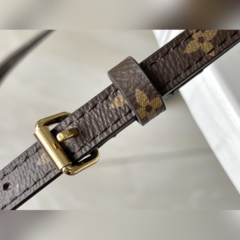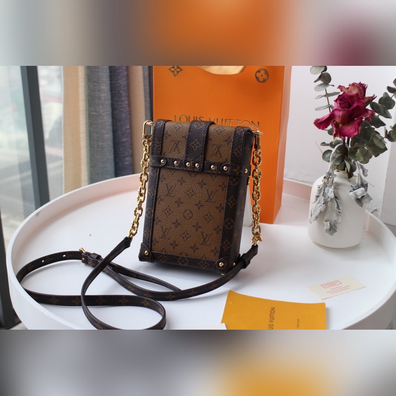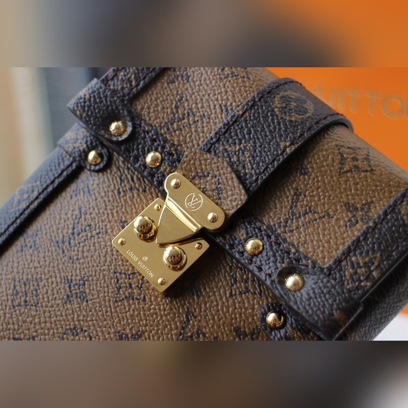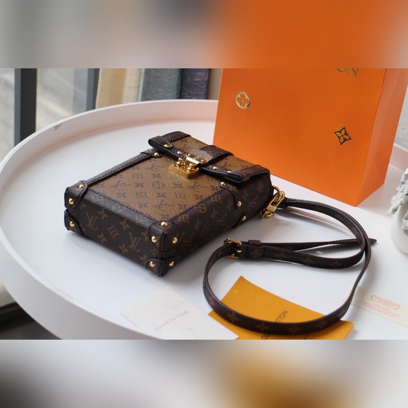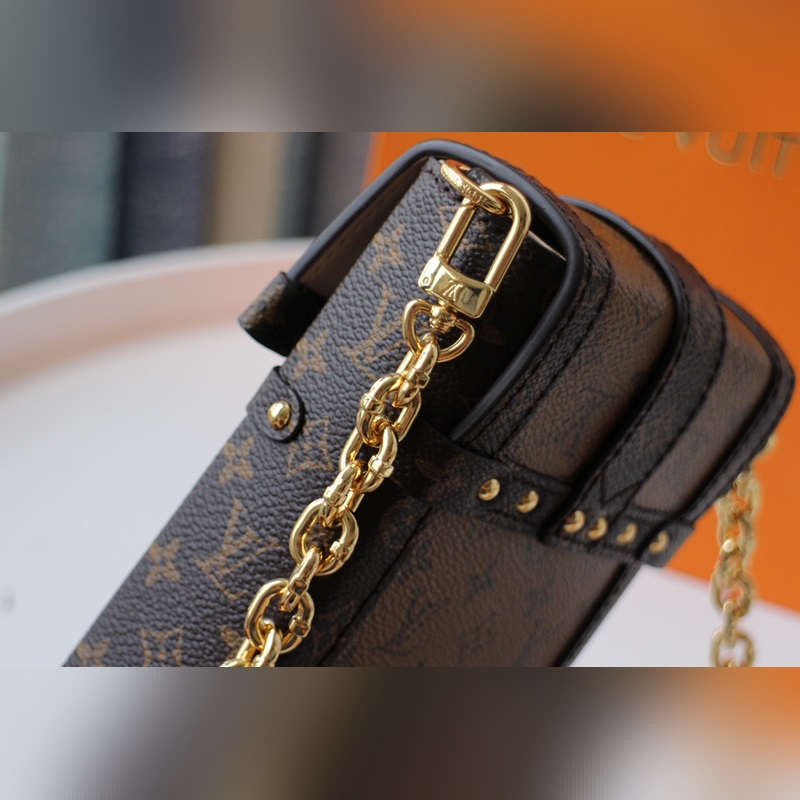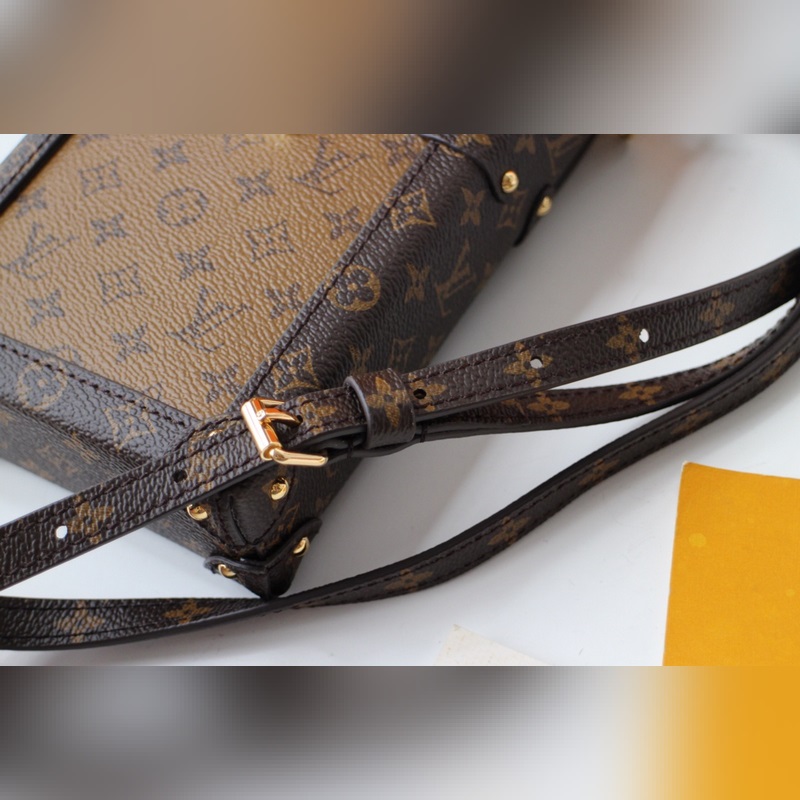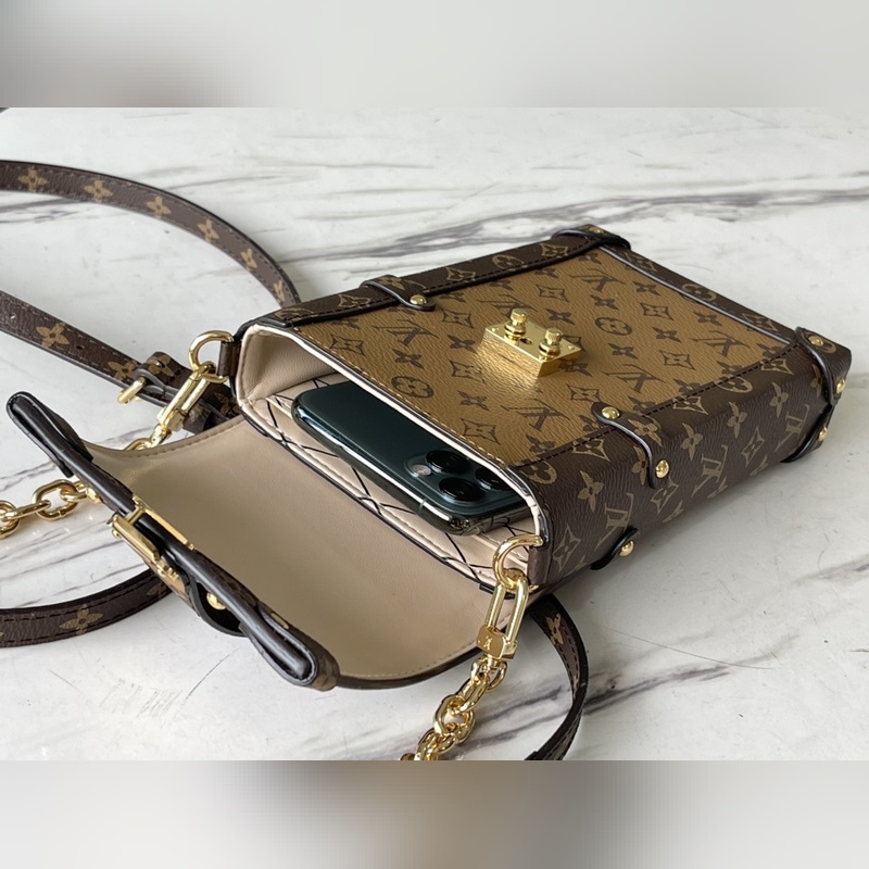 Made from Monogram Reverse canvas, with Monogram canvas trim and trunk elements such as S-lock and Malletage quilted lining. Adjustable shoulder strap is also detachable. Dimensions: 11.0 x 17.5 x 3.5 cm