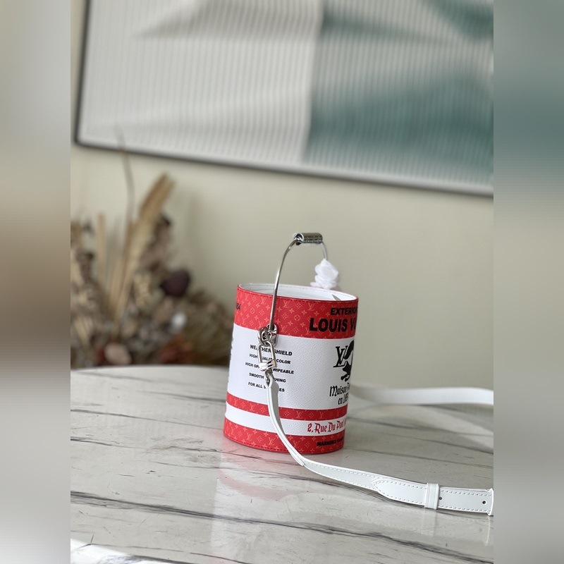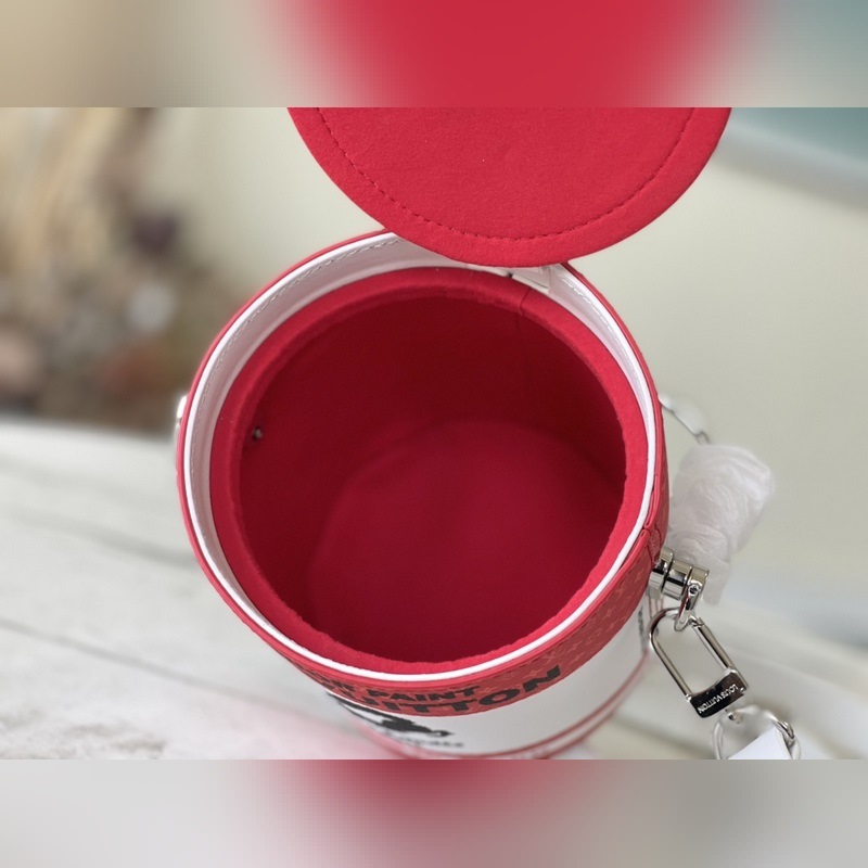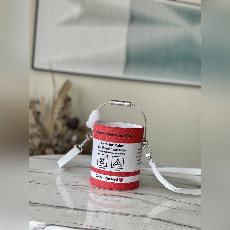 Model No.: M81595 Red The bag has a metal handle that mimics the shape of a paint bucket