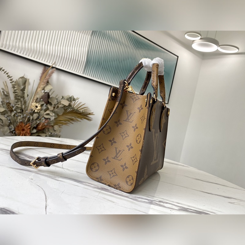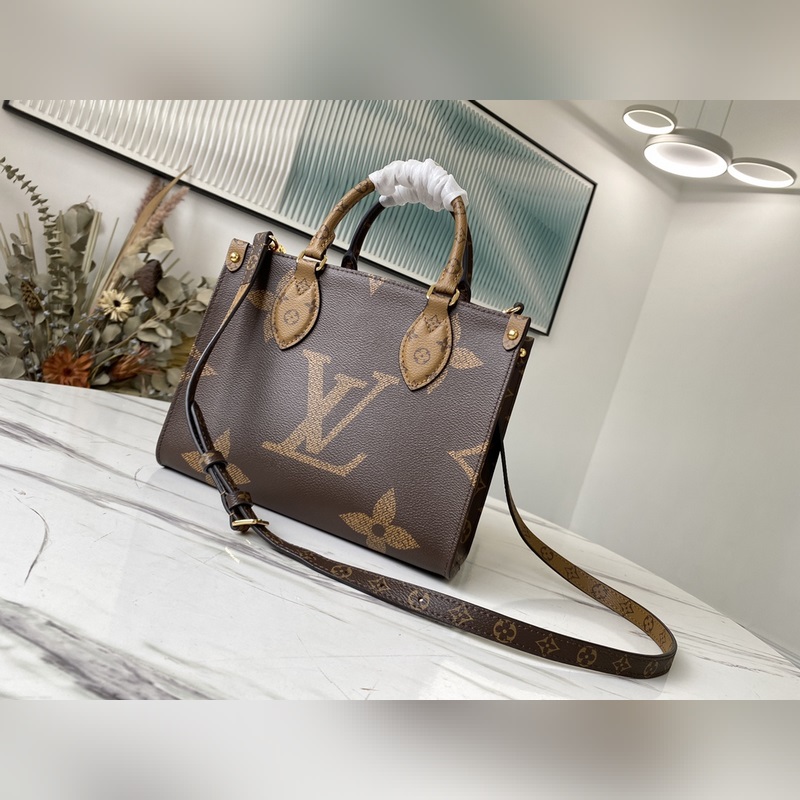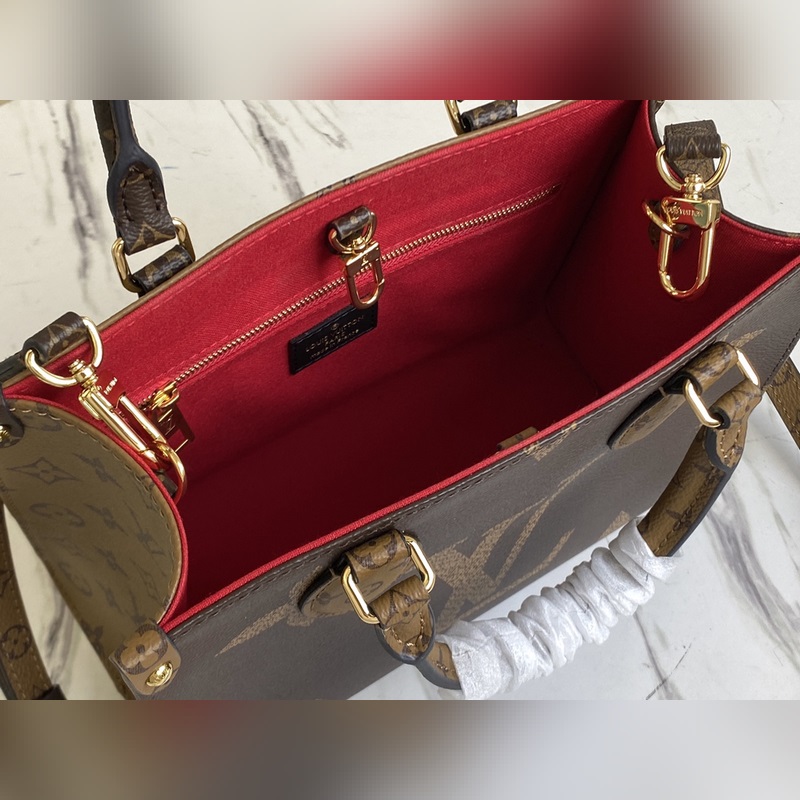 Work, shopping or weekend trip, pick up the Onthego bag and go immediately. The oversized Monogram print contrasts with the mini Monogram trim, with ample interior design, the avant-garde and modern feel is self-evident. Size: 25-19-11.5 cm