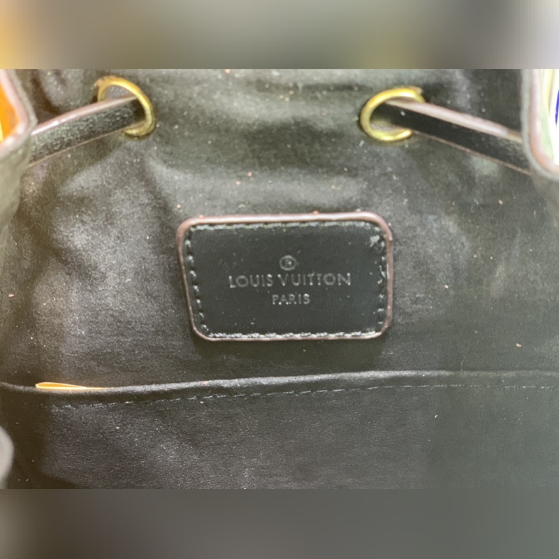A modern, pocket-sized silhouette in classic Monogram canvas and calfskin, with buckles and leather drawstrings inspired by the original 1994 design. Top handle and removable and adjustable leather shoulder strap for versatile carrying options. Size: 17-20-10.5