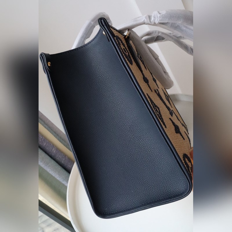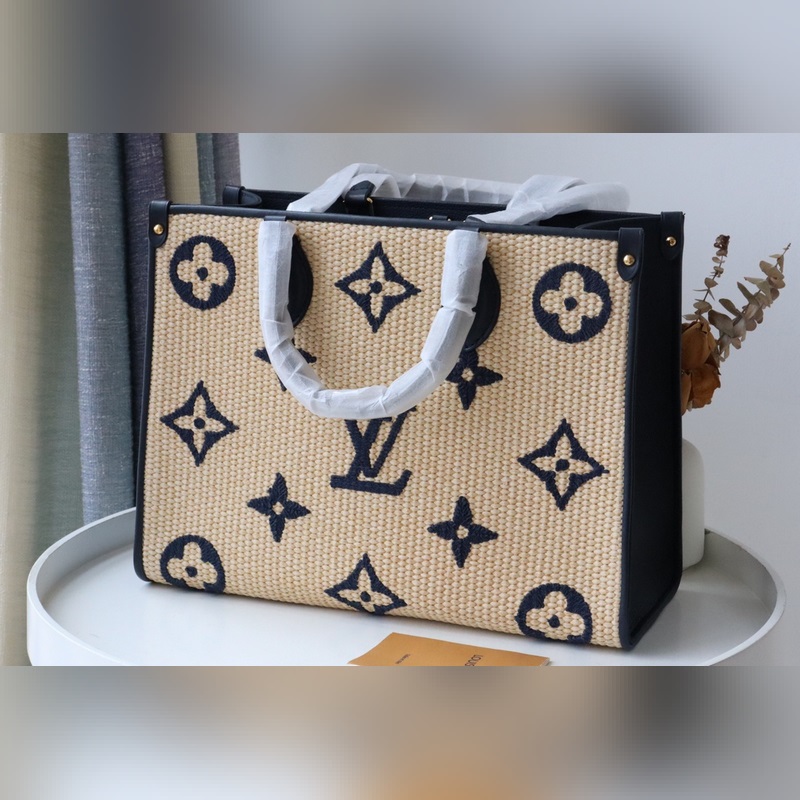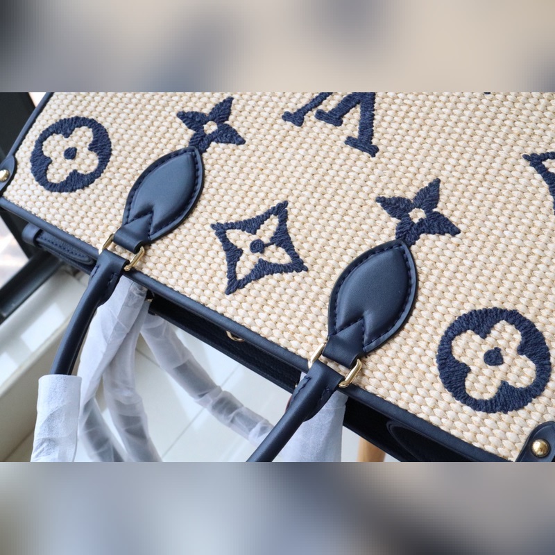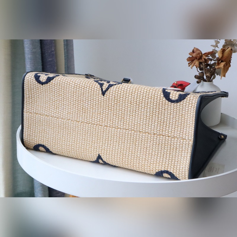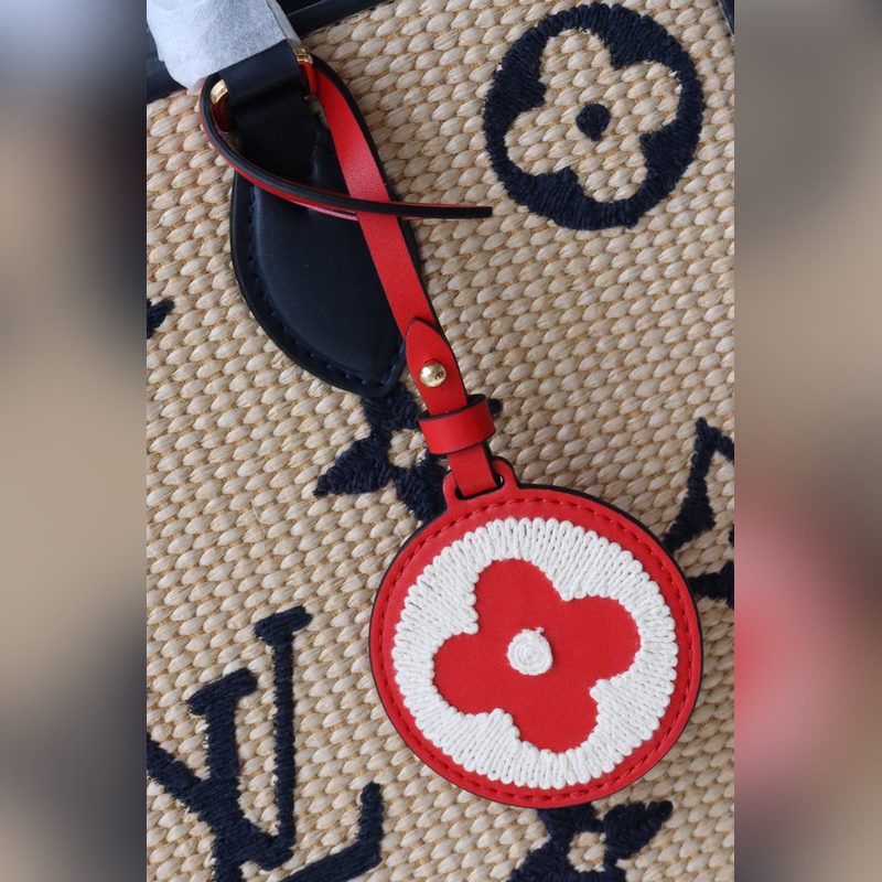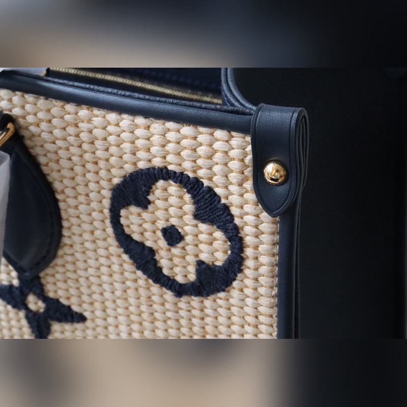 The Monogram Giant pattern embroidery is set off by Monogram Raffia fabric, showing the vitality of recycled cotton and environmentally friendly log Tencel. The linen woven big logo flower woven mommy bag blows the cozy beach style, with leather handles, shoulder straps and lining and detachable bag decoration. Size 35 x 27 x 14 cm