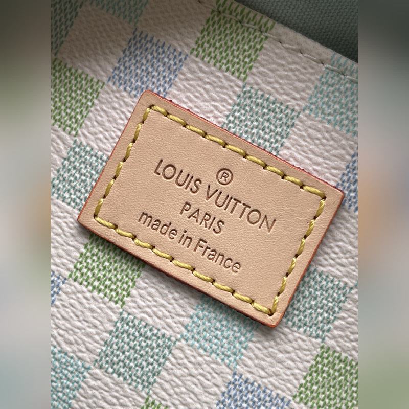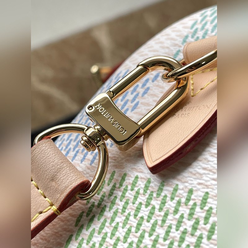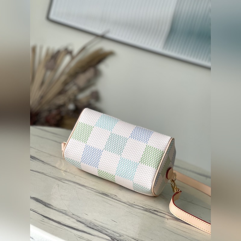 LV N40515 This Seedy Bandouliere 20 bag is a digitally printed version of the Damier Giant canvas in pastel tones. The unique shape is inspired by the brand’s classic travel bags, with a push-pull leather handle and a removable and adjustable shoulder strap for easy shoulder or crossbody carry. Dimensions: 20 × 15 × 12.5 cm