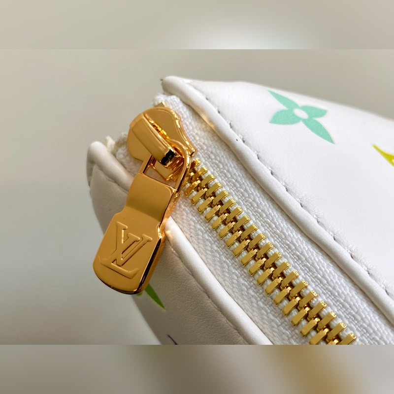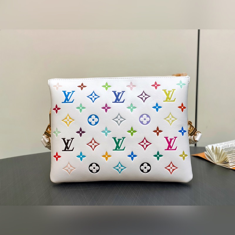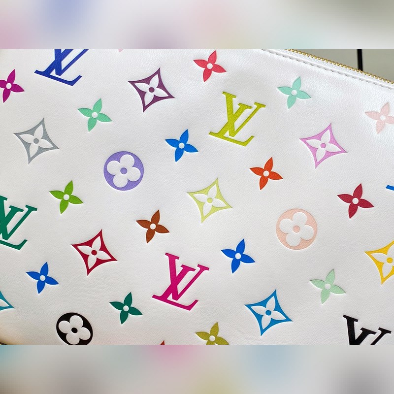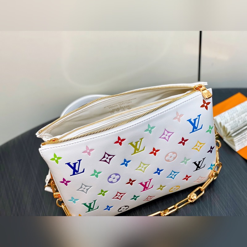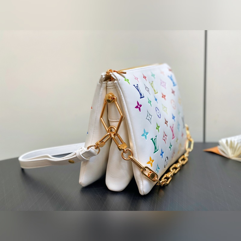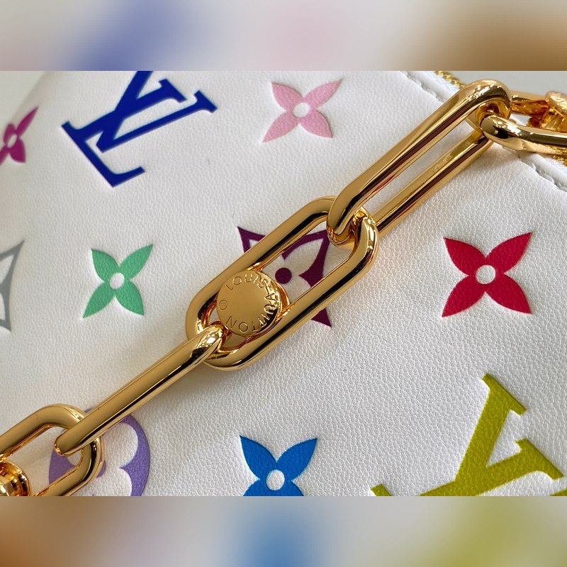 This year’s new M13233 white full leather chain bag LV x TM COUSSIN small handbag White/Tricolor (Takashi Murakami) This Coussin small handbag is from the Louis Vuitton x Takashi Murakami reprint series. It uses fluffy sheepskin to create a neat configuration, and then uses the full Monogram pattern to present the rainbow tones of Japanese artist Takashi Murakami. The rough metal chain and detachable leather shoulder strap allow for multiple carrying methods. Size: 20 x 12 x 26 cm