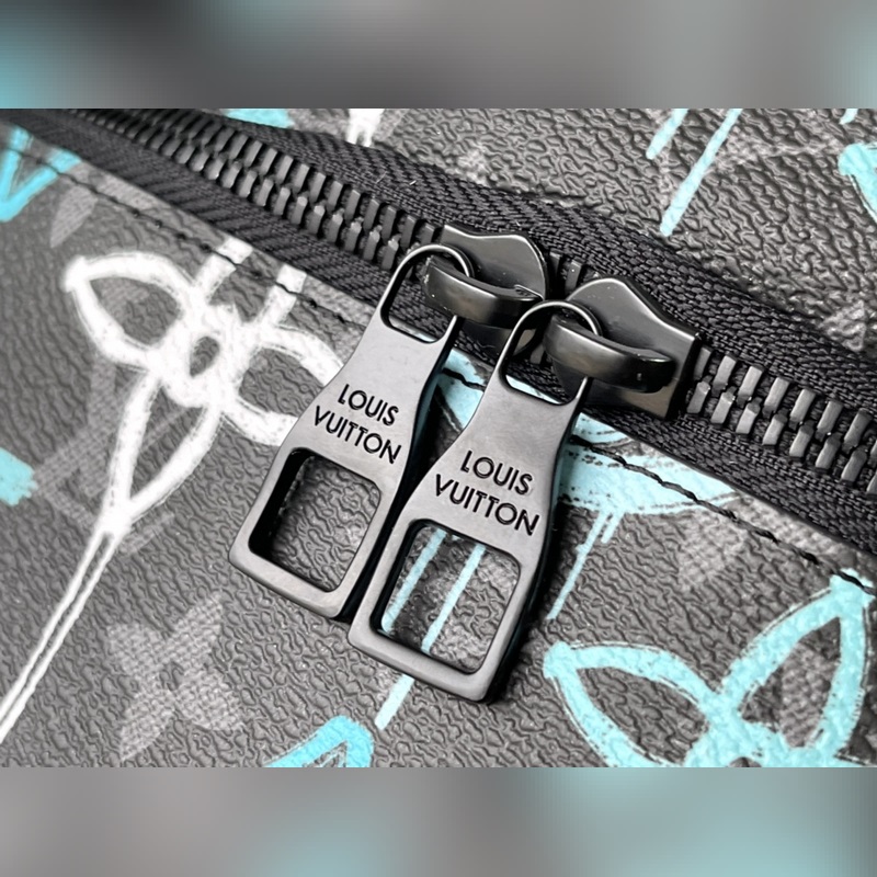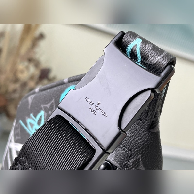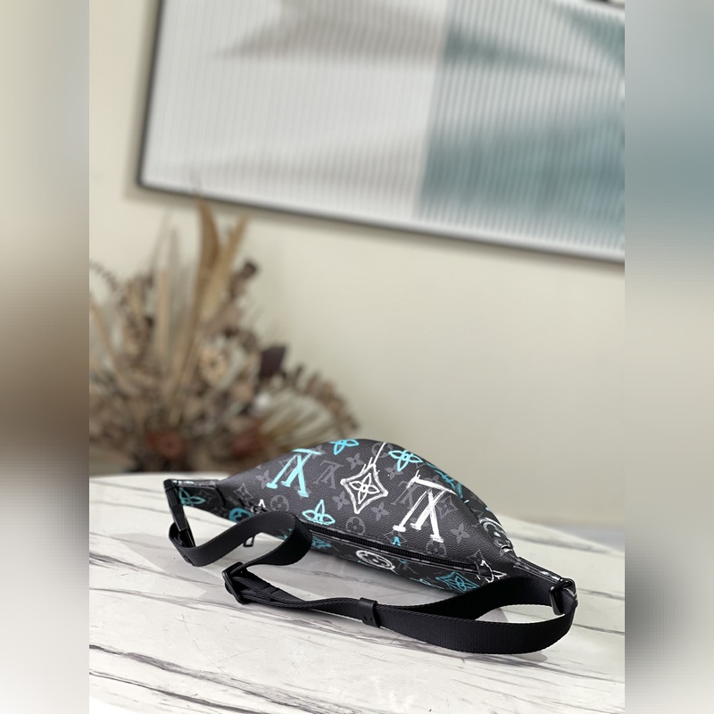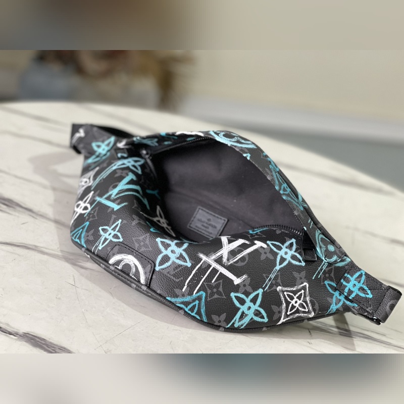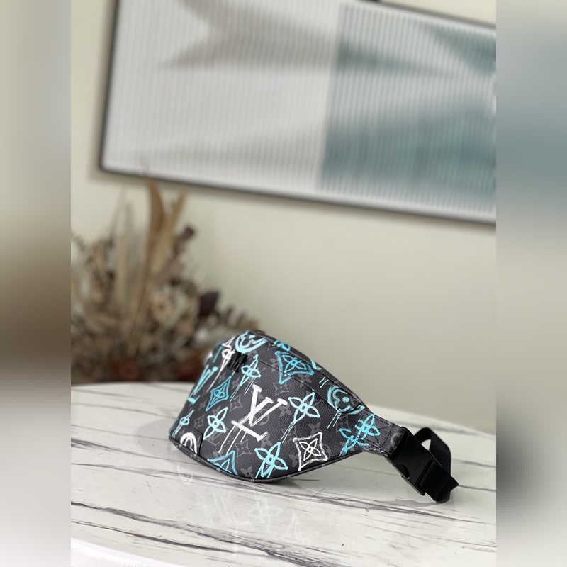 Style: M21397 This waist bag is made of coated canvas, with a graffiti spray effect to show a street attitude. The adjustable belt can also be carried on the shoulder or crossbody, and the front and back zipper pockets are convenient for taking out mobile phones, cards and other small items. Dimensions: 44 x 15 x 9 cm
