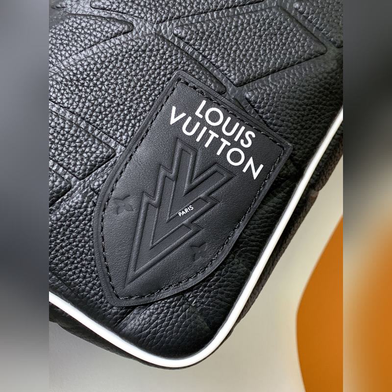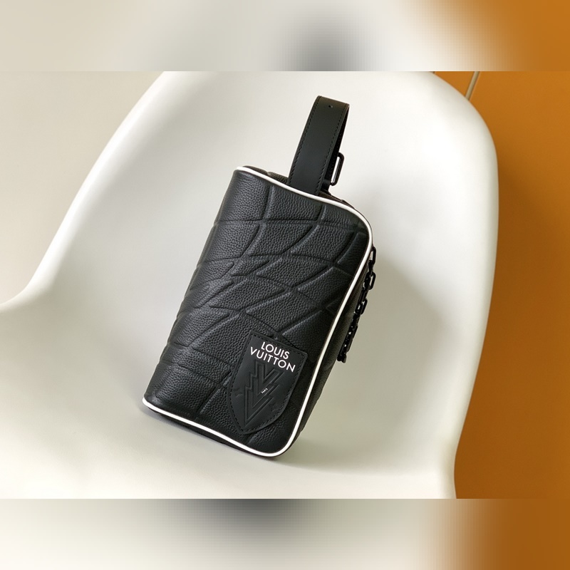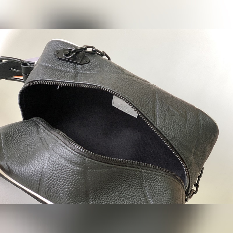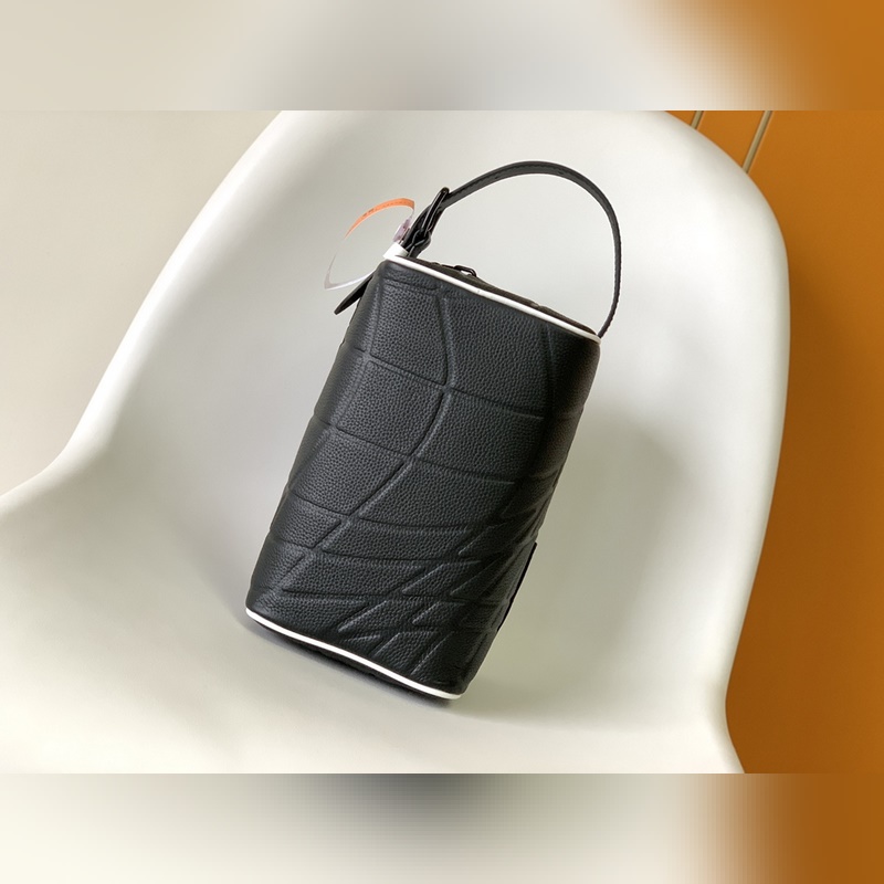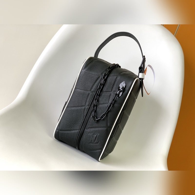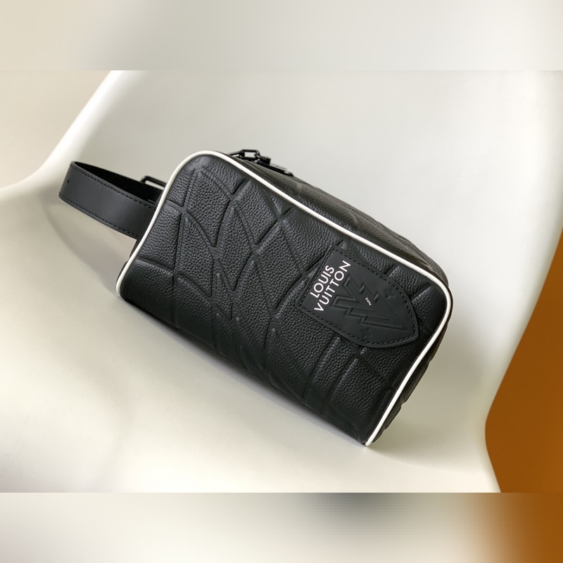 M81849. 2023 World Cup joint series This Dopp Kit toiletry bag is made of Taurillon leather The embossed pattern is reminiscent of a football hitting the net LV label in the same color Adjustable leather handle for easy carrying Size: 15x24x15cm