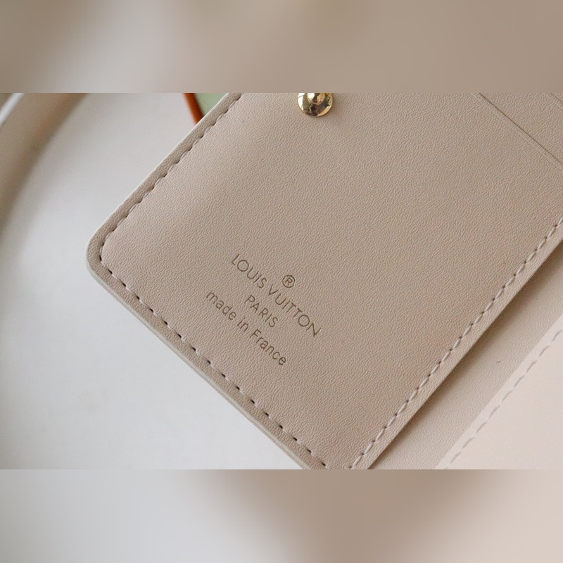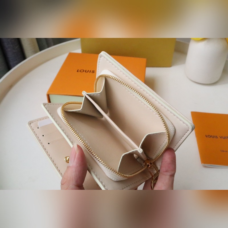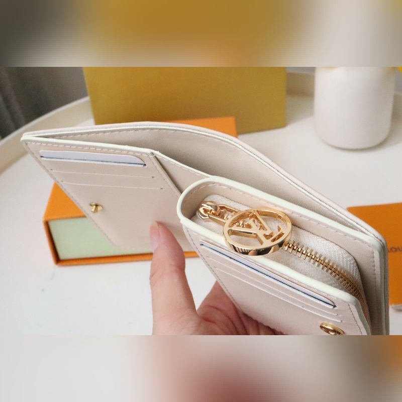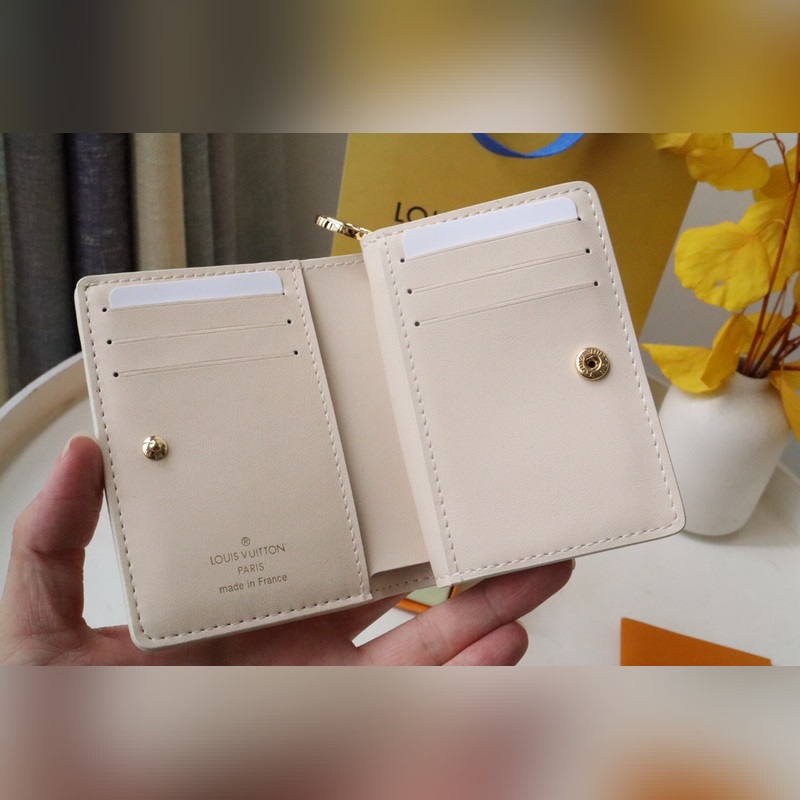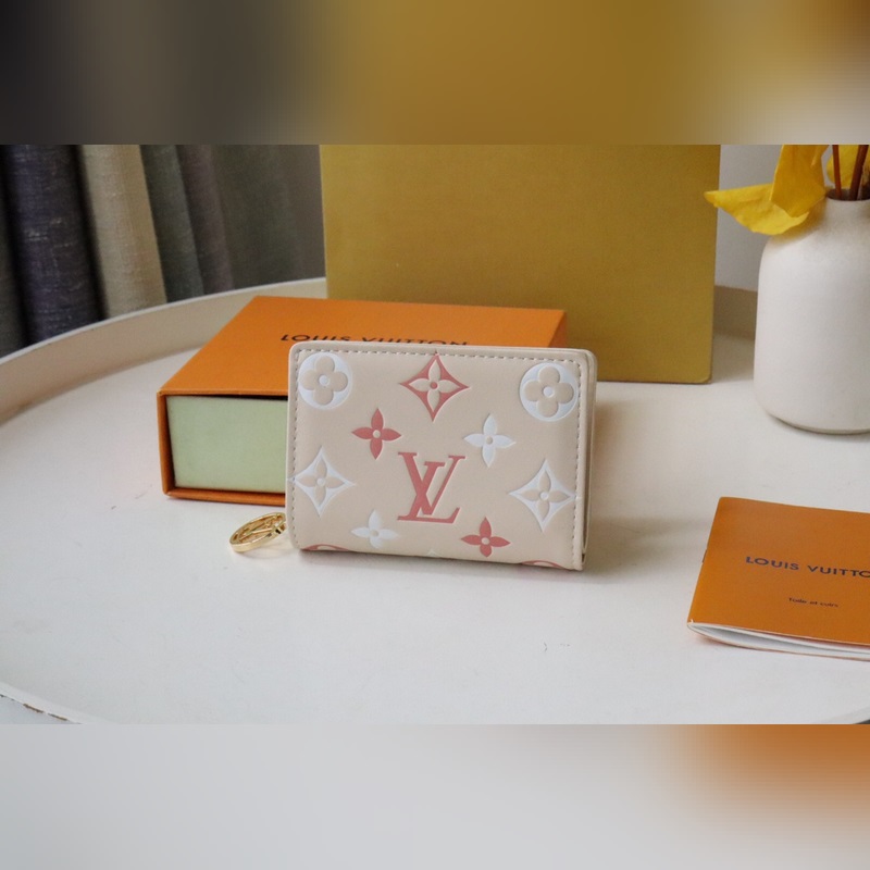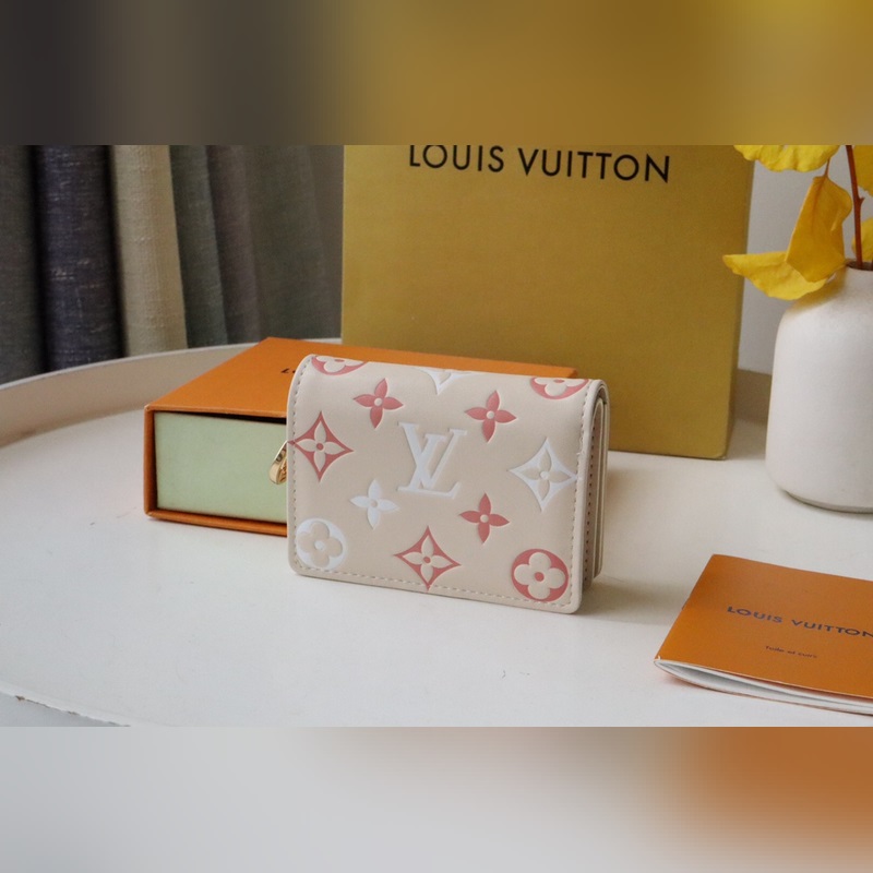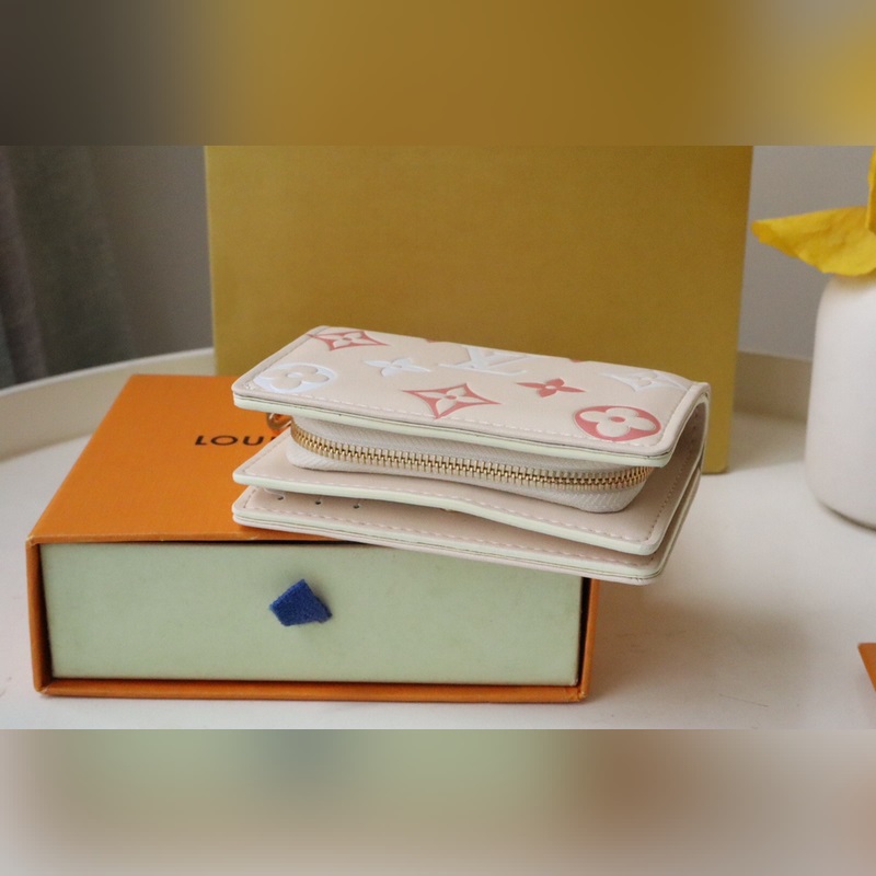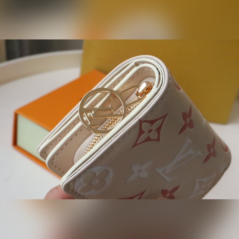 Fluffy lambskin gives the Lou wallet a pillowy feel. Subtle contrasting Monogram Flowers and LVs are embossed and printed on the leather, perfectly complementing the gold zipper. It opens to reveal six card slots, an open compartment for bills, and a zippered, buckled coin pocket.