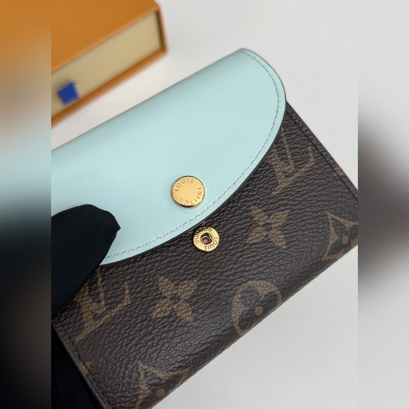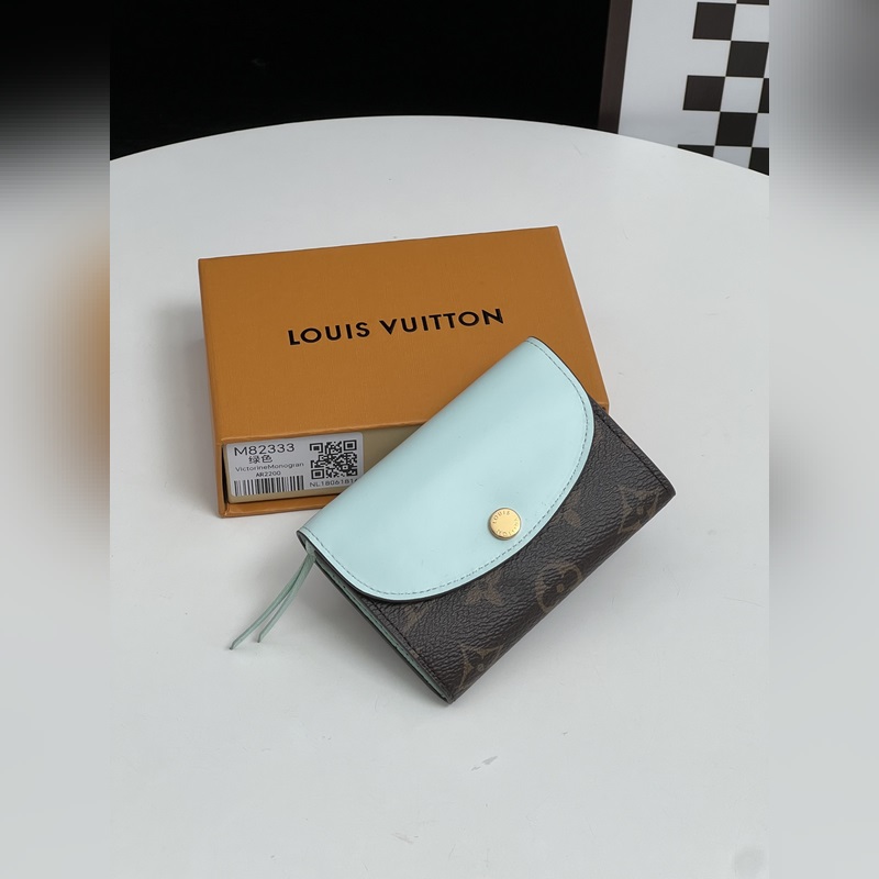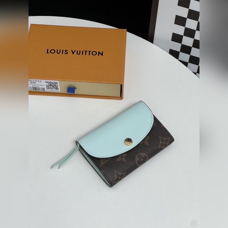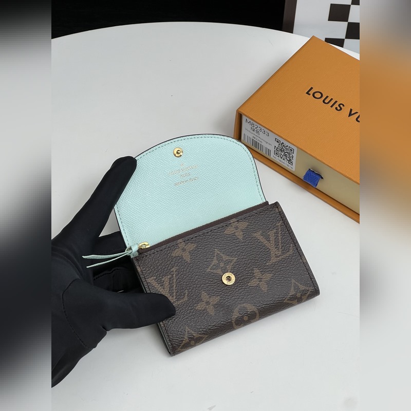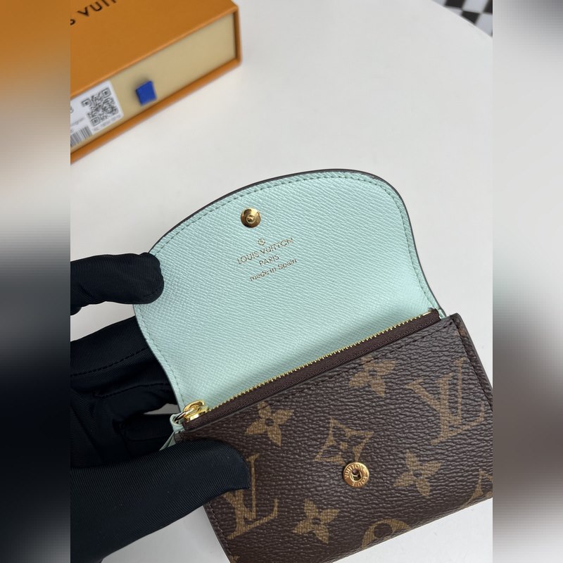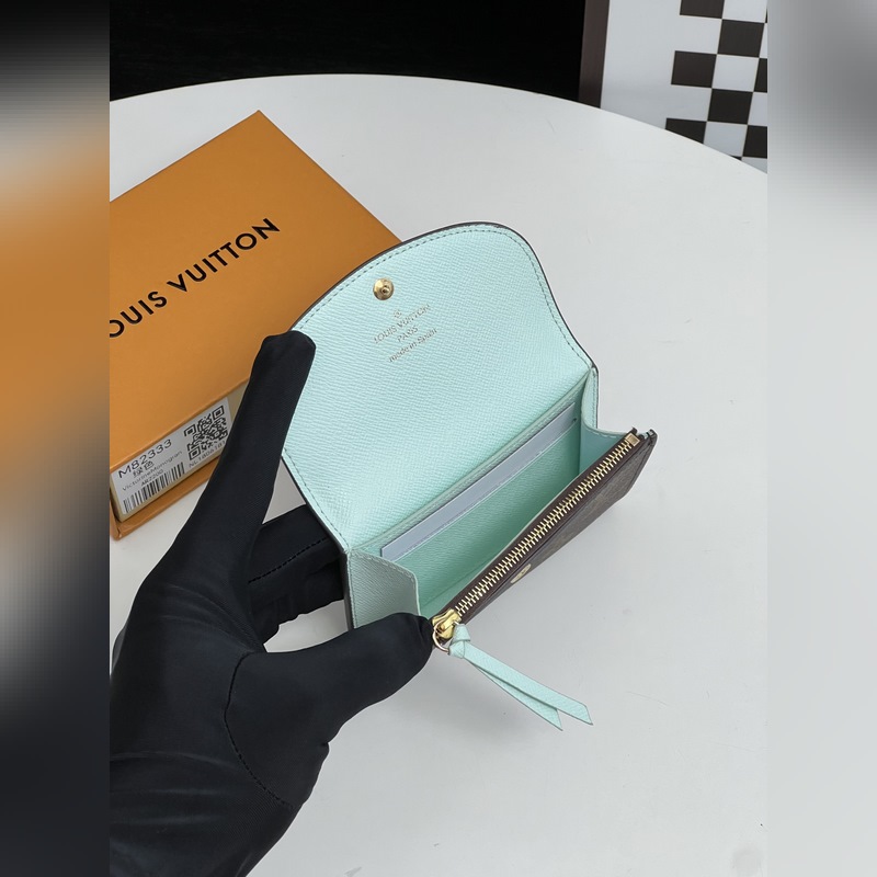 ROSALIE coin purse is made of Monogram and Monogram Reverse canvas. The rounded flap is opened with an inscription snap button. It has an inner patch pocket, a zippered coin pocket, a card compartment and a back patch pocket. Size: 11 x 8 x 2.5cm.