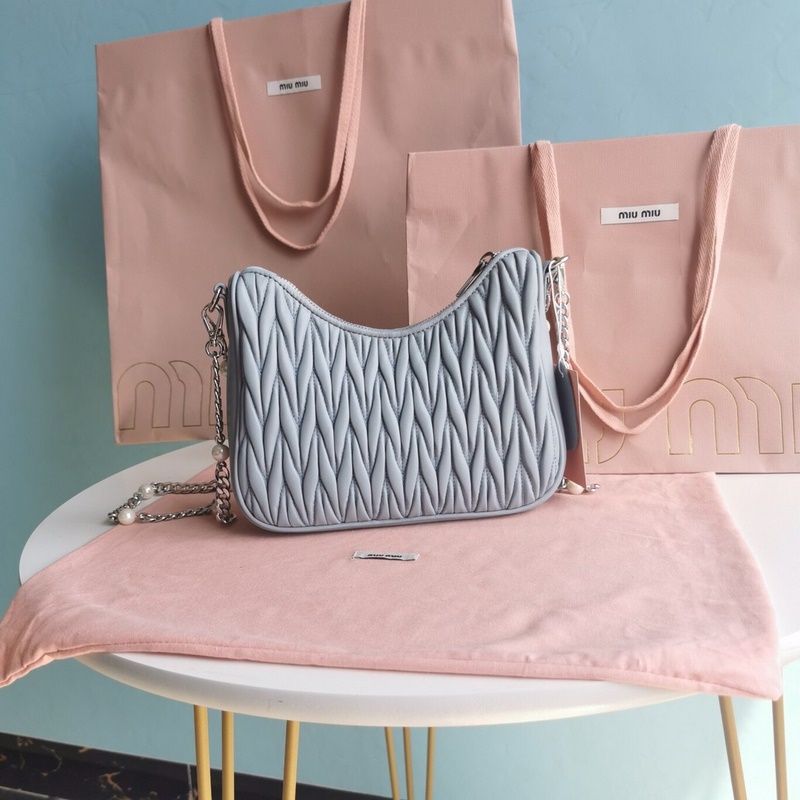 Miumiu crossbody bag. Made of iconic Matelasse embroidered lambskin. The gorgeous shoulder strap with imitation pearl decoration highlights its unique characteristics. The bag design reveals a refined and elegant style. The front is decorated with a metal lettering logo, zipper closure, satin and soft sheepskin pockets. Model number: 5BH211, size: 21*5.5*16.5cm. Packing number: SD96181480