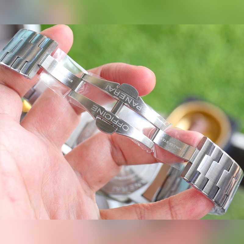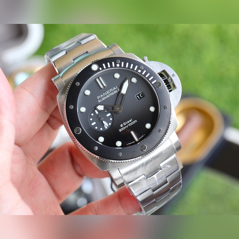 The latest V7 version of Panerai SUBMERSIBLE BMG-TECH ─ 47mm Submersible series metal glass watch is equipped with an imported 2555 fully automatic mechanical movement made of Panerai’s new material BMG-TECH, which has super high toughness and scratch resistance. In addition, the bezel is made of Carbotech material, which has an irregular matte black appearance. Different cutting methods will produce different appearances, and each watch is unique. The black dial inherits the characteristics of the previous LUMINOR1950 series. The round scale and hollow hands are highly recognizable and covered with Suer-LumiNova super luminous coating to ensure that the time information can be clearly read in dark environments. A date display window is set at 3 o’clock.
