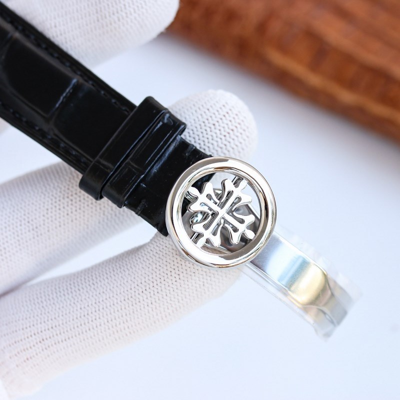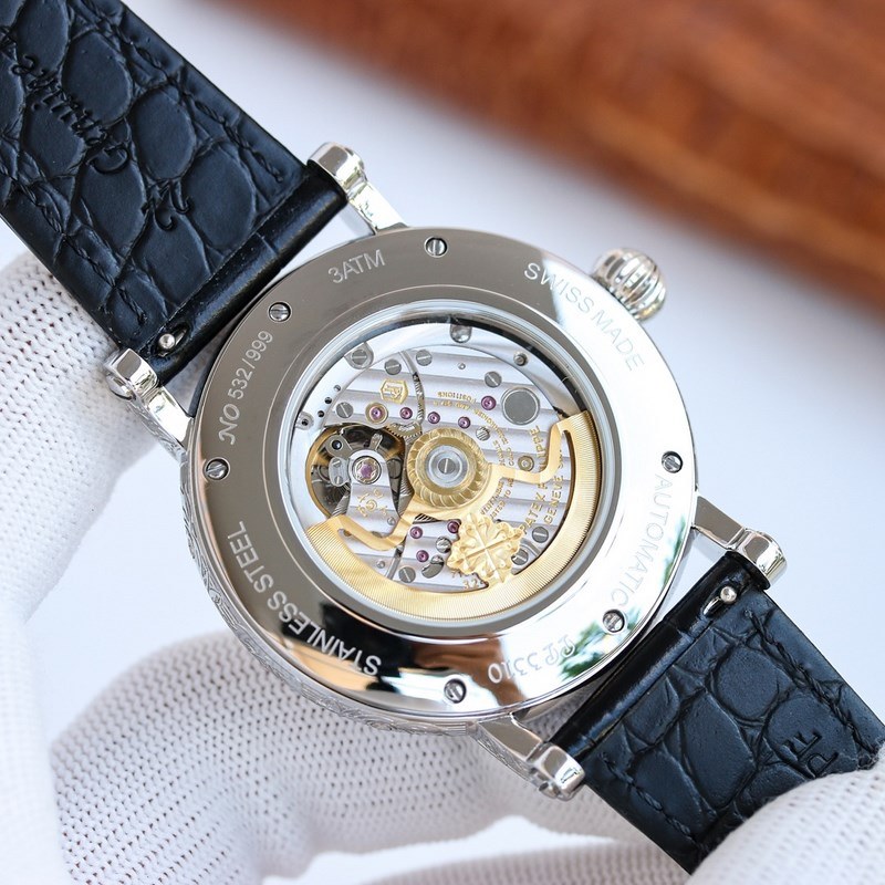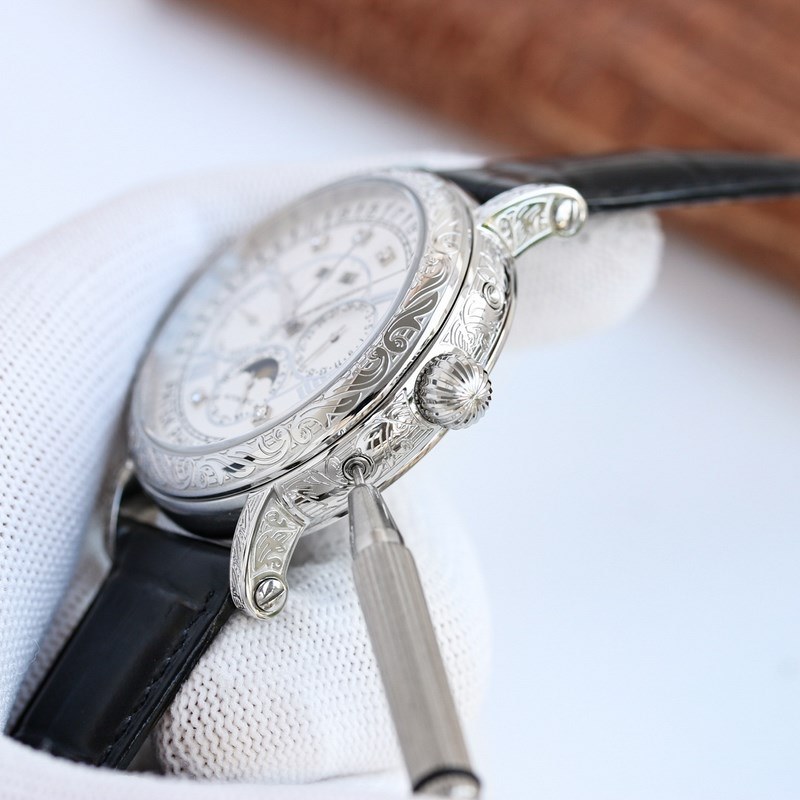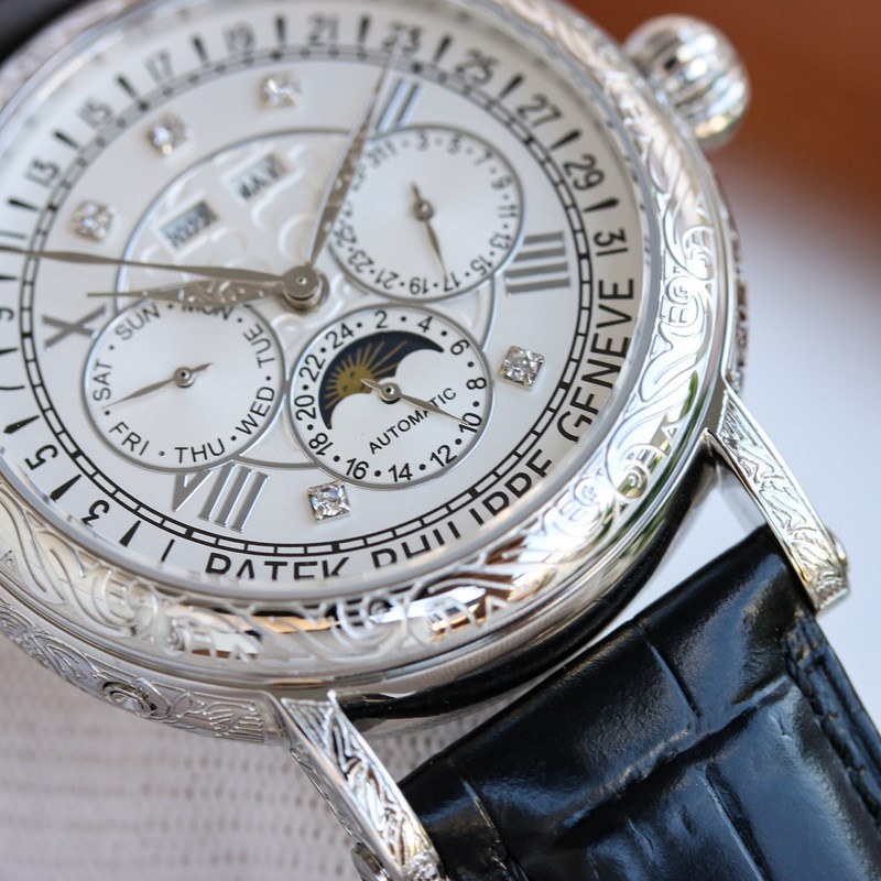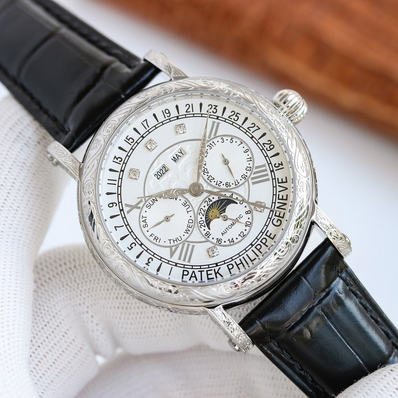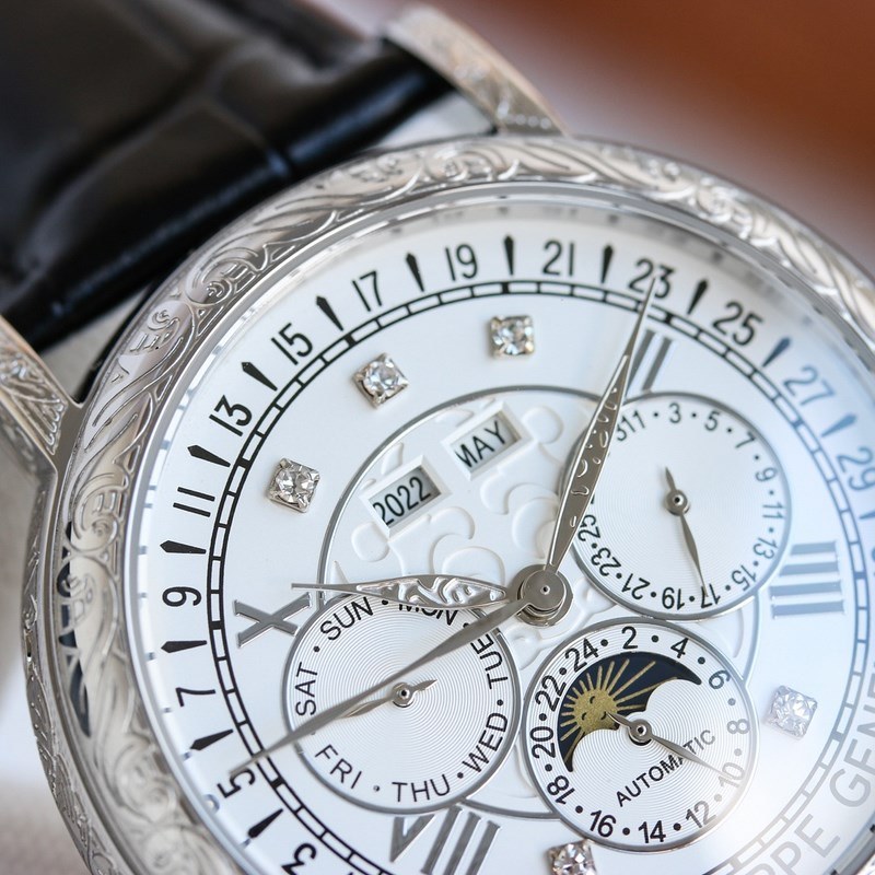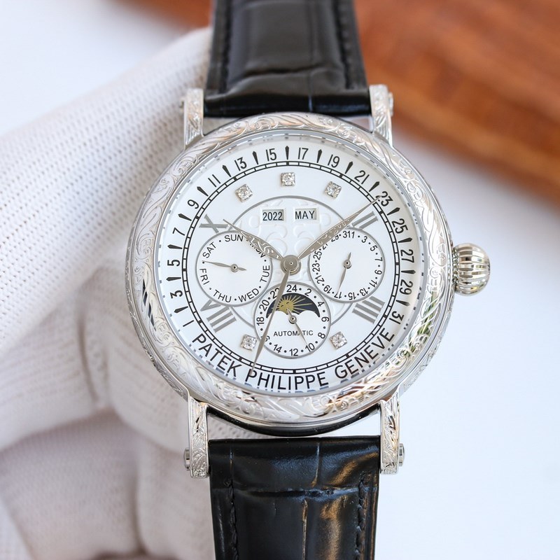 The one-piece stamped double-layer stainless steel carved case pays tribute to the classic design language. The cream-colored dial creates a retro atmosphere. The edge of the dial is engraved with fine minute and second scales, with gold Arabic numerals and five-minute convex round scale nails, which is more three-dimensional. The hour and minute hands are based on the Patton design and are equipped with a long and pointed needle tip. This characteristic shape echoes the hands of the Ref. 1463 chronograph in the 1950s. The moon phase display and date sub-dial are at 6 o’clock on the dial. All the perpetual calendar logos are very good and can be read at a glance. The interior is equipped with a replica 324 S Q automatic winding movement, which is a refined version of the legendary 324 automatic winding movement. The movement bridge is chamfered, the edges are carefully polished, the main plate is decorated with fish scales, and the plywood is decorated with Geneva waves. The surface of the plywood is engraved with gold, the screw grooves are polished and chamfered, and even the drill holes are polished. Paired with a chocolate black cowhide strap, it further brings out the retro atmosphere. Full of classic atmosphere, welcome watch friends to appreciate it