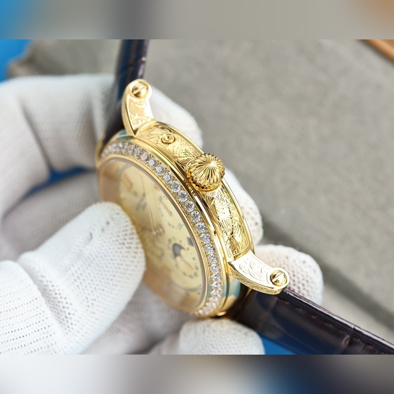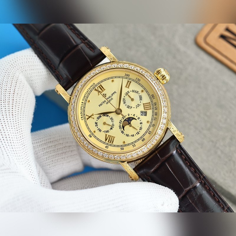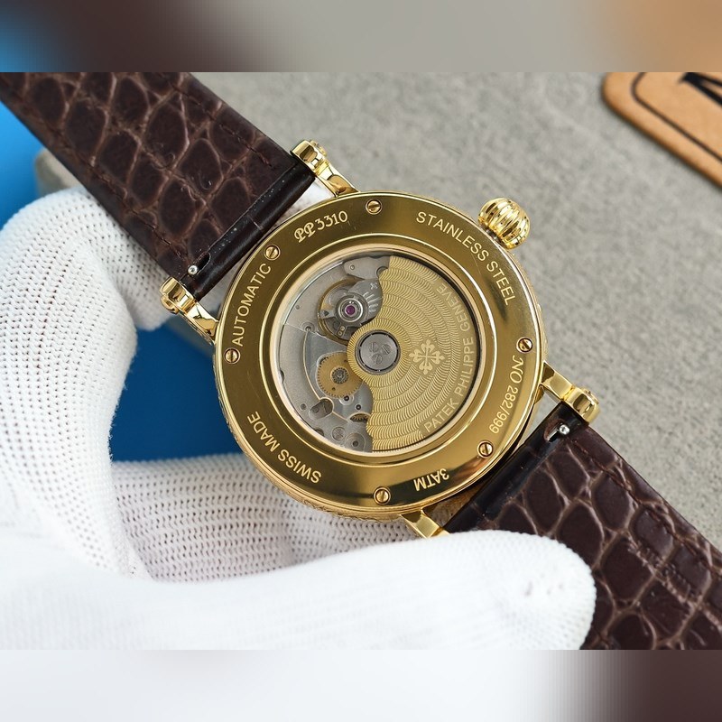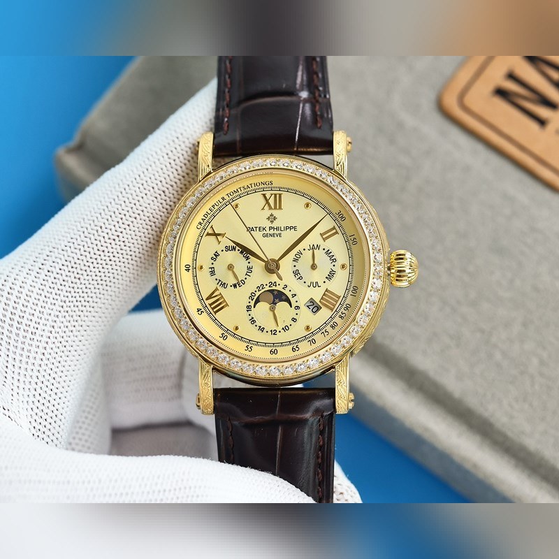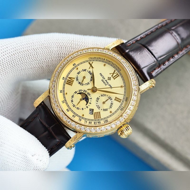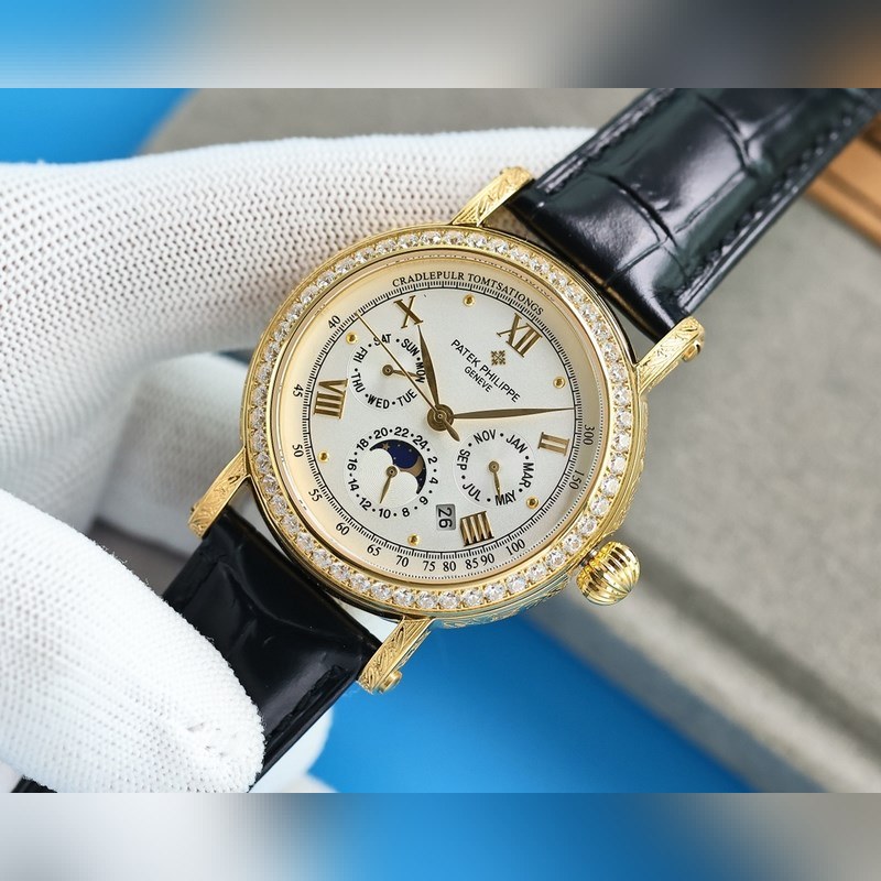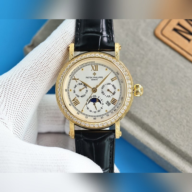 The 42mm watch diameter is suitable for the average male wrist size, very business-like and casual. The entire watch case is hand-carved with patterns, which has a strong visual impact and is unforgettable, and the actual texture is more beautiful. 1 Equipped with imported 9100 multi-function movement (zero repair) function (24 hours, week/star/month) This watch has a power reserve of 38-48 hours. 2 Imported 316L stainless steel, using 18k quality furnace vacuum plating 3 Equipped with an exclusive customized square scale cowhide strap 4 Wear-resistant and scratch-resistant sapphire glass mirror 530 meters daily waterproof rating. Patek Philippe (Patek Philippe) Simple but not simple