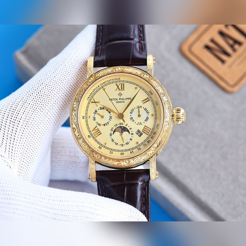 The 42mm watch diameter is suitable for the average male wrist size, which is very business-like and casual. The entire watch case is hand-carved with patterns, which has a strong visual impact and is unforgettable, and the actual texture is more beautiful. 1 Equipped with imported 9100 multi-function movement (zero repair) function (24 hours, week/star/month) This watch has a power reserve of 38-48 hours. 2 Imported 316L stainless steel, using 18k quality furnace vacuum plating 3 Equipped with an exclusive customized square scale leather strap 4 Wear-resistant and scratch-resistant sapphire glass mirror 530 meters daily waterproof rating. Patek Philippe (Patek Philippe) Simple but not simple