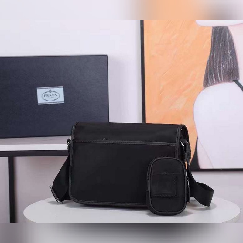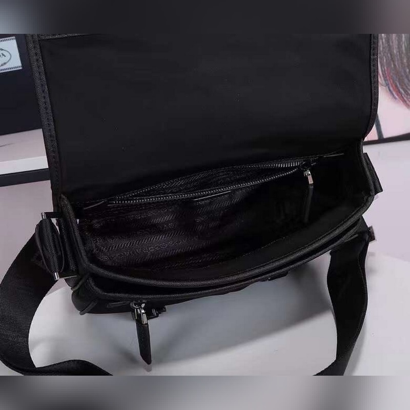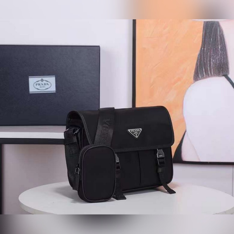 This nylon flap handbag is decorated with classic Saffiano leather trim, with two side buckles and decorated with the iconic triangular metal logo, showing a fashionable design style. It is made of imported nylon and Saffiano leather, two front pockets, one of which is a zippered back zipper pocket, two internal mobile phone pockets, and adjustable nylon logo jacquard shoulder strap. It is a classic and fashionable messenger bag that men love.