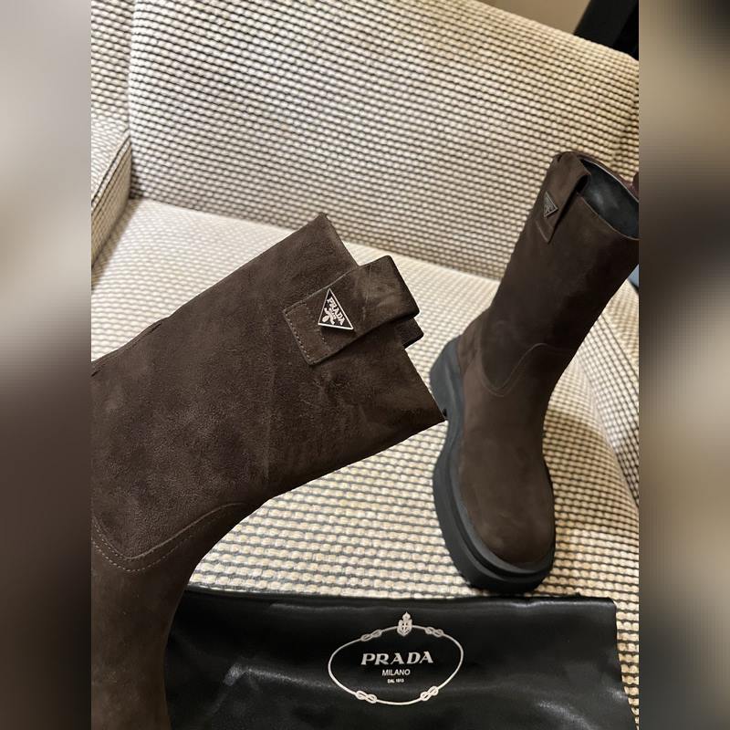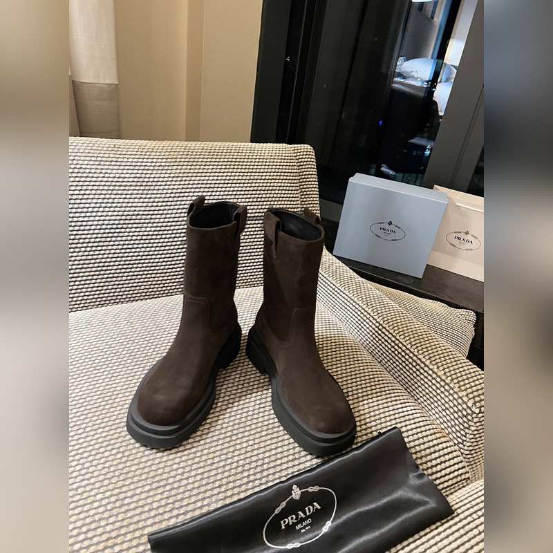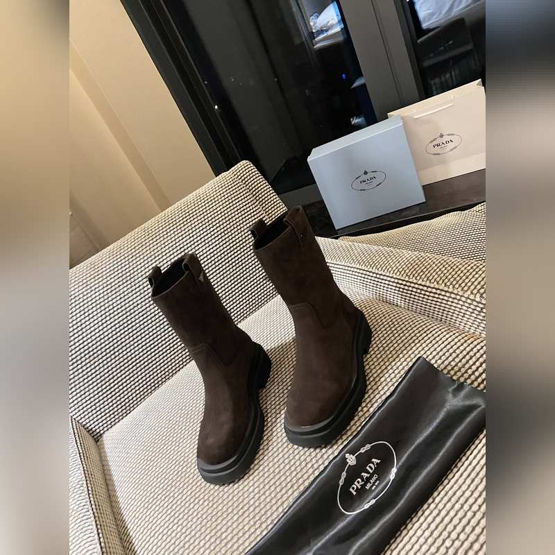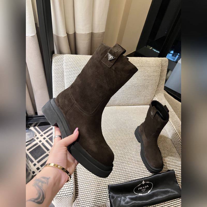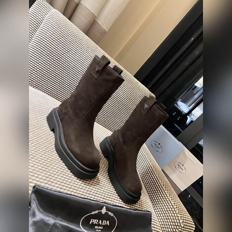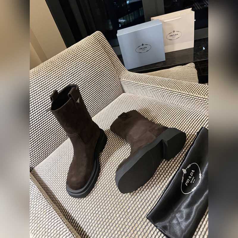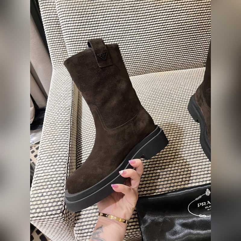 Prada classic triangle logo slip-on boots for women. This series is not available in winter. It is definitely a big hit this year. It is really good-looking. Prada boots are really amazing. They are very stylish and make your legs look thin. The temperament is just right. The whole series uses a variety of imported materials: rubbed waxed calfskin, open-edge pearl cowhide, cow suede with high mercerization, water-dyed sheepskin lining, foam bottom, light and comfortable 35-41