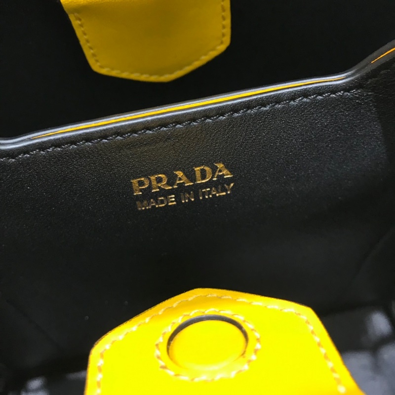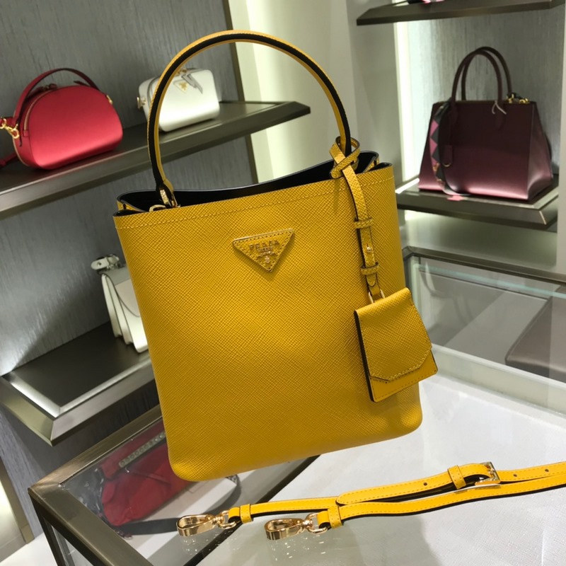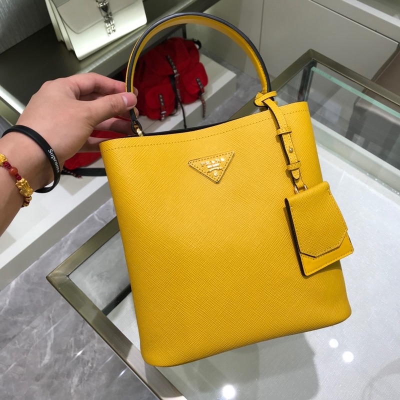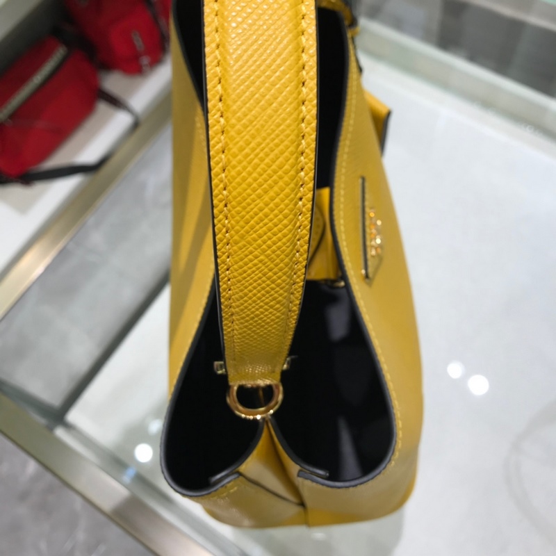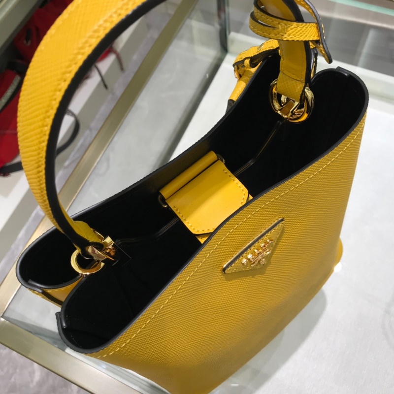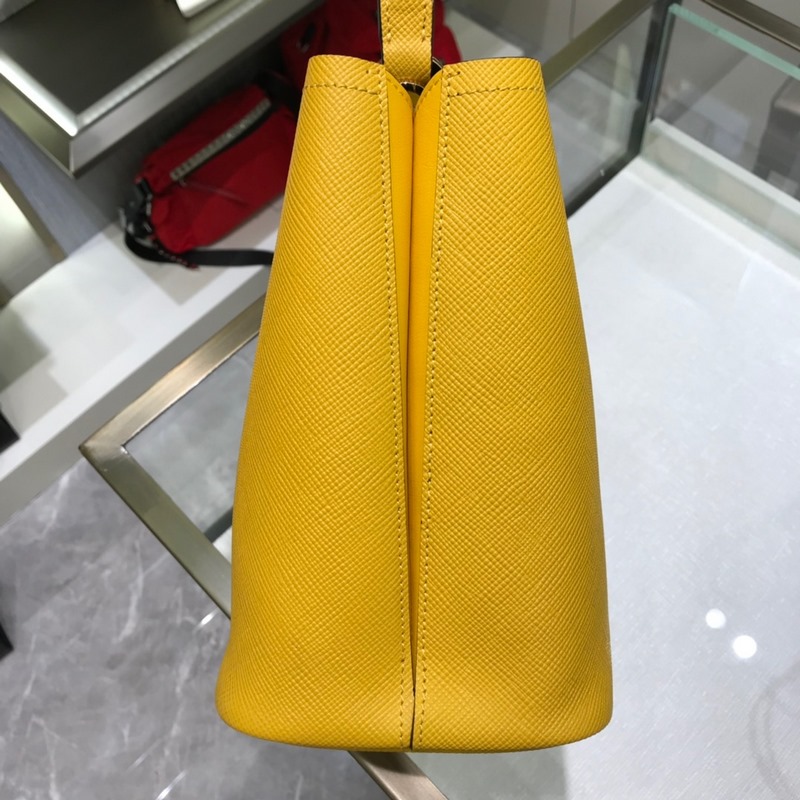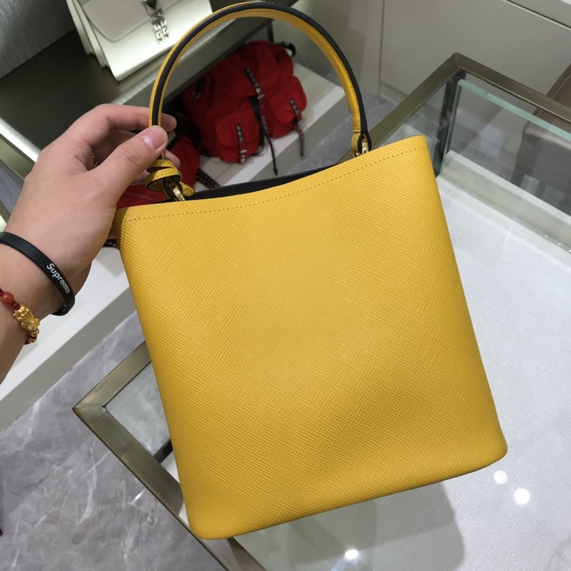 Saffiano cross-grain cowhide gives this Prada bucket bag a unique charm – the shape is not too soft and not lively enough, nor too rigid and lacking in texture. The cross-grain cowhide on the outside is crisp and stylish, and the sheepskin on the inside is soft and delicate. It can be carried by hand, on the shoulder, or across the body. A handbag that perfectly combines classic heritage and the trend of the times. A must-have bucket bag for fairies. Yellow color. Size: 22*23*13cm. No.: SG9618950