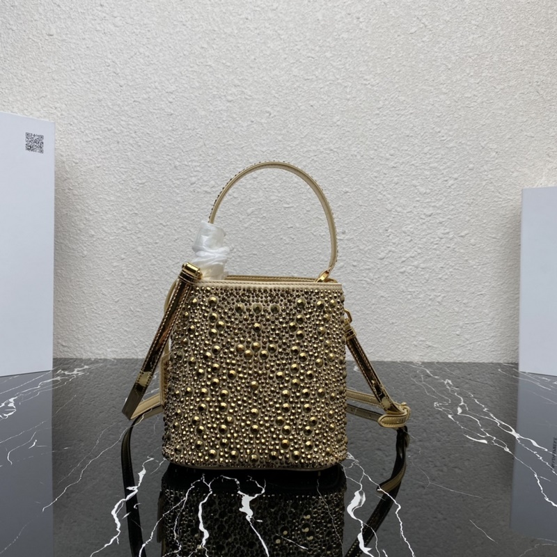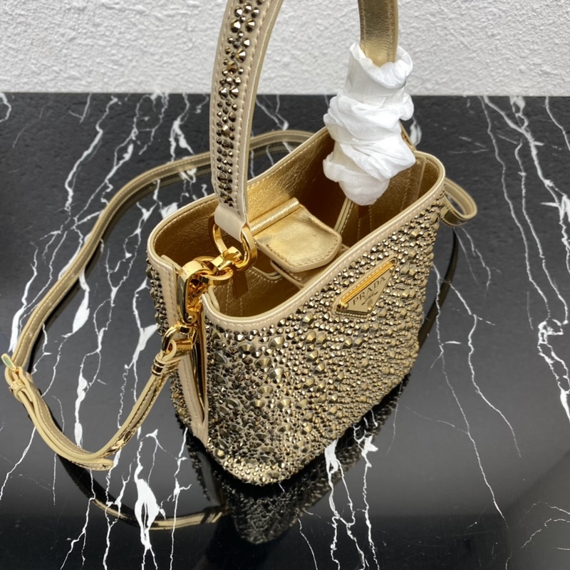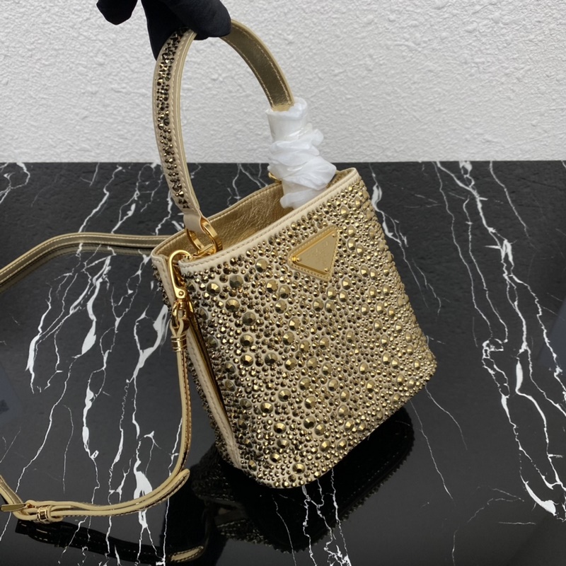 Top original 2023 new style starry bucket bag 1BA373 This elegant Prada Panier handbag is covered with imitation crystals, shining like jewelry. The detachable shoulder strap design is easy to change the shape at will, and the name tag decorated with a metal logo adds a touch of personality. It’s so beautiful. It’s a must-have in winter. If you like it, hurry up and get it. Size: length 15*height 16*width 9.5cm