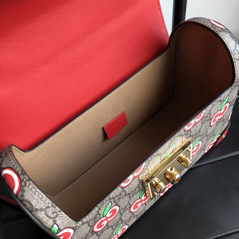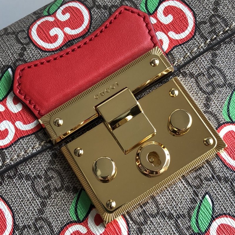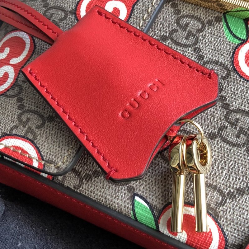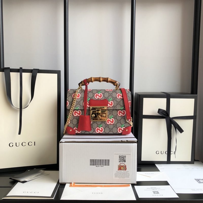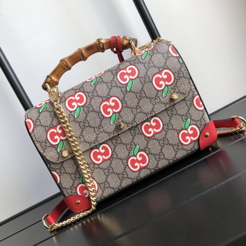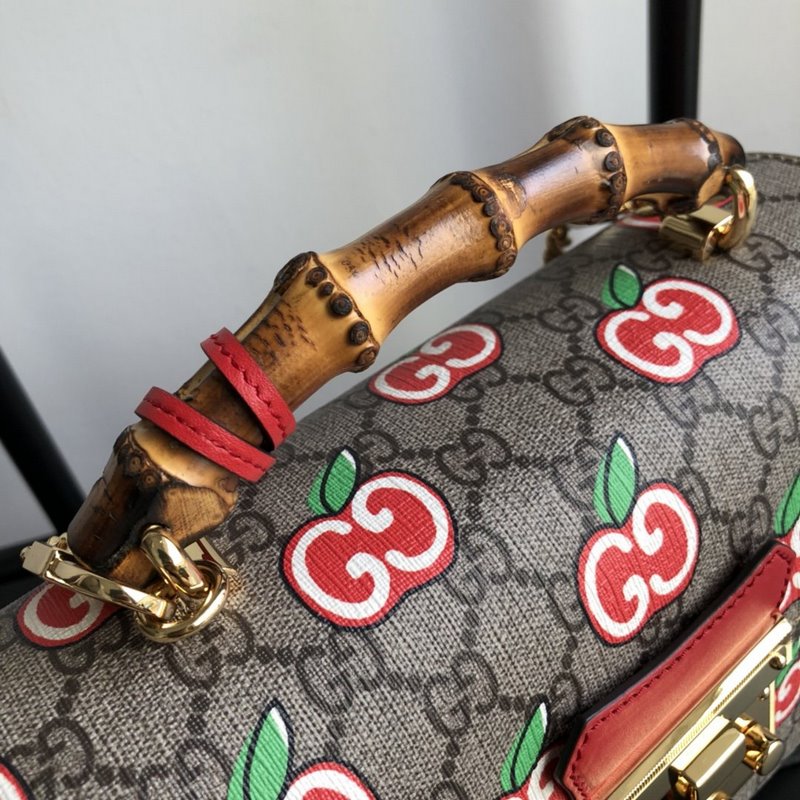The limited edition series for Chinese Valentine’s Day comes with a full set of packaging. This special series of items launched to celebrate Chinese Valentine’s Day incorporates cartoon-style apple patterns and cleverly matches the brand’s double G letter interweaving pattern, showing an interesting design. This small and crisp shoulder bag is equipped with a unique key lock and bamboo handles, creating a distinctive series style. ☆ No.: 603221, the material is made of counter-quality high-grade PVC waterproof material printing and non-fading hardware. Size: 24*17*10cm
