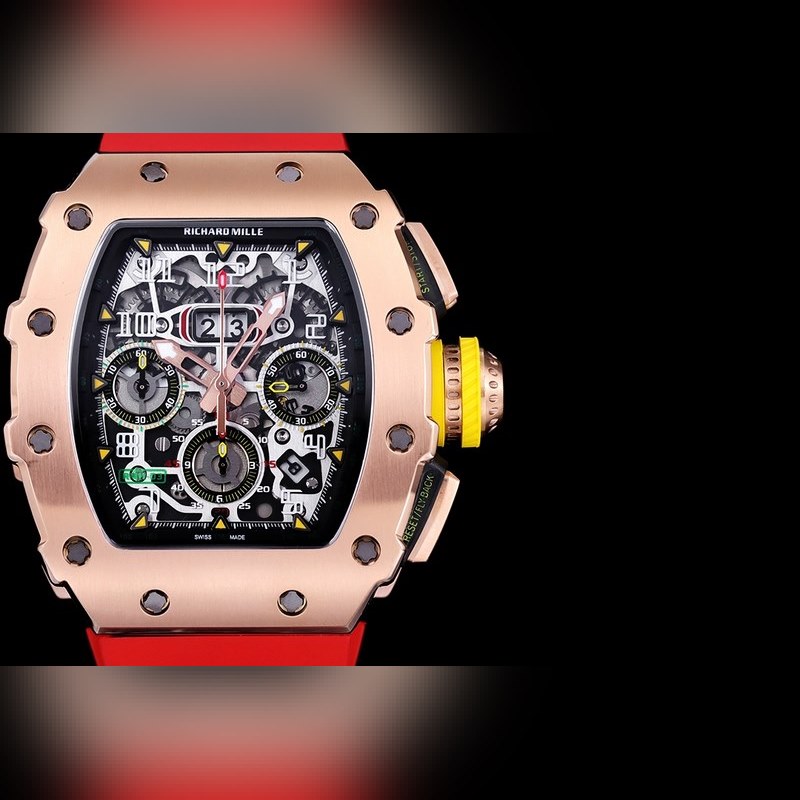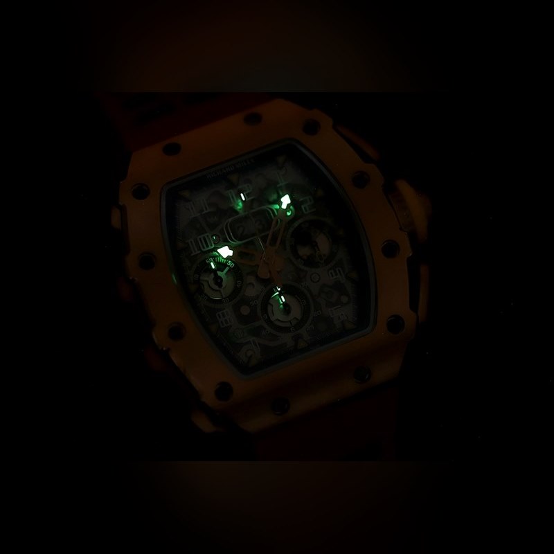 Carbon fiber material restores the original texture High-grade original black ceramic White ceramic restores the original The perfect ergonomic design coincides with the brand’s pursuit of perfection. Every component of the RM 011 is an aesthetic expression of its function. The RM 11-FM watch retains the most recognizable iconic shape, but the craftsmanship used is still far beyond the past. For the case, the titanium style is shown in the picture, but there are also rose gold and titanium versions to choose from, but no matter which one, they all have a finely crafted brushed surface, which is matched with polished chamfers, showing a sharp contrast. Equipped with a 7750 chronograph mechanical movement, clearly marked with functional fonts (Start/Stop and Reset/Fly-back), its design is inspired by the pedals in F1 racing cars. All these optimization changes make this RM 11-FM flyback chronograph automatic watch more sporty and trendy than previous styles.