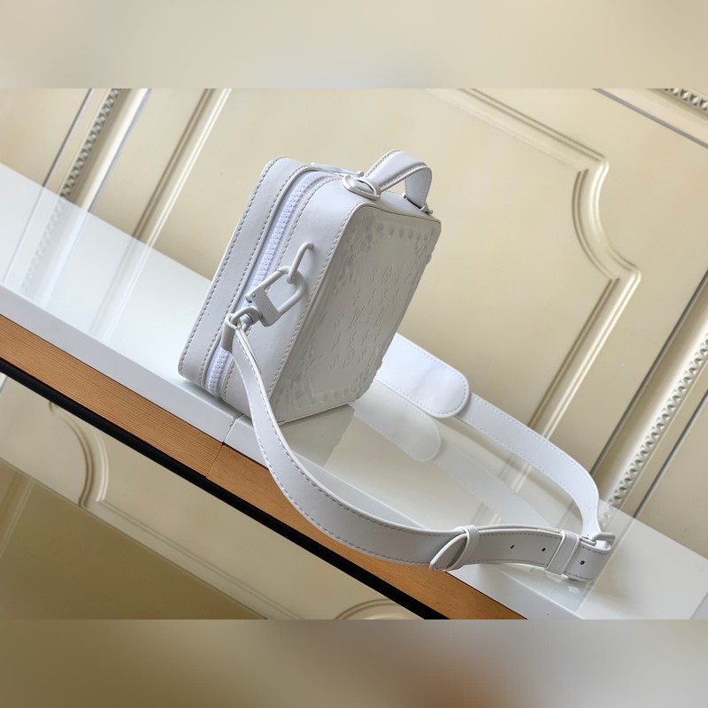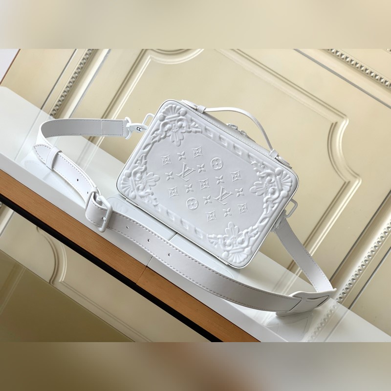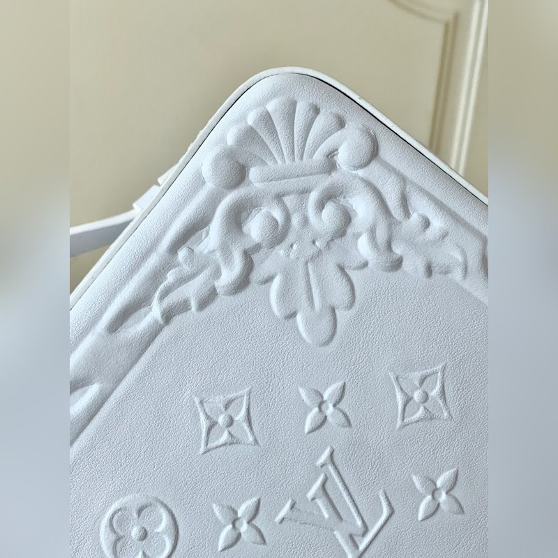 Haiyuan foreign single real home shot M21833 white M44965 black This Handle Soft Trunk handbag comes from the LV Ornaments series, with cowhide embossing to imitate the gorgeous relief of the 18th century French castle. Use the top handle and detachable shoulder strap to explore more creative styling possibilities. 21.5 x 15.0 x 7.0 cm (length x height x width)