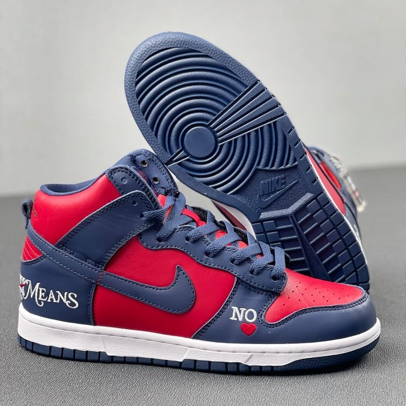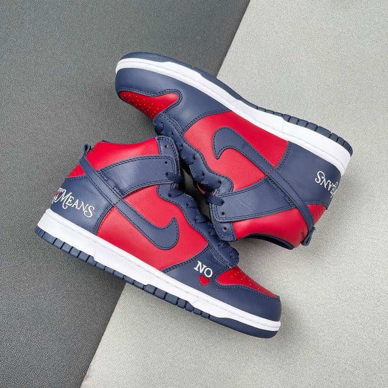 The red and blue uppers are made of red and dark blue leather respectively. The word “NO” and peach heart pattern are embellished on the side of the shoe to add a sweet temperament. The tongue label uses the special word SUP to highlight the co-branded identity.