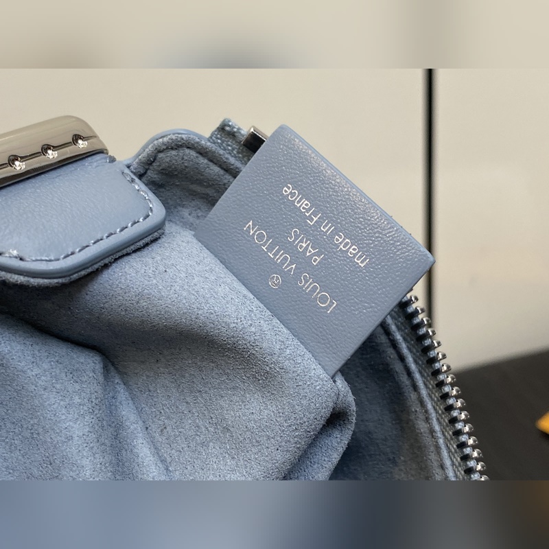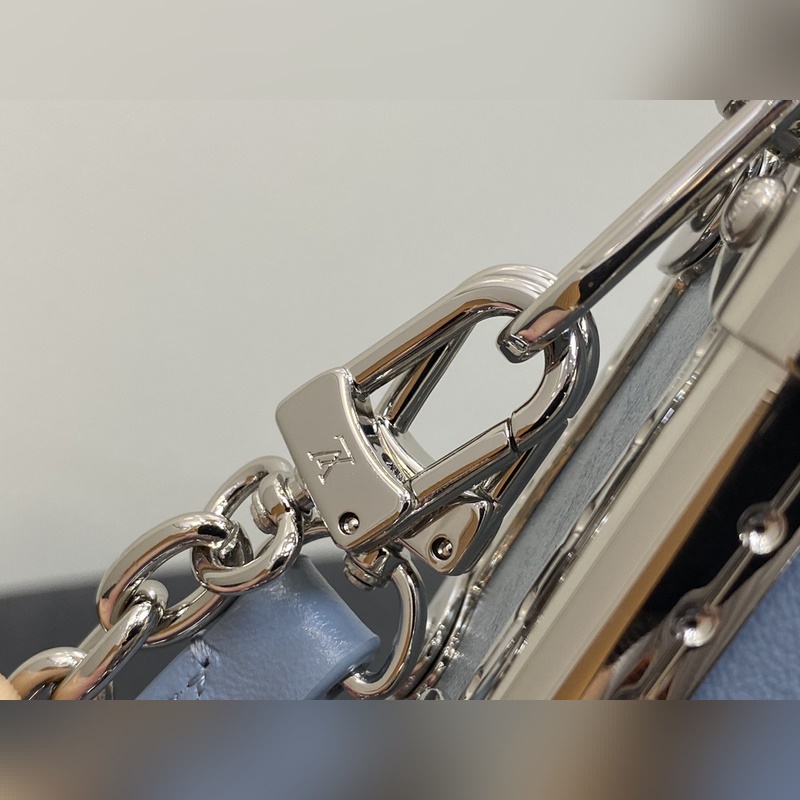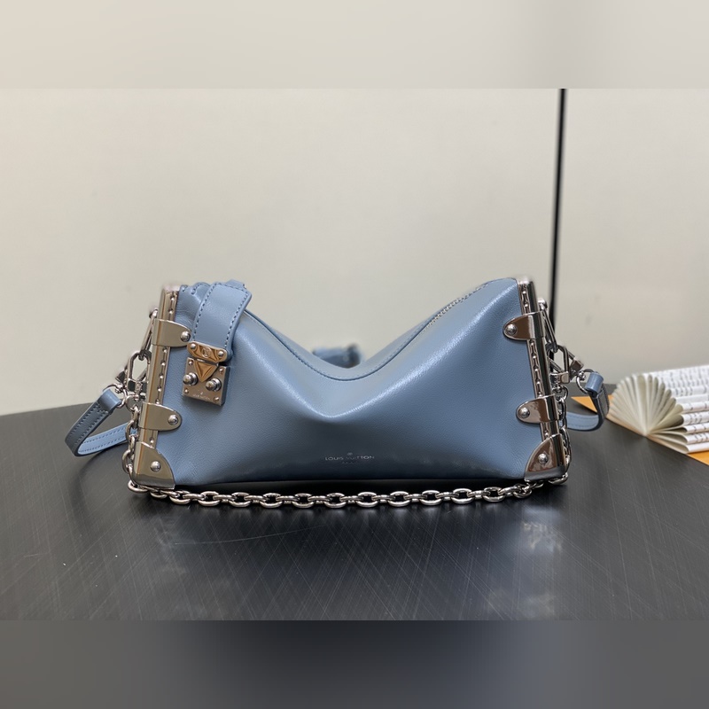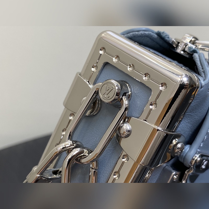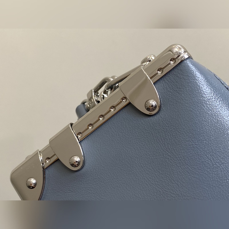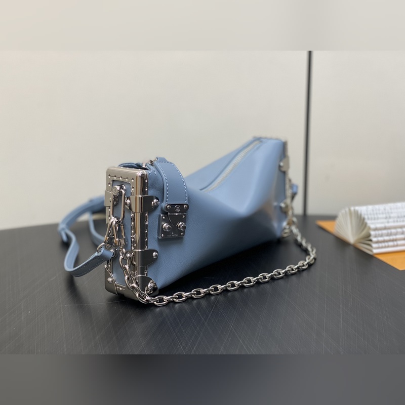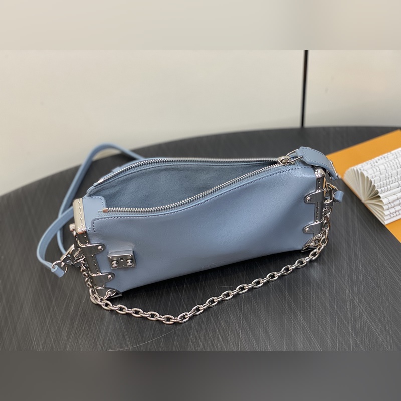 Top original M25445 gray-blue full leather Soft Box Series SLIM TRUNK Handbag This Slim Trunk handbag draws inspiration from Louis Vuitton’s traditional hard cases, integrating rivet frames and metal S-lock buckles into soft cowhide leather, highlighting the avant-garde rock style. The shiny chain and adjustable leather shoulder strap are both detachable, providing a variety of carrying options. Size: 23 x 12 x 4 cm (length x height x width)