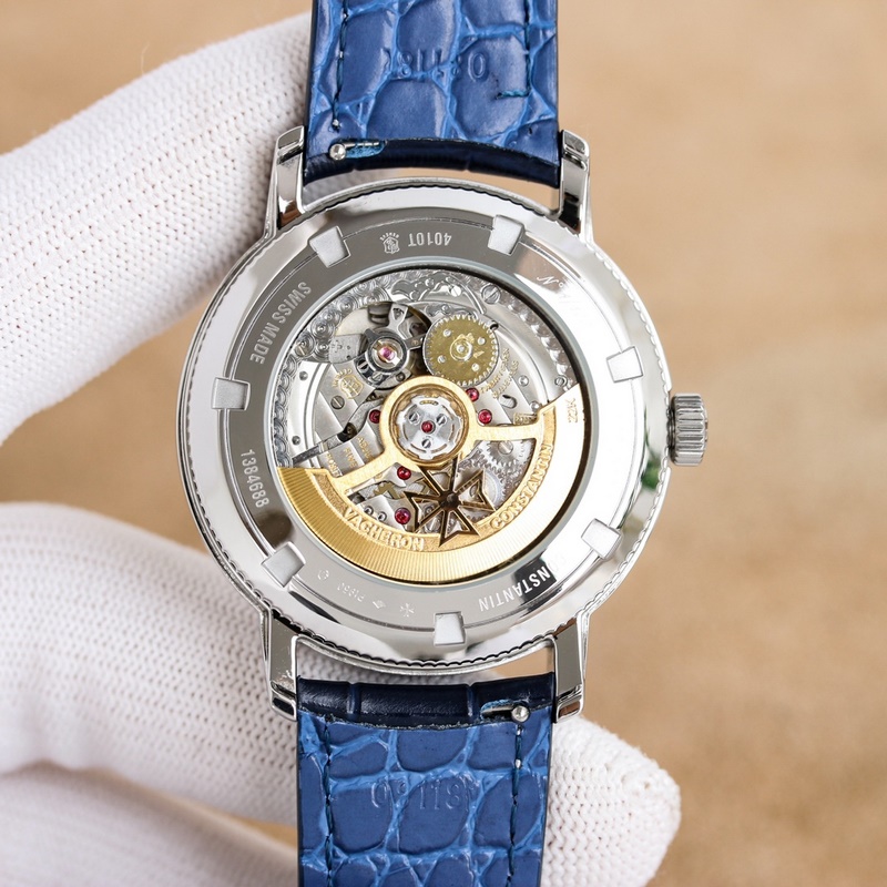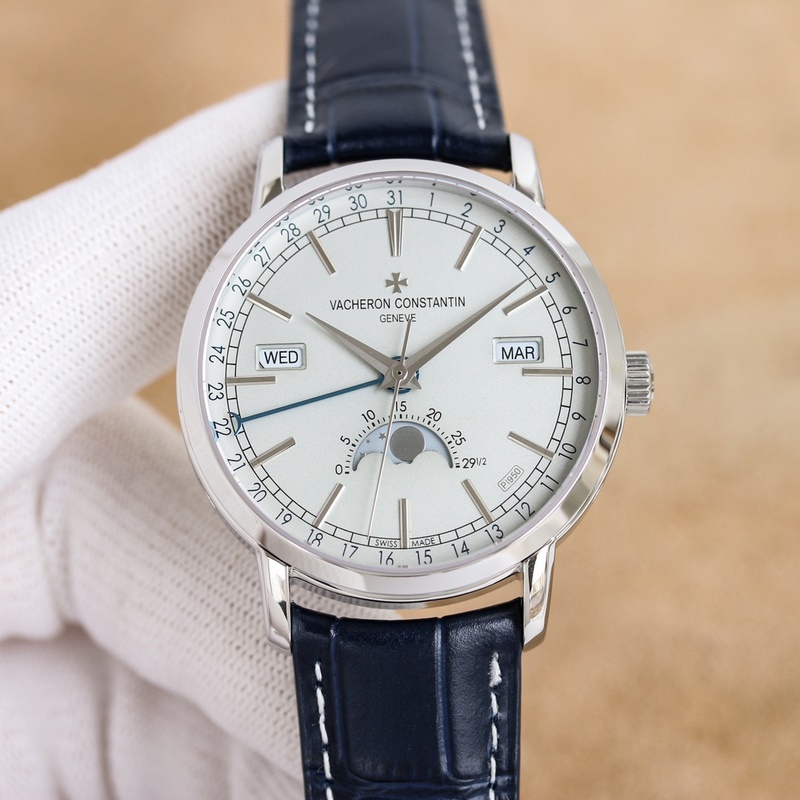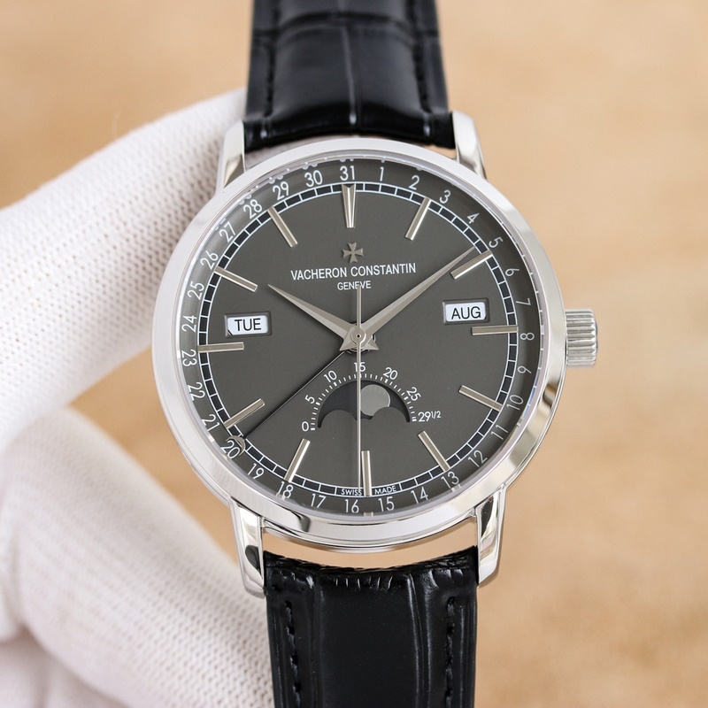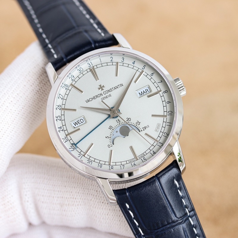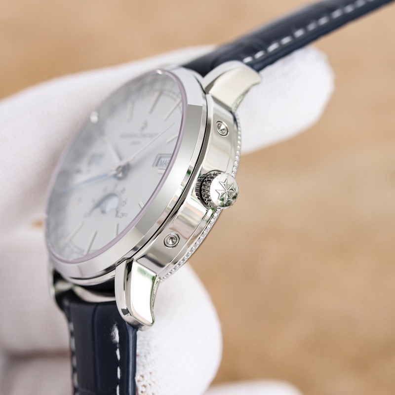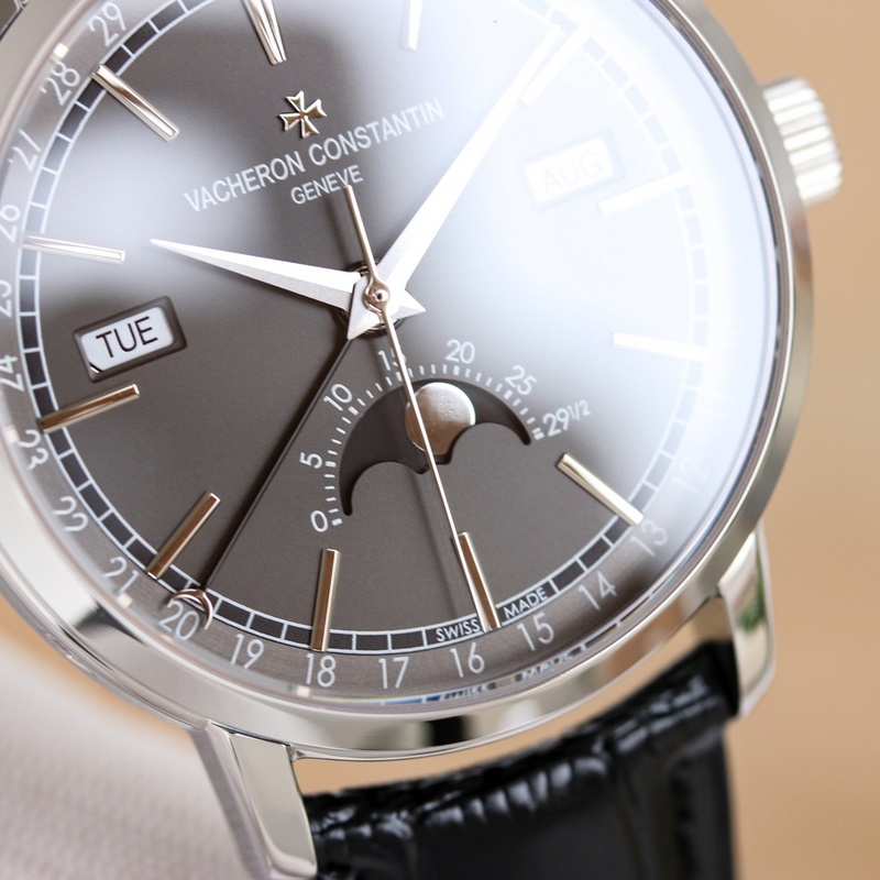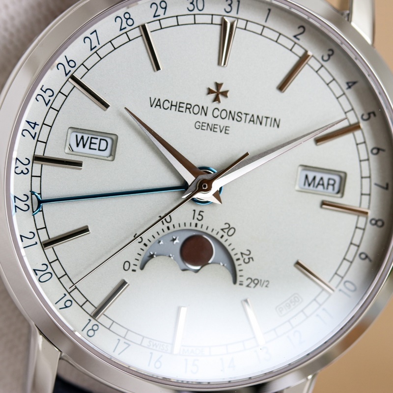 Dial: The track-type minute scale and the toffee-style hour and minute hands retain the original Vacheron Constantin iconic calendar display. The day and month windows are symmetrically distributed on both sides of the dial, and the digital bezel on the outer edge of the dial is the calendar display. It is gently lifted by an elegant black crescent hand for easy reading. The ingenious design breaks the dullness of the dial. This layout clearly shows the precise moon phase display at 6 o’clock. While showing the smart charm, it also shows the unique beauty of complex machinery.