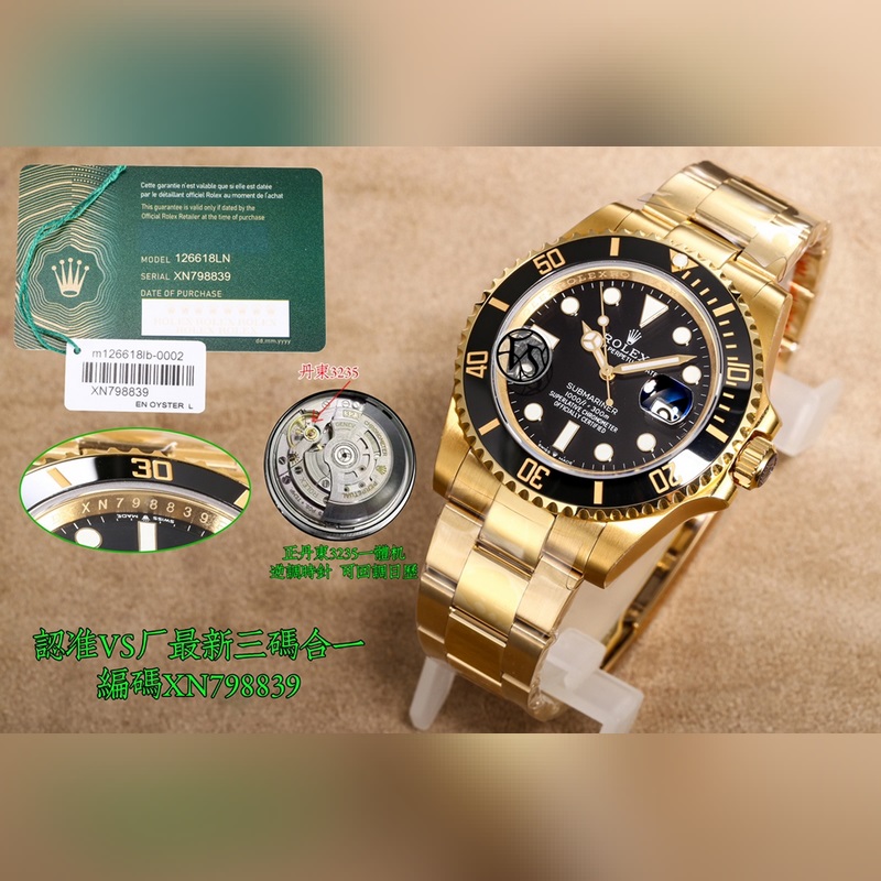 VS factory produces the latest limited edition high version 2025 latest model launched four codes in one with NFC induction card with pictures and truth, MK1 can watch video. Reverse hour hand, can call back calendar, perfect match. The latest Rolex ROLEX Submariner series has a crown at the 6 o’clock position, which is more upscale. The real 41mm size is consistent with the original, the 4 corner lugs are smaller, and the strap and clasp are widened to a real diameter of 41. A crown logo is added in the middle of the SWISS MADE words at 6 o’clock on the dial, and the ceramic bezel uses platinum scales that are not easy to fade. The perfect version of the C-bezel green Submariner is worth owning. The owner strongly recommends this style. The quantity of this batch is limited. Order quickly and act handsomely. It is equipped with a high-version substitute-grade C-bezel on the market. The entire ceramic bezel has been reborn and fired according to a new formula and temperature. The color is no different from the original to the naked eye, and it completely crushes the ordinary version on the market. The original Cal.3235 integrated movement is cloned, the calendar can be adjusted back, the hour hand can be reversed, and it is consistent with the original version. The highlights are as follows: 1. The entire series is equipped with the real-level Clean factory green ceramic bezel, and the composition of the original Cerachrom ceramic outer bezel is fully analyzed. The technology of nano-alloy coloring and agent ceramic coloring wrapped with silicon dioxide is finally determined to be fired at around 1200 degrees Celsius through attempts at different temperatures. The factory’s many years of experience in manufacturing and the hard work of many engineers finally presented everyone with a hall-level green bezel. It is difficult for professionals to distinguish the authenticity with the naked eye, which completely crushes all current versions on the market. The bezel is more than 95% the same as the original, so there is no difference. There is color difference when you compare two original green ghosts together. In addition, the scale on the bezel does not turn black. The scale on the bezel uses physical vapor deposition technology to coat platinum powder on the font at high temperature to make the font color durable and will not fade or turn black when exposed to water or oil. 2: Change the 4 beads inside the rotating tooth ring to the same round beads as the original, and the bezel will make a crisp sound when turning. 3: Imported sapphire glass is highly transparent and wear-resistant. The most important thing is that the height of the glass is the same as the original, and is several C higher than the ceramic ring. To the naked eye, it seems to be in a horizontal line with the ceramic ring. 4: There is a gap between the watch mirror and the ceramic ring, which is exactly the same as the original, with no difference. 5: The luminous stone of the round nails on the literal scale is full but not overflowing, and it shows ice-blue luminescence in a dark environment. The edge of the scale is finely polished and as smooth as the original, unlike ordinary goods on the market. The scales at 6, 9, and 12 o’clock are not polished and have edges and corners. The printing correction of the fake font is consistent with the original. 6: The watch hand is a solid central axis like the original, no longer a fake hollow axis. 7: The case size and thickness are consistent with the original. The quantity is limited. Order quickly and act handsome. Real outdoor shots, no P-pictures, better physical texture. Concentration is an attitude. Please look for the unique packaging and unique numbering of VS factory. XN798839, button code F80, F80, the latest code, correct code, with 3235 all-in-one machine, reverse hour hand, can call back calendar, quality assurance, please look for CW factory clean exclusive quality