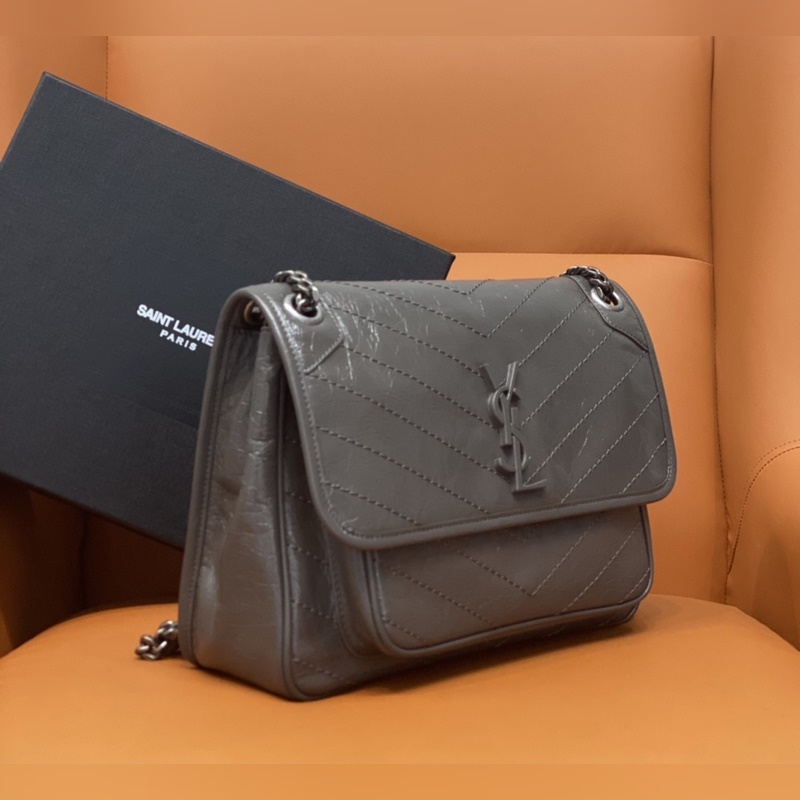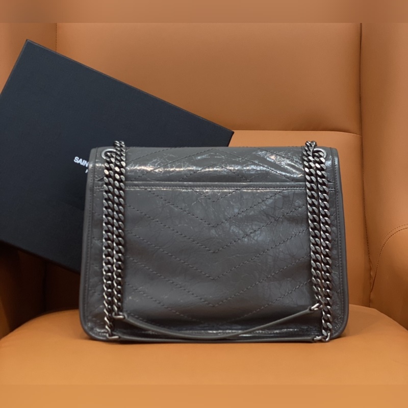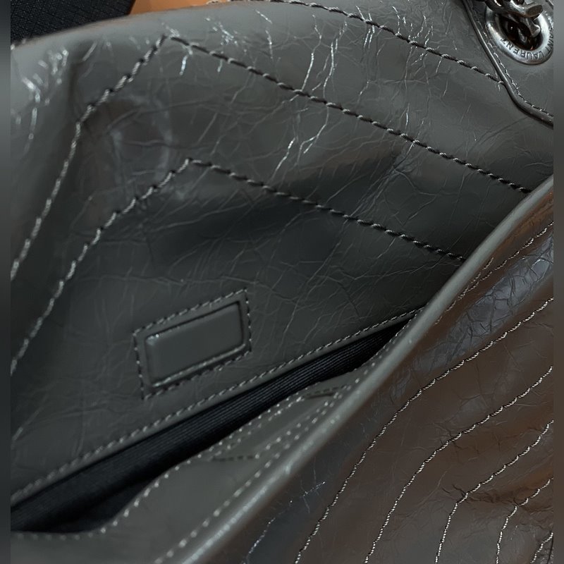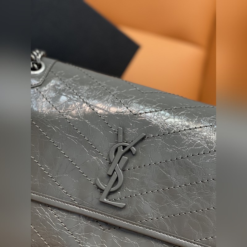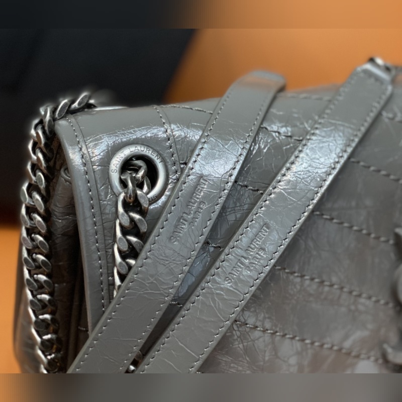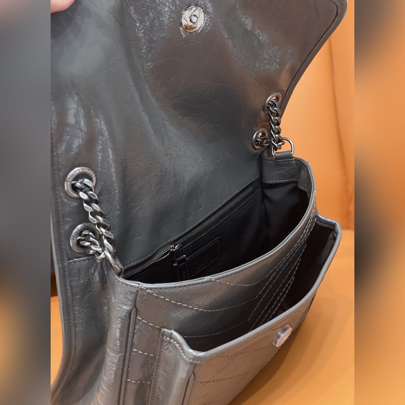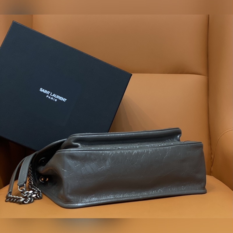 Authentic YSL counter latest upgraded version 498894D# dark gray with leather-covered YS* logo, brushed vintage silver hardware with leather reinforced shoulder strap chain that can be used as a shoulder or crossbody Grosgrain lining, magnetic snap closure design Interior: one main compartment, one open pocket, one zipper pocket and one flap pocket, exterior: one magnetic back pocket Size: 28 X 20 X 8,5 CM Factory equipped with gift box