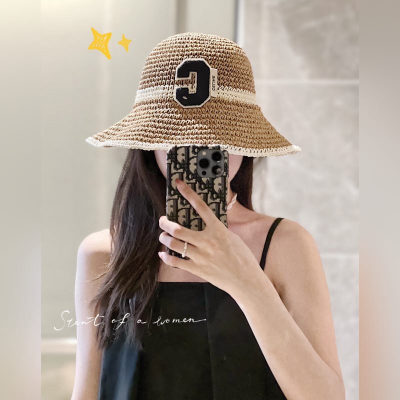 CELINE 2023 Color-Block Foldable Straw Bucket Hat with Dust Bag